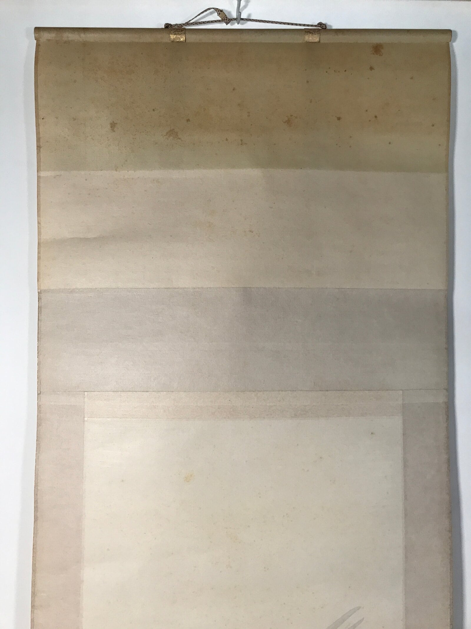 - Good condition considering its age. Stains on image. Stains on the top left of the scroll. Some creasing. Some stains on box. Wear and tear due to age. Please see the photos.