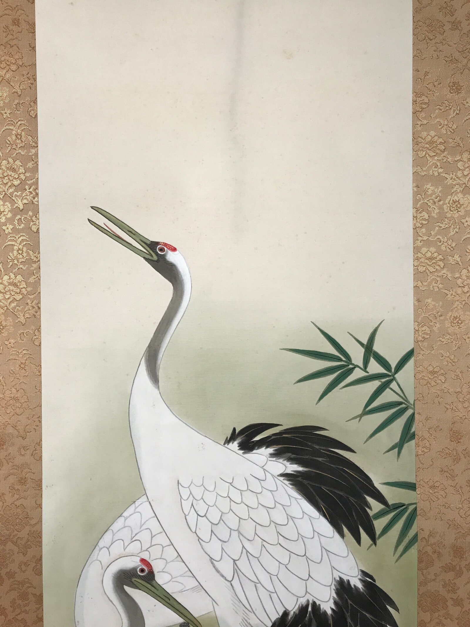 January 24, 2026Japanese Boxed Hanging Scroll Vtg Kakejiku Two Cranes Bamboo Green Color KJ151