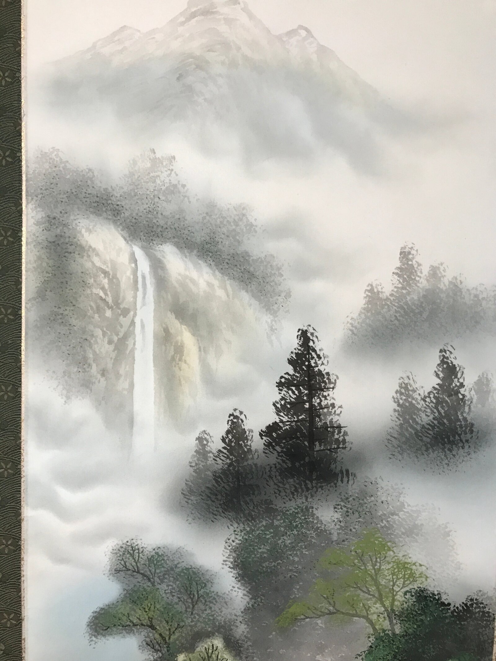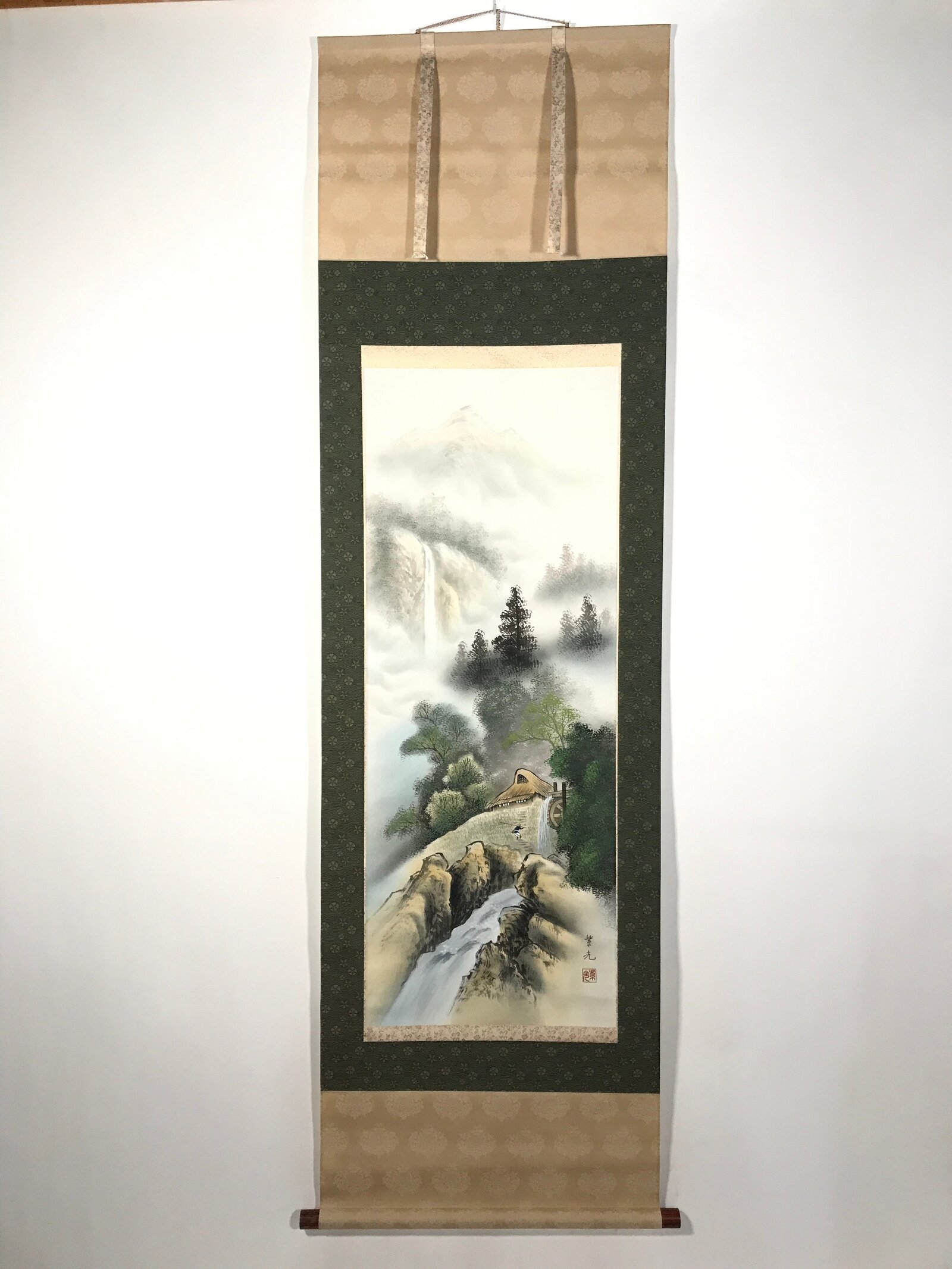 This vintage Japanese boxed hanging scroll (called kakejiku or makimono) features a landscape scenery in the mountains. There is a high waterfall in the background, and a water mill close to a traditional house in the foreground. Trees are also painted. This type of kakejiku is called sansui, literally mountains and water. It is painted in color, mostly green, brown, and blue. This piece is signed with a name and a red seal. The box has inscriptions on the outside and the inside of the lid.