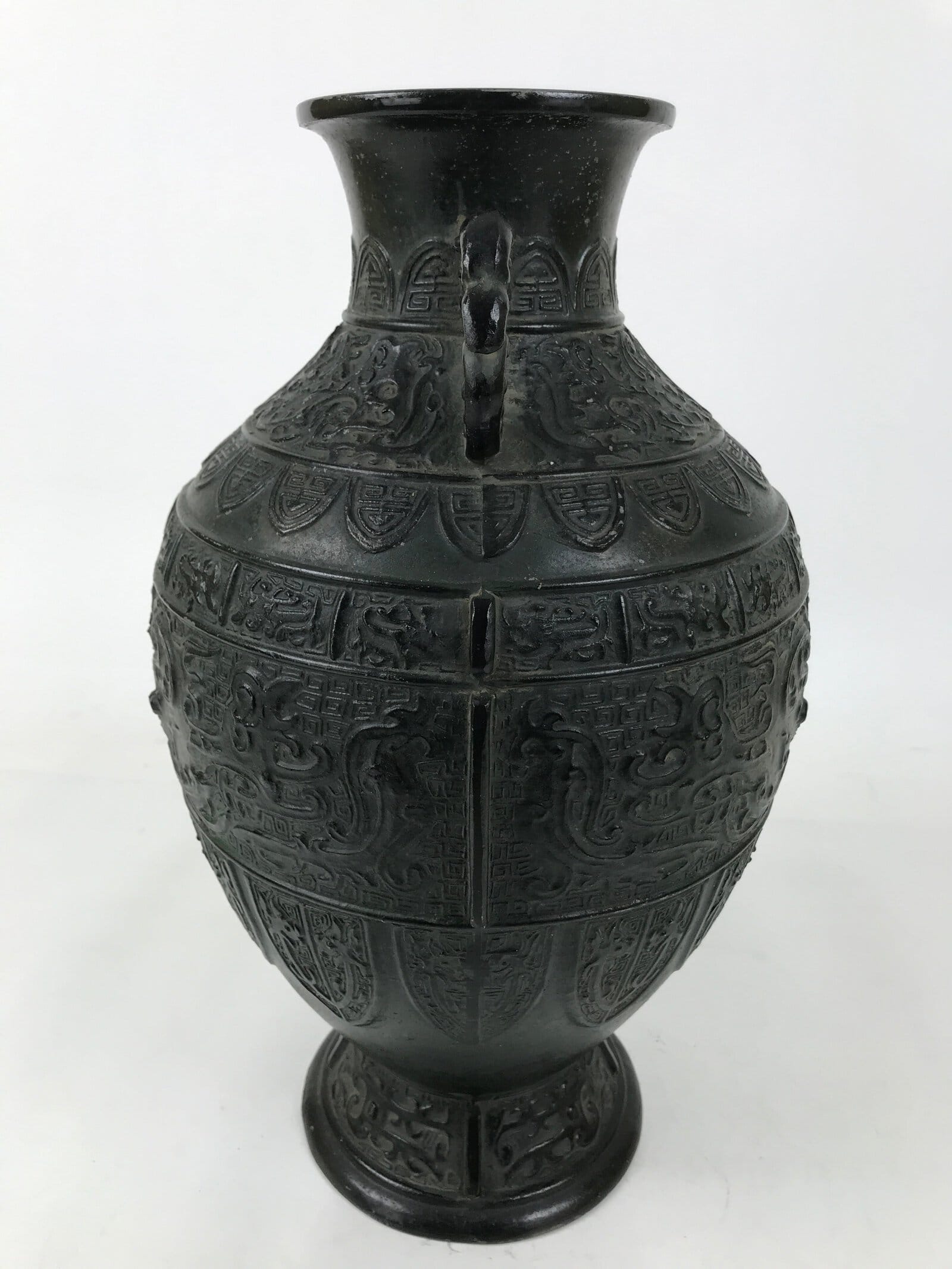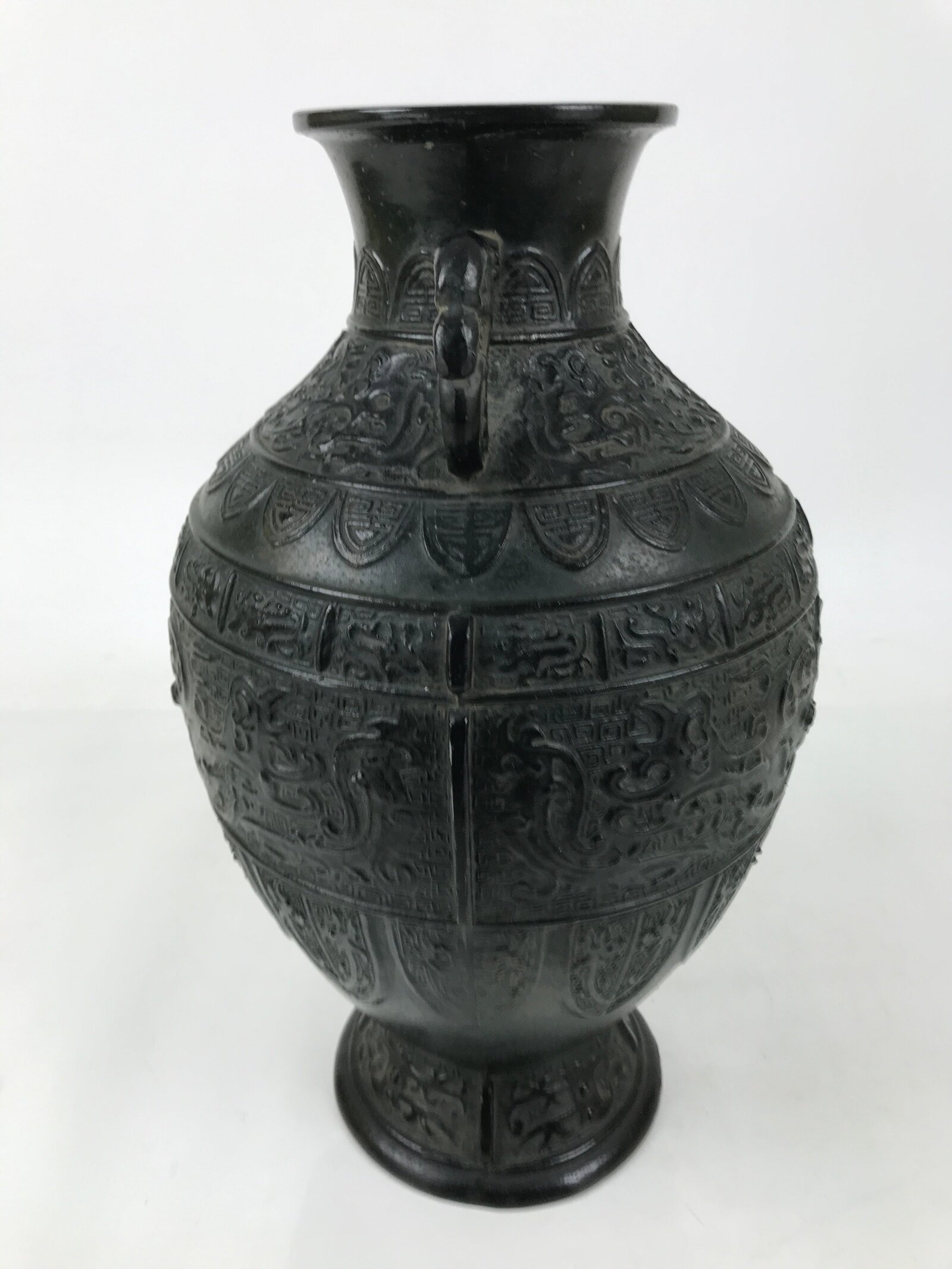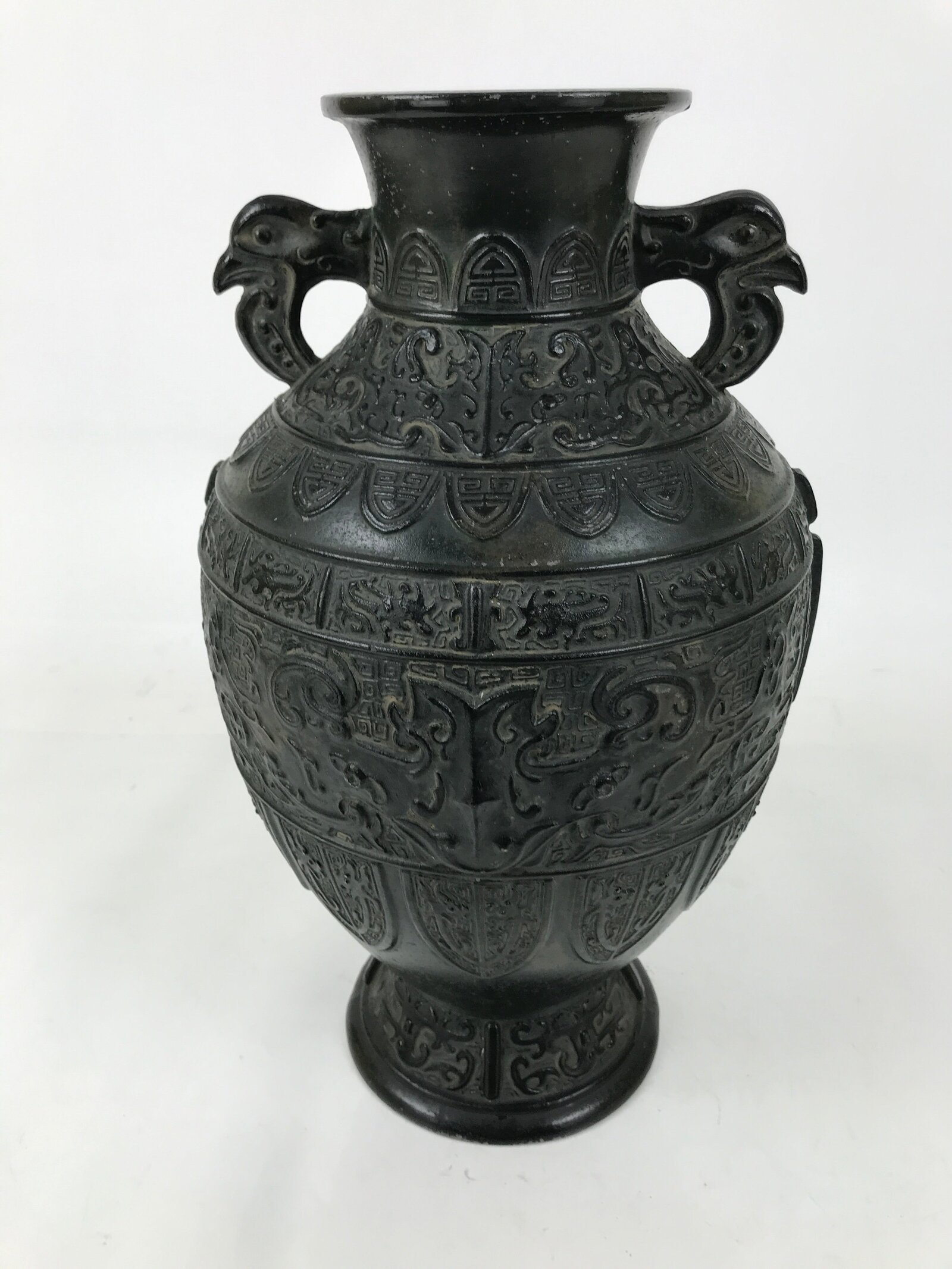 This is a Japanese vintage flower vase or kabin. Used for ikebana flower arrangements, this heavy green bronze metal vase has a round body and two handles. The middle of the body features a design of a dragon face seen from the front, with some crests positioned under that. The handles have a bird head design. There is a signature on the bottom.