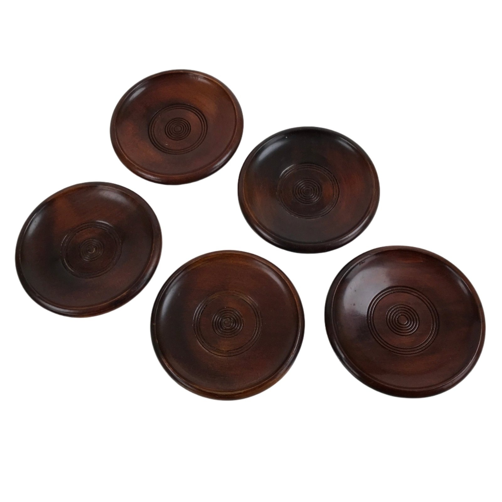 This is a five-piece set of vintage Japanese wooden lacquered drink saucers/coasters, or chataku. Stained a medium brown and brushed with a clear lacquer coating, this easily stackable set is a simple, classic style. It has an indentation with carved rings at the center to keep a cup from slipping off.