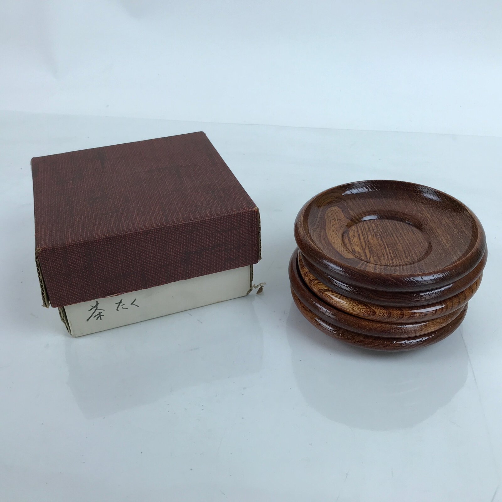 This is a five-piece set of vintage Japanese wooden lacquered drink saucers/coasters, or chataku. Stained a medium brown and brushed with a clear lacquer coating, this easily stackable set is a simple, classic style. It has an indentation at the center to keep a cup from slipping off. The original box is included.