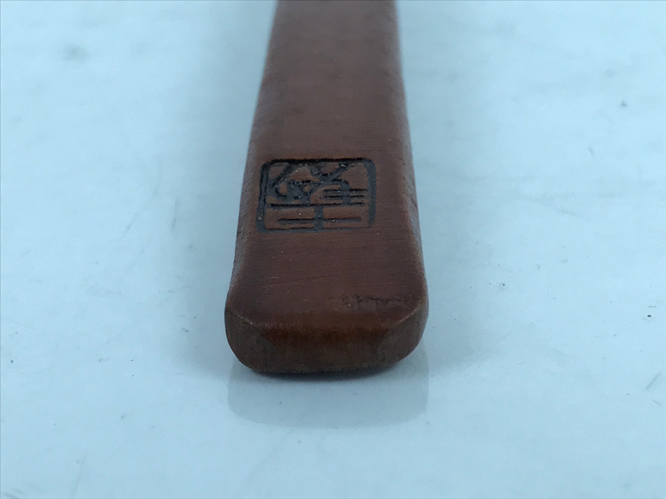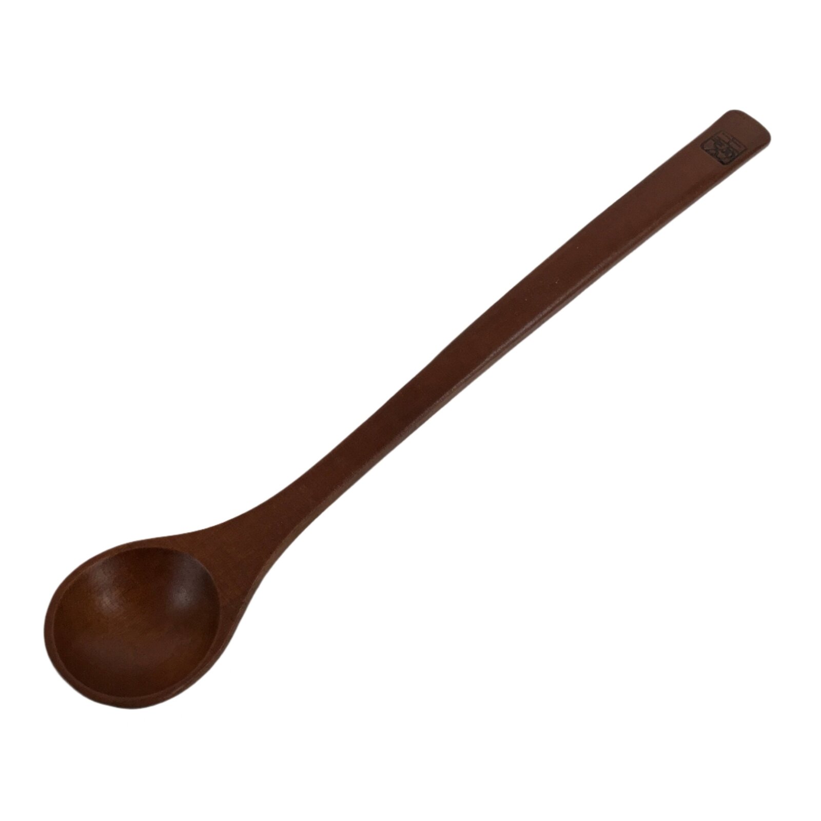 This is a Japanese vintage wooden spoon. It is made of strong wood with a medium brown stain and a clear brushed lacquer coating. This item has a long, skinny handle and is for eating parfaits, floats, shakes, malts, etc. It has a deep, round scoop.