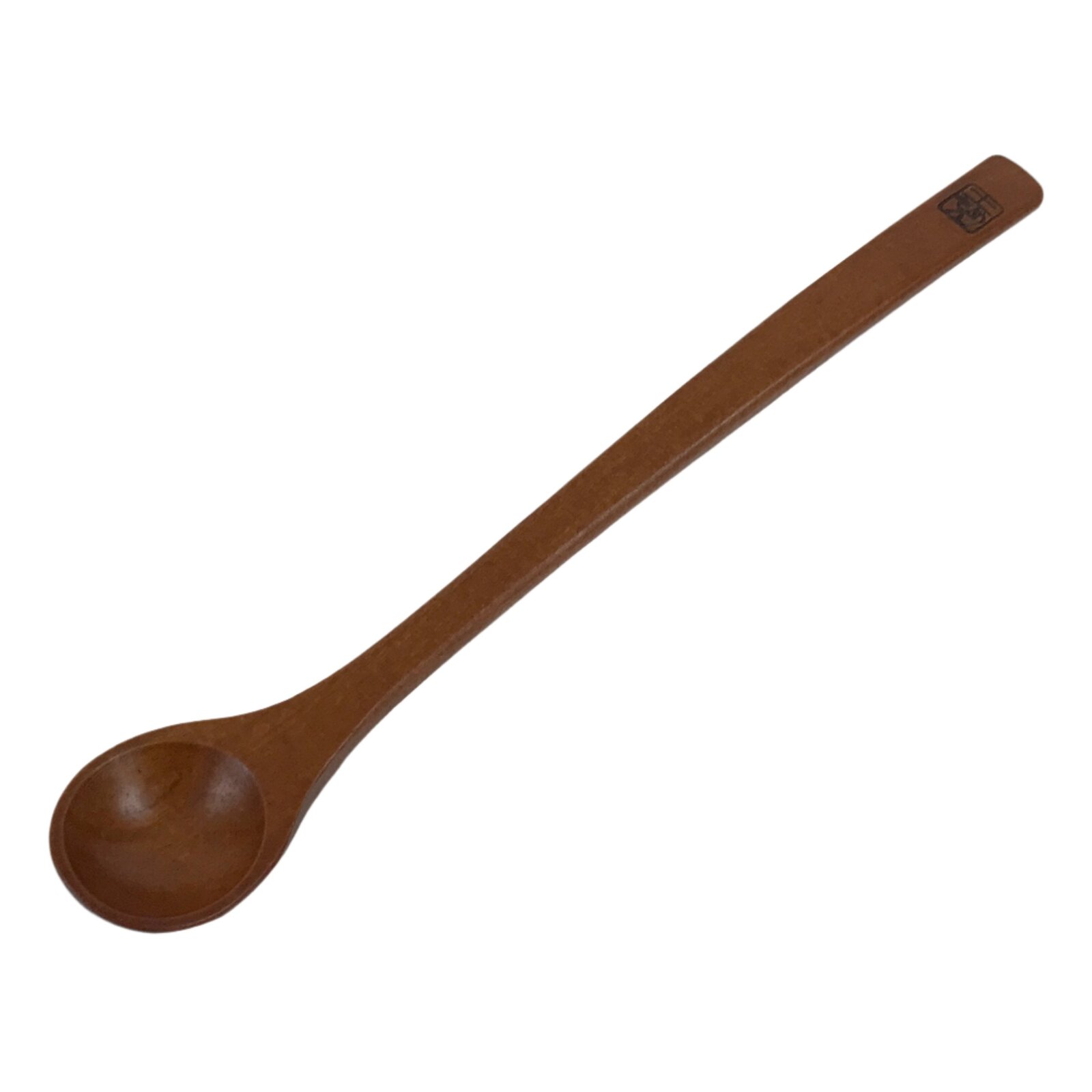 This is a Japanese vintage wooden spoon. It is made of strong wood with a medium brown stain and a clear brushed lacquer coating. This item has a long, skinny handle and is for eating parfaits, floats, shakes, malts, etc. It has a deep, round scoop.