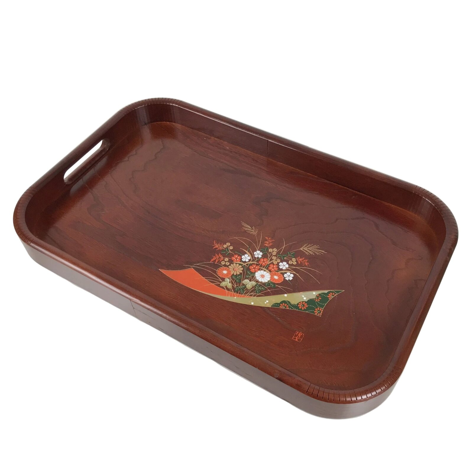 A glossy medium brown this high-quality vintage brushed lacquer Japanese serving tray is made of wood. It is a rounded rectangular shape with raised sides so drinks cannot easily slide off, and it has a bold line design on the top surface. It features a beautiful gold, orange, and green makie design of flowers (chrysanthemum and carnation).
