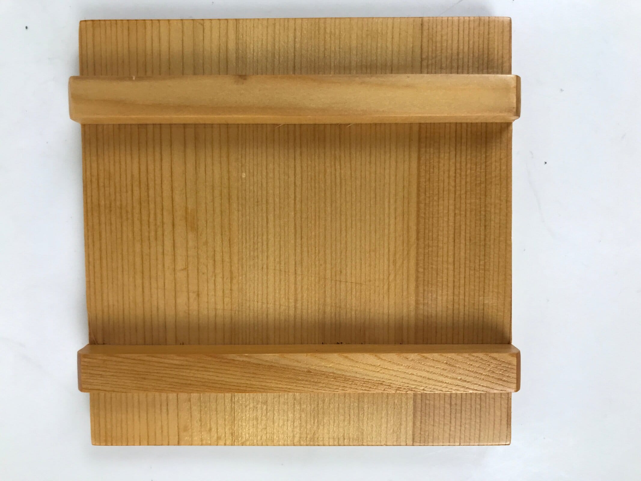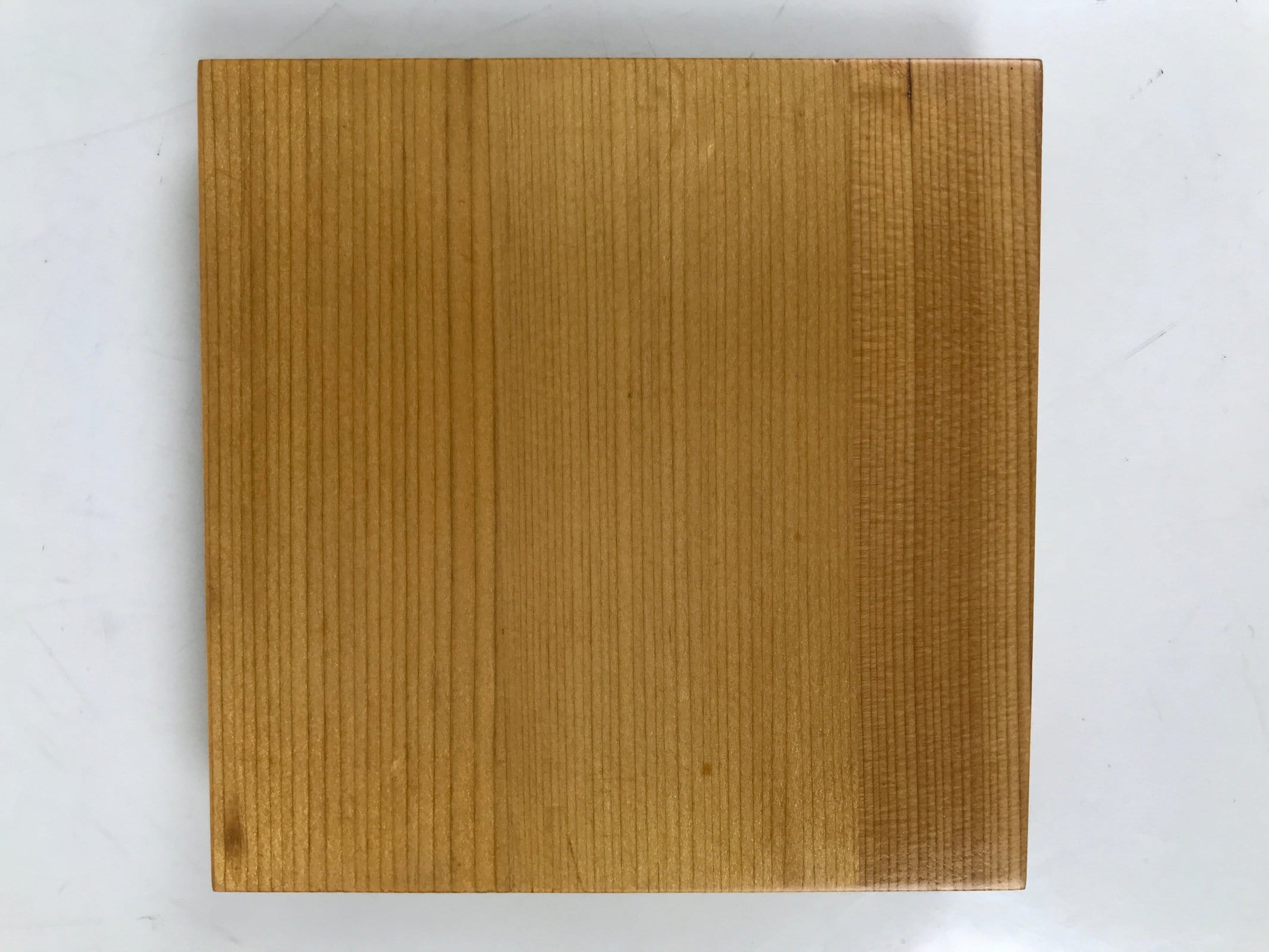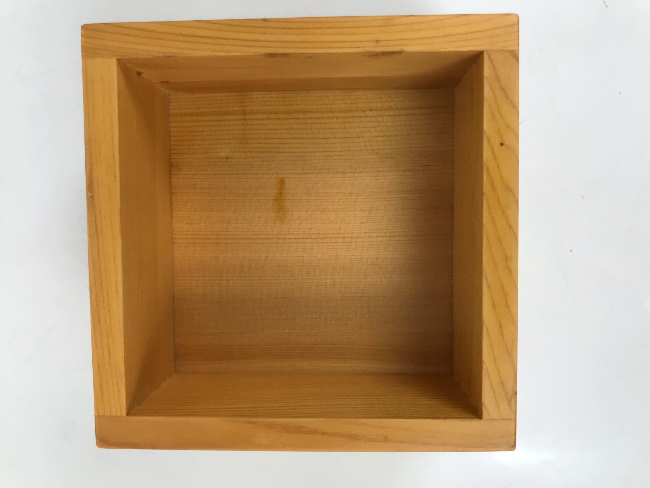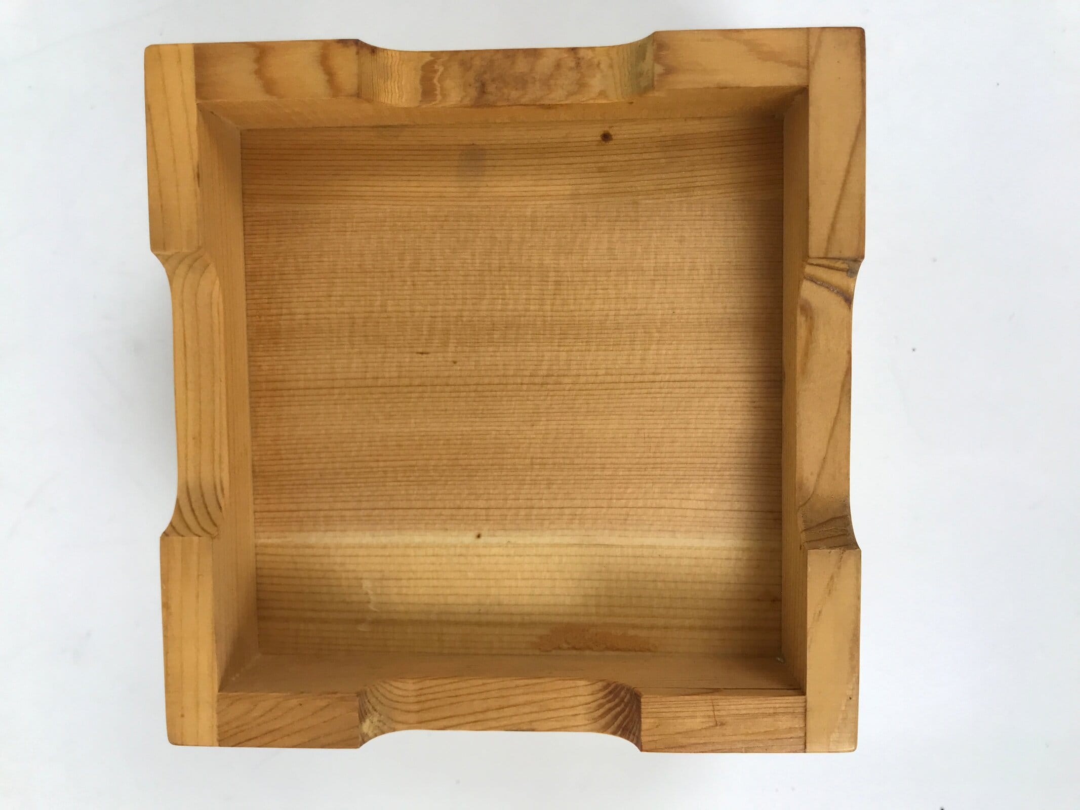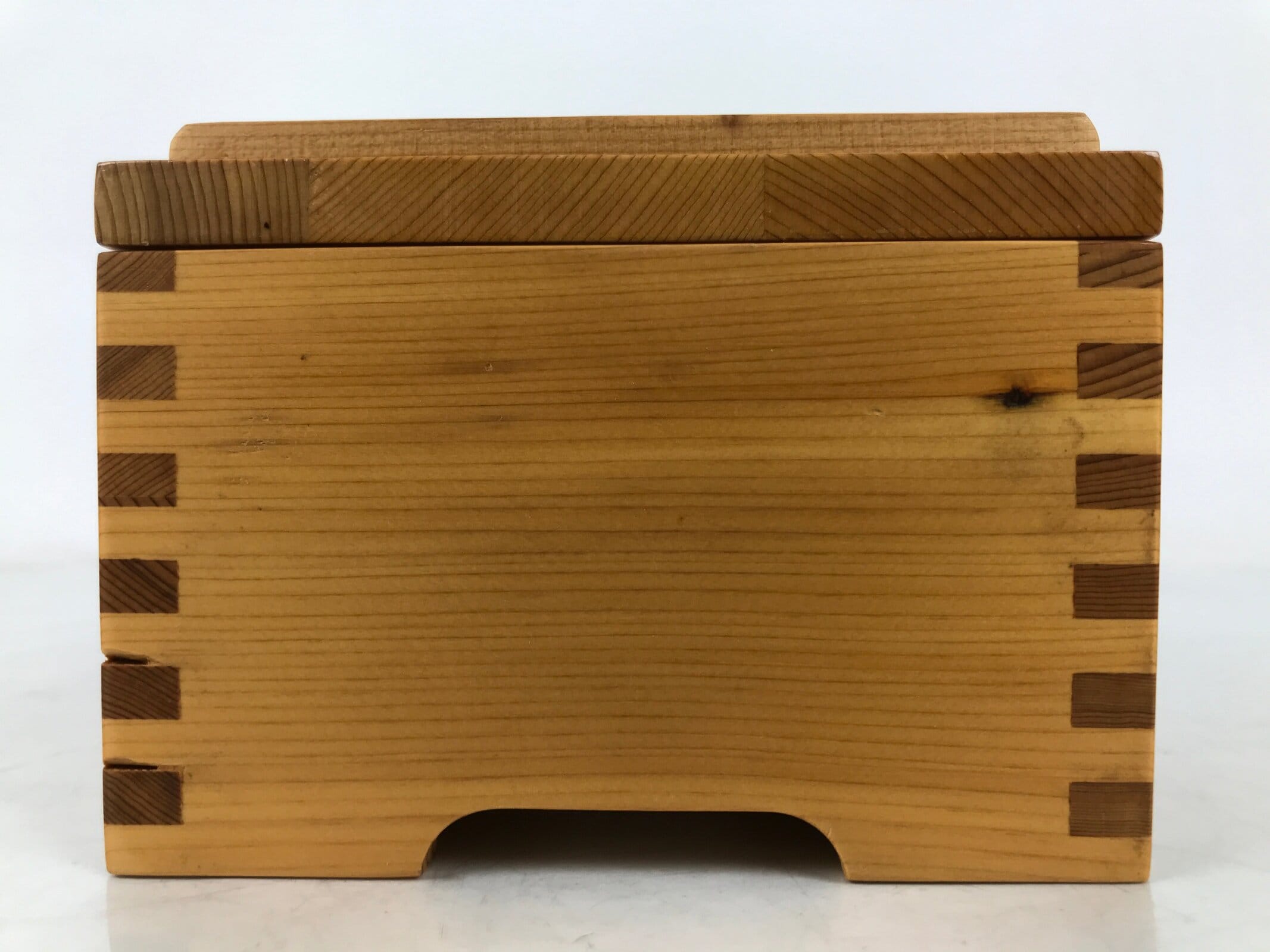 This is a vintage Japanese brushed lacquer wooden box with a lid. It is made of either cedar or cypress and brushed with a clear coat of lacquer to allow the fine natural wood grain to shine through. This piece is used as a serving dish for one of many small and elegant courses during a traditional kaiseki meal set.