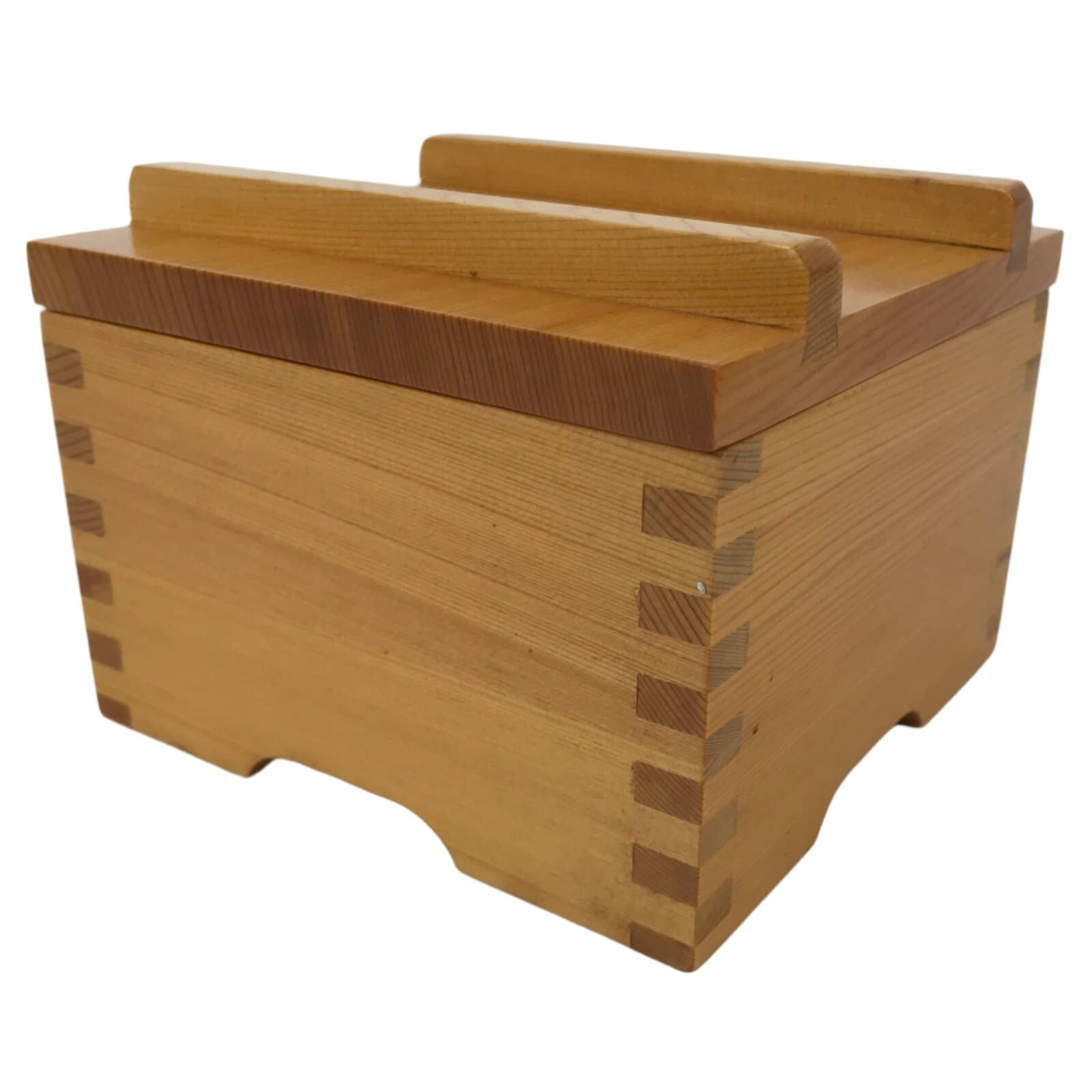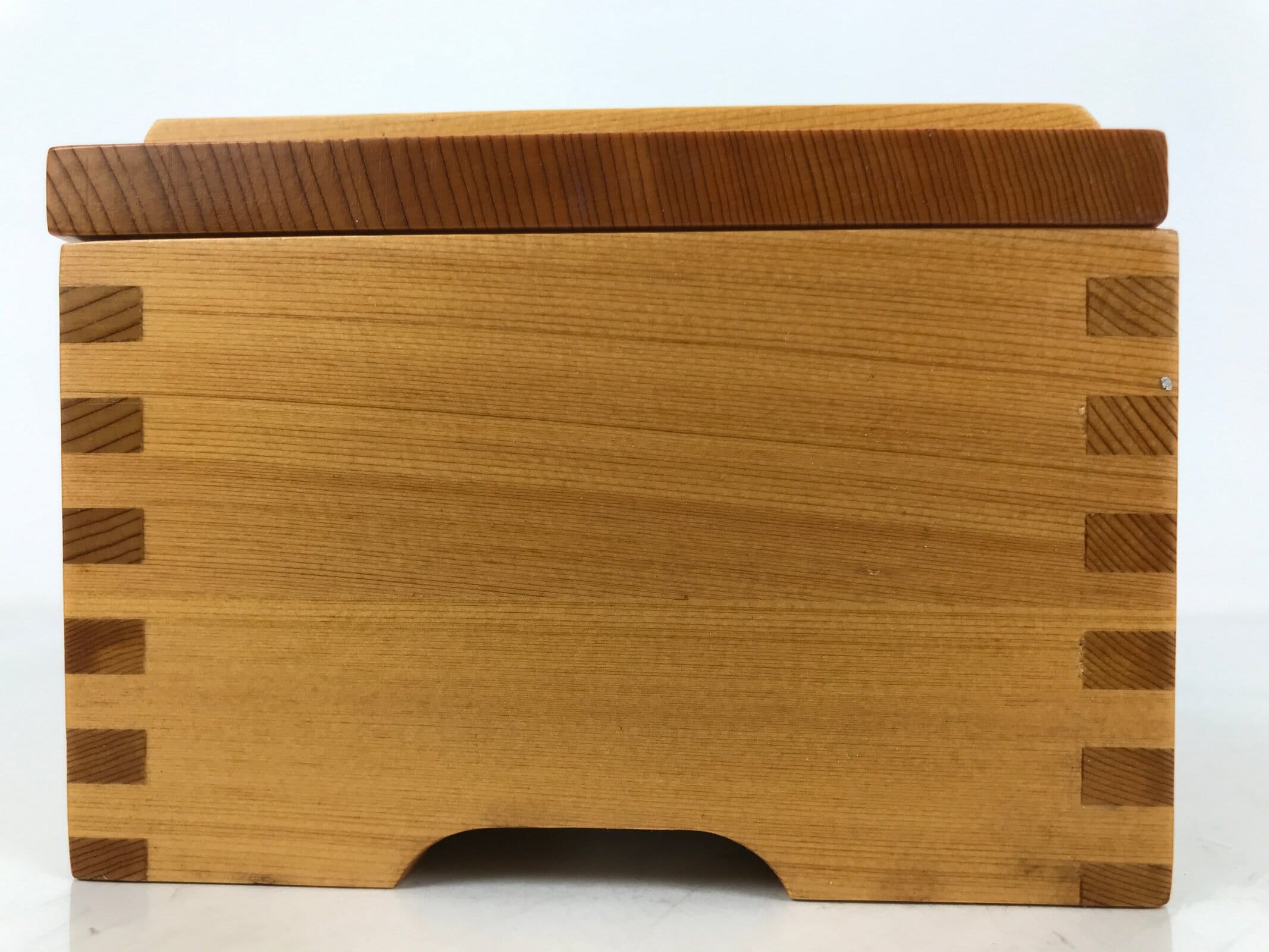 This is a vintage Japanese brushed lacquer wooden box with a lid. It is made of either cedar or cypress and brushed with a clear coat of lacquer to allow the fine natural wood grain to shine through. This piece is used as a serving dish for one of many small and elegant courses during a traditional kaiseki meal set.