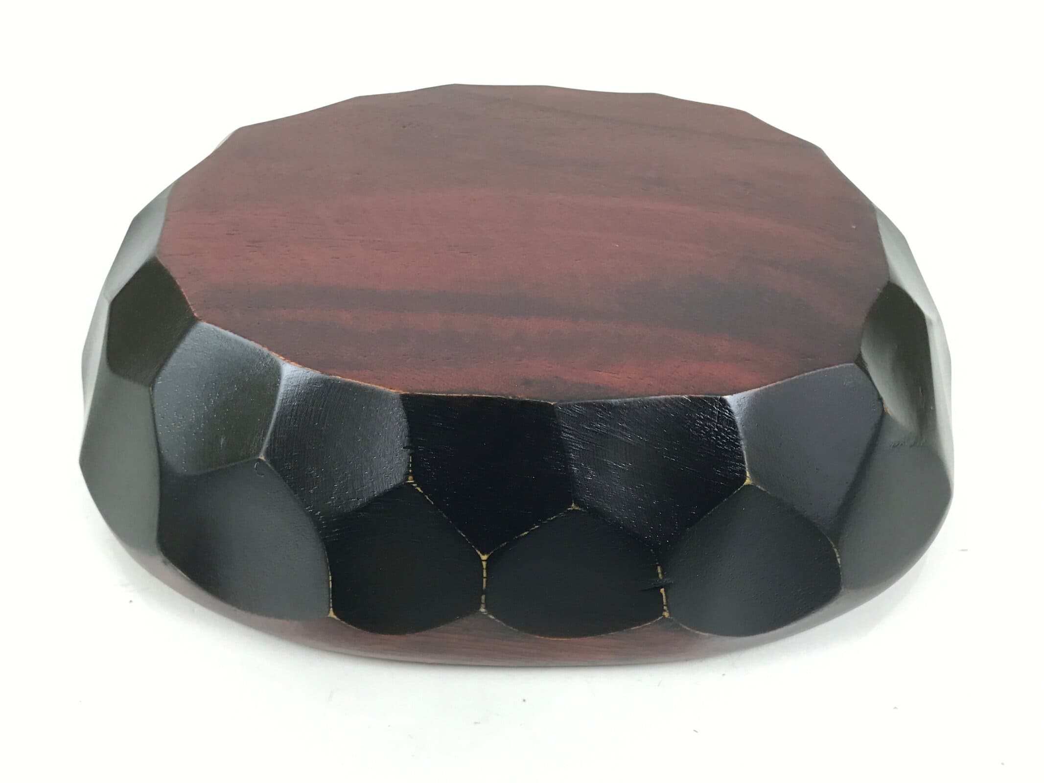 This is a Japanese vintage salad serving bowl. This oval dish is carved from wood and stained a deep brown with a clear brushed lacquer finish. The design features large chunks carved out from the sides (reminiscent of the kamakurabori style). It comes with matching hand-carved spoon and fork serving utensils.