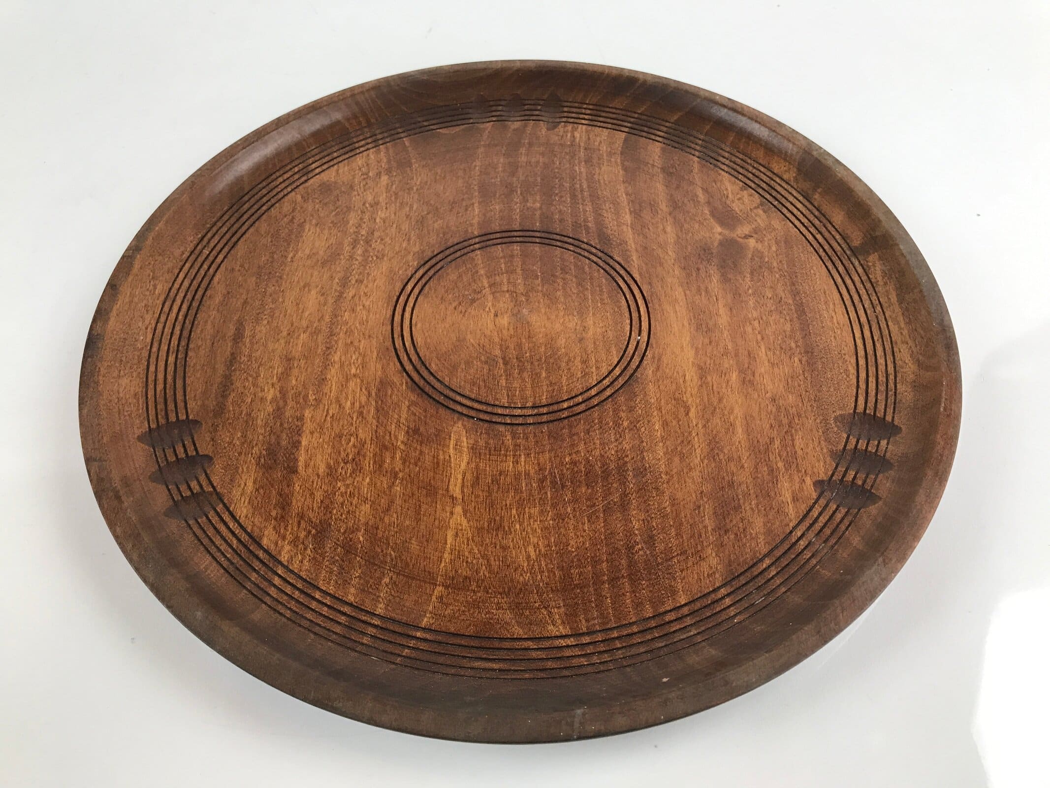 A natural brown color with gorgeous wood grain on display, this vintage brushed lacquer Japanese serving tray is made of wood. It is round with slightly raised sides so drinks cannot easily slide off. It has carved bands that go around the outside edge and the center of the top surface.