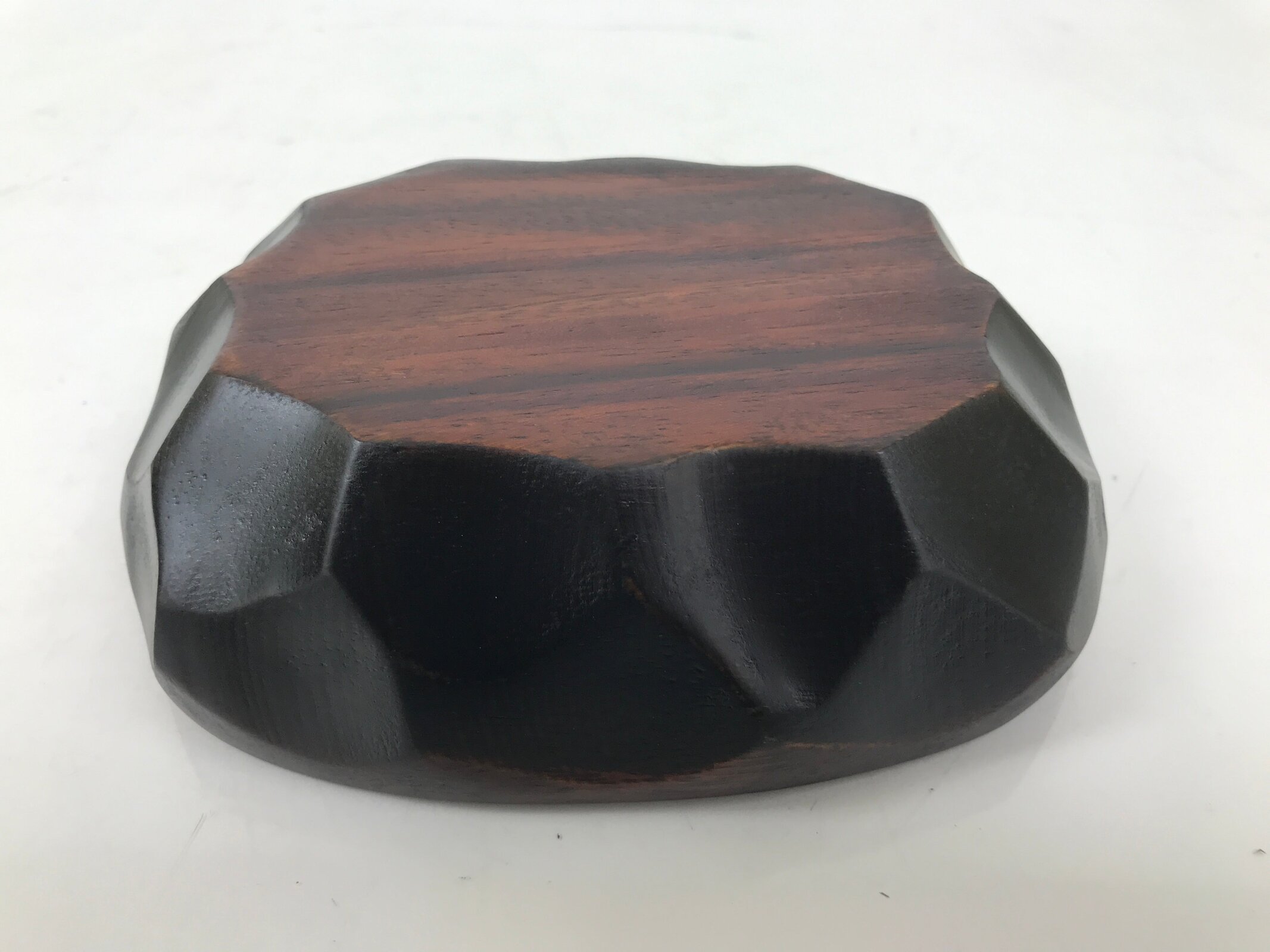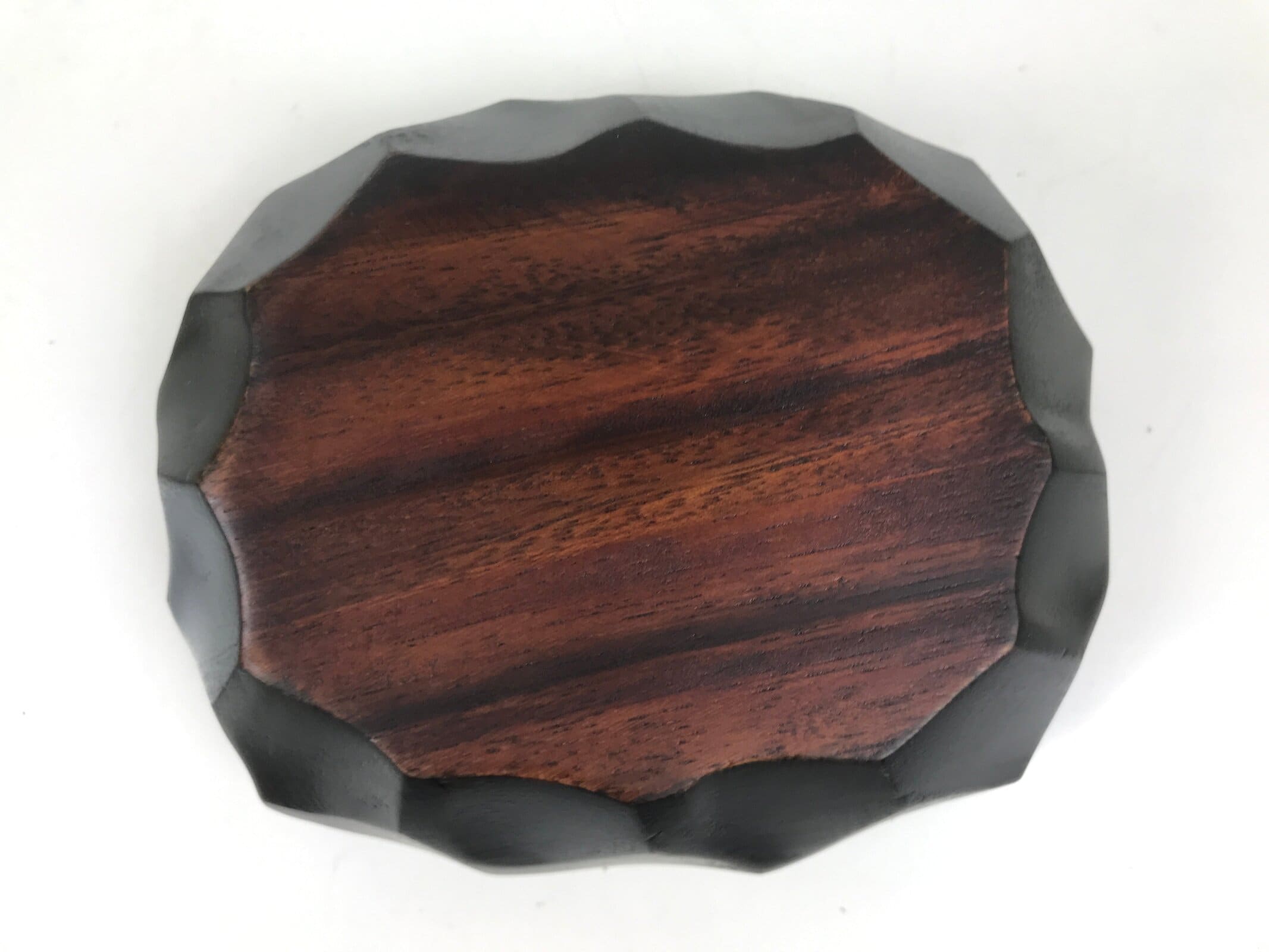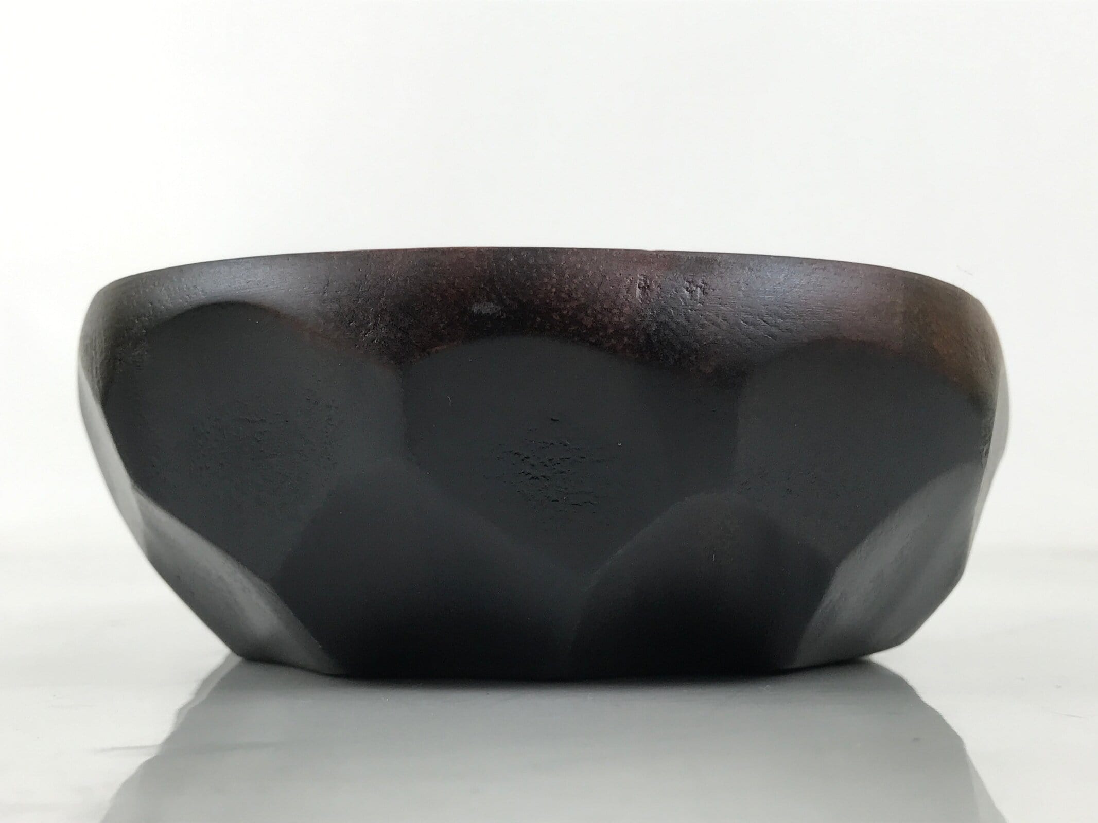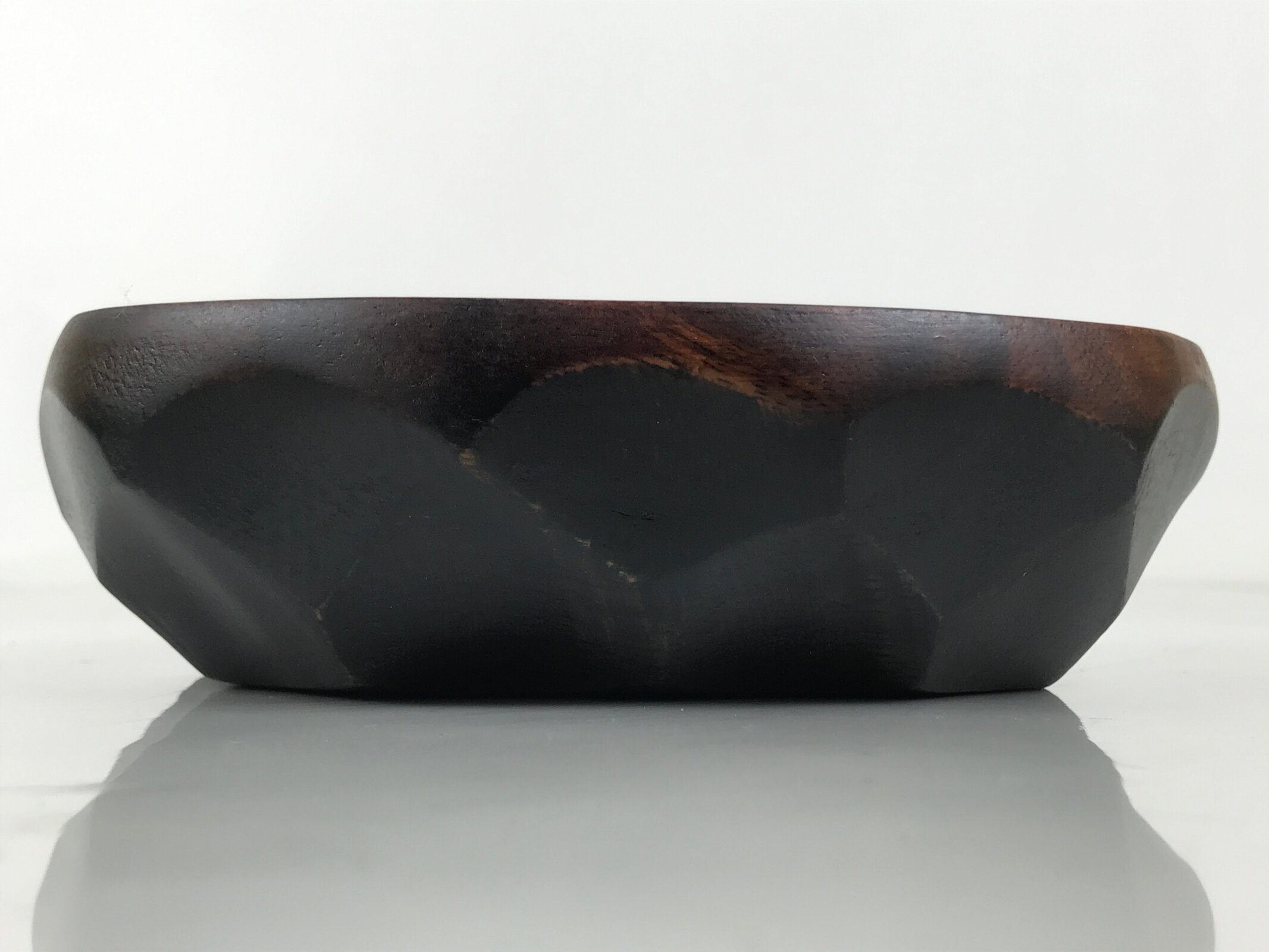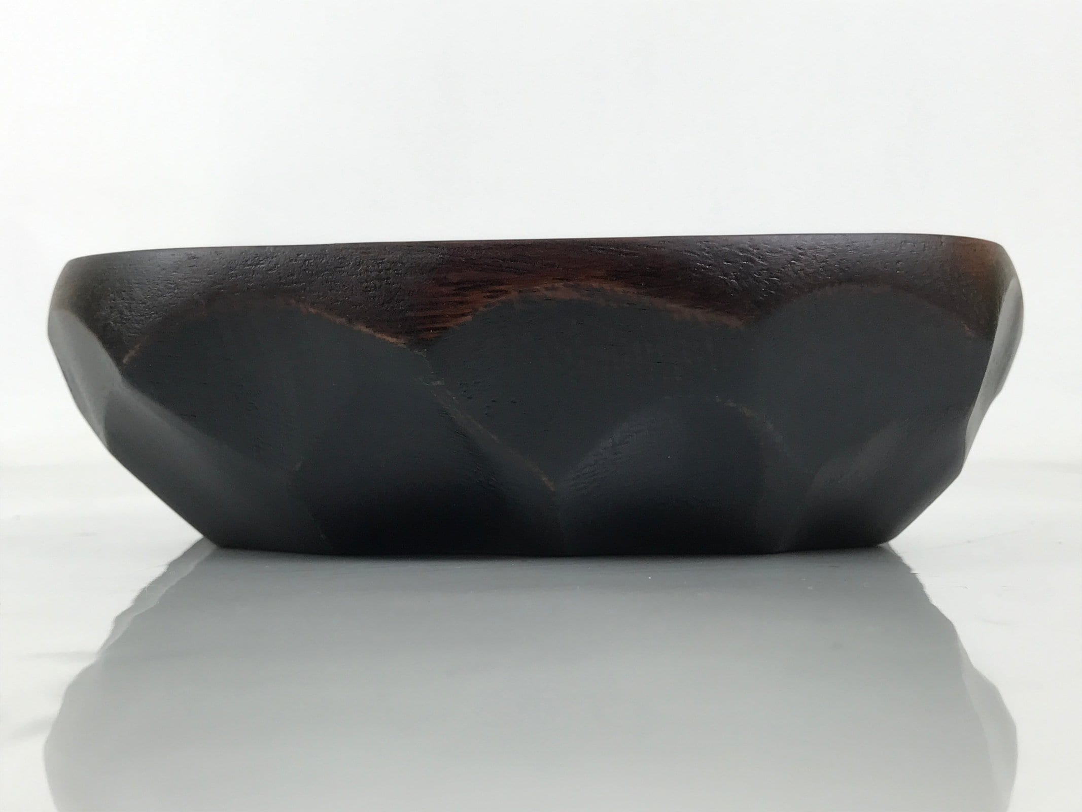 This is a Japanese vintage small bowl, or kobachi, typically used for serving cold salad, fruit, and other dishes. This oval dish is carved from wood and stained a deep brown with a clear brushed lacquer finish. The design features large chunks carved out from the sides (reminiscent of the kamakurabori style). It can also be used for storing small trinkets, jewelry, keys, etc.