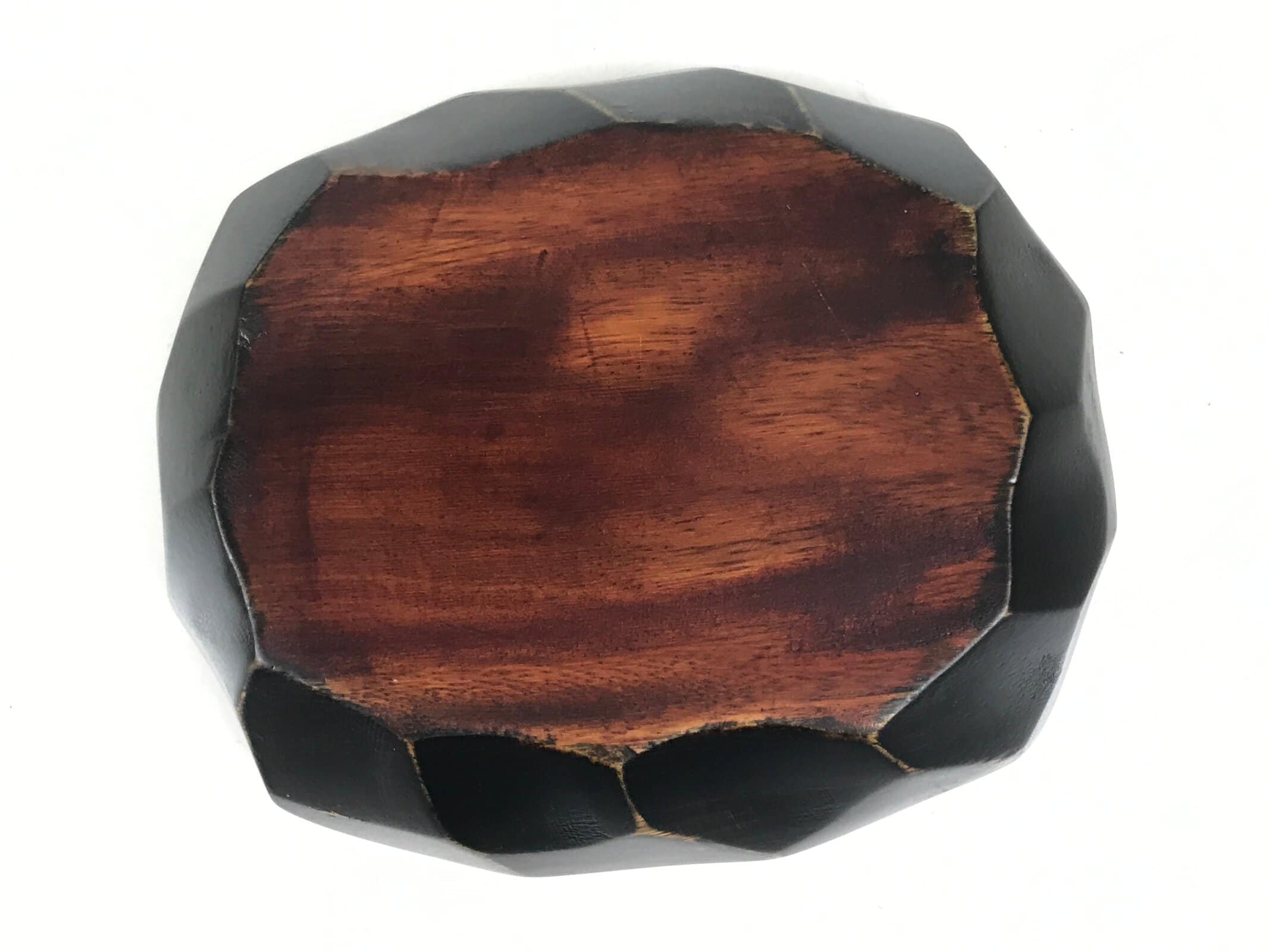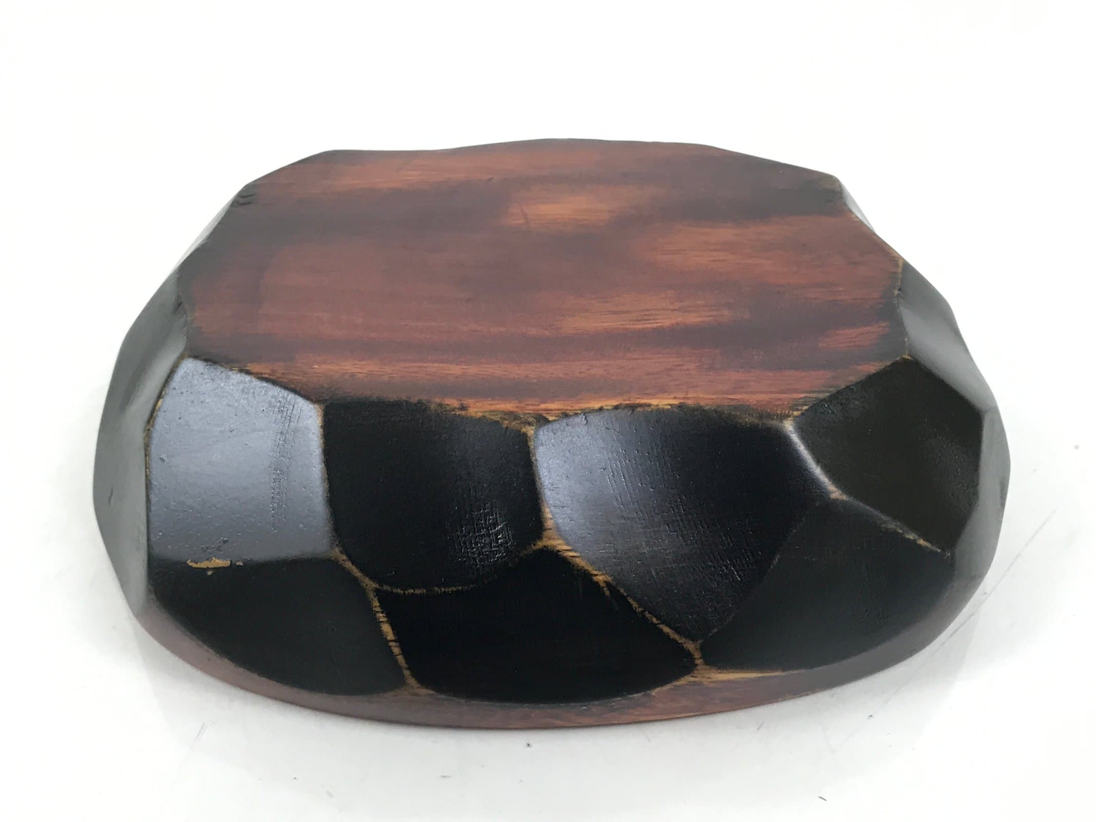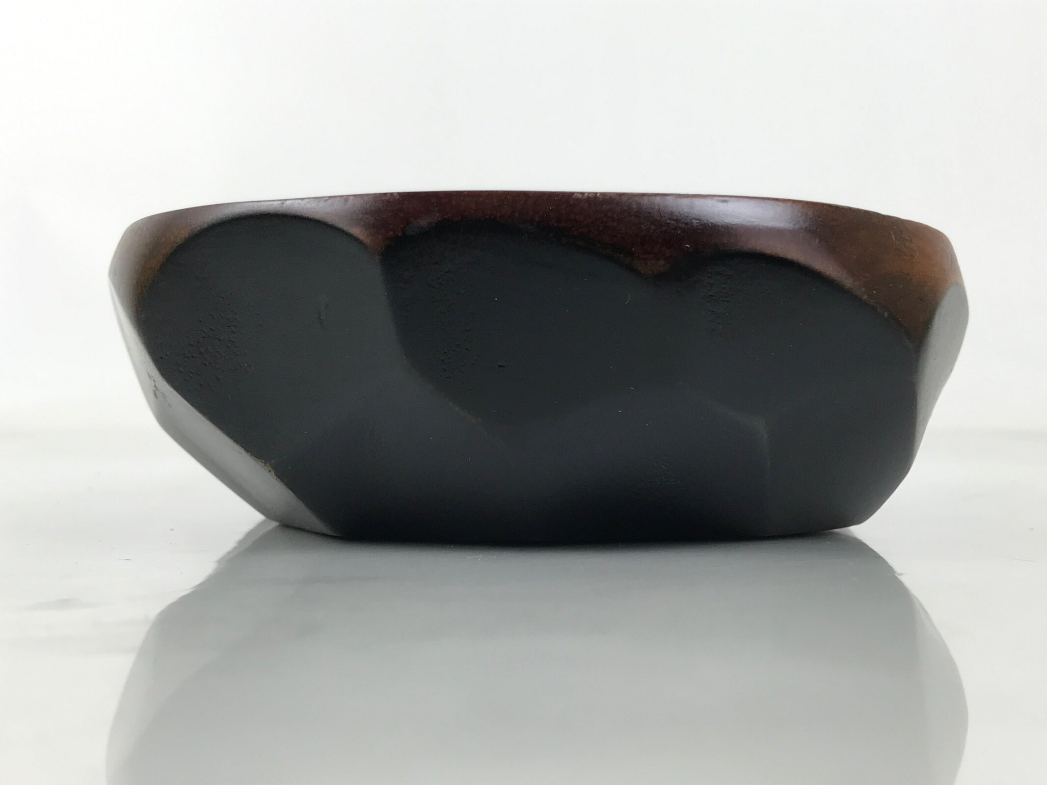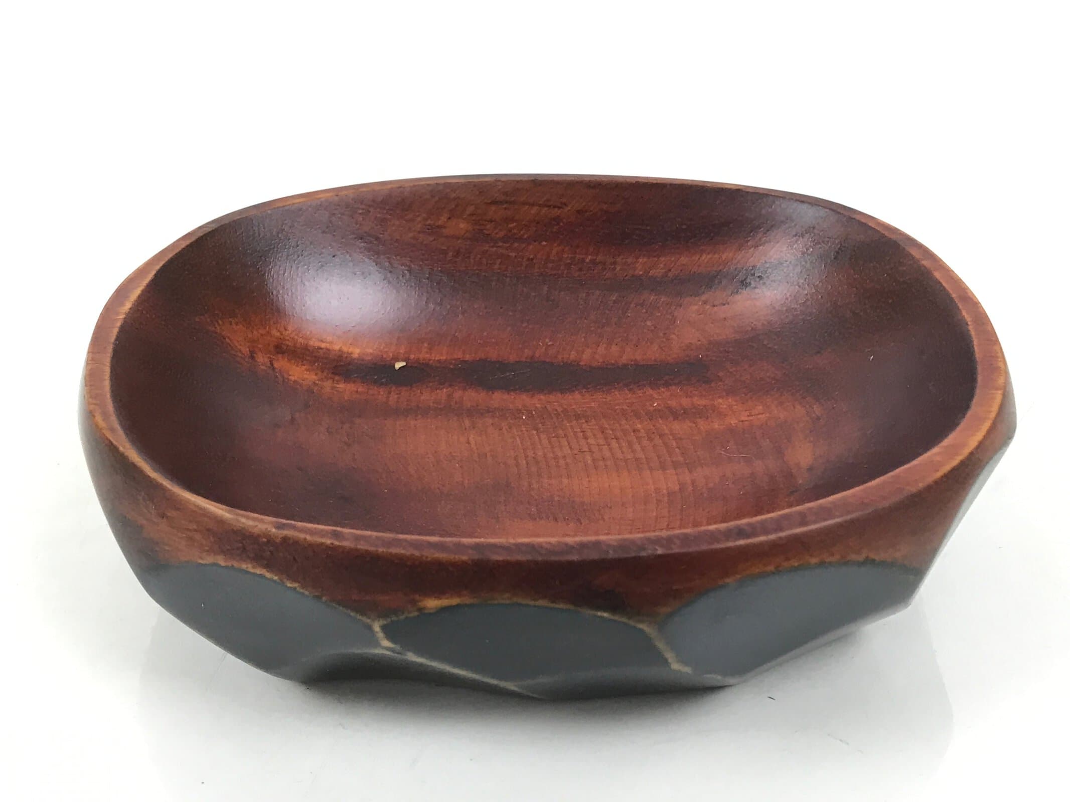 This is a Japanese vintage small bowl, or kobachi, typically used for serving cold salad, fruit, and other dishes. This oval dish is carved from wood and stained a deep brown with a clear brushed lacquer finish. The design features large chunks carved out from the sides (reminiscent of the kamakurabori style). It can also be used for storing small trinkets, jewelry, keys, etc.
