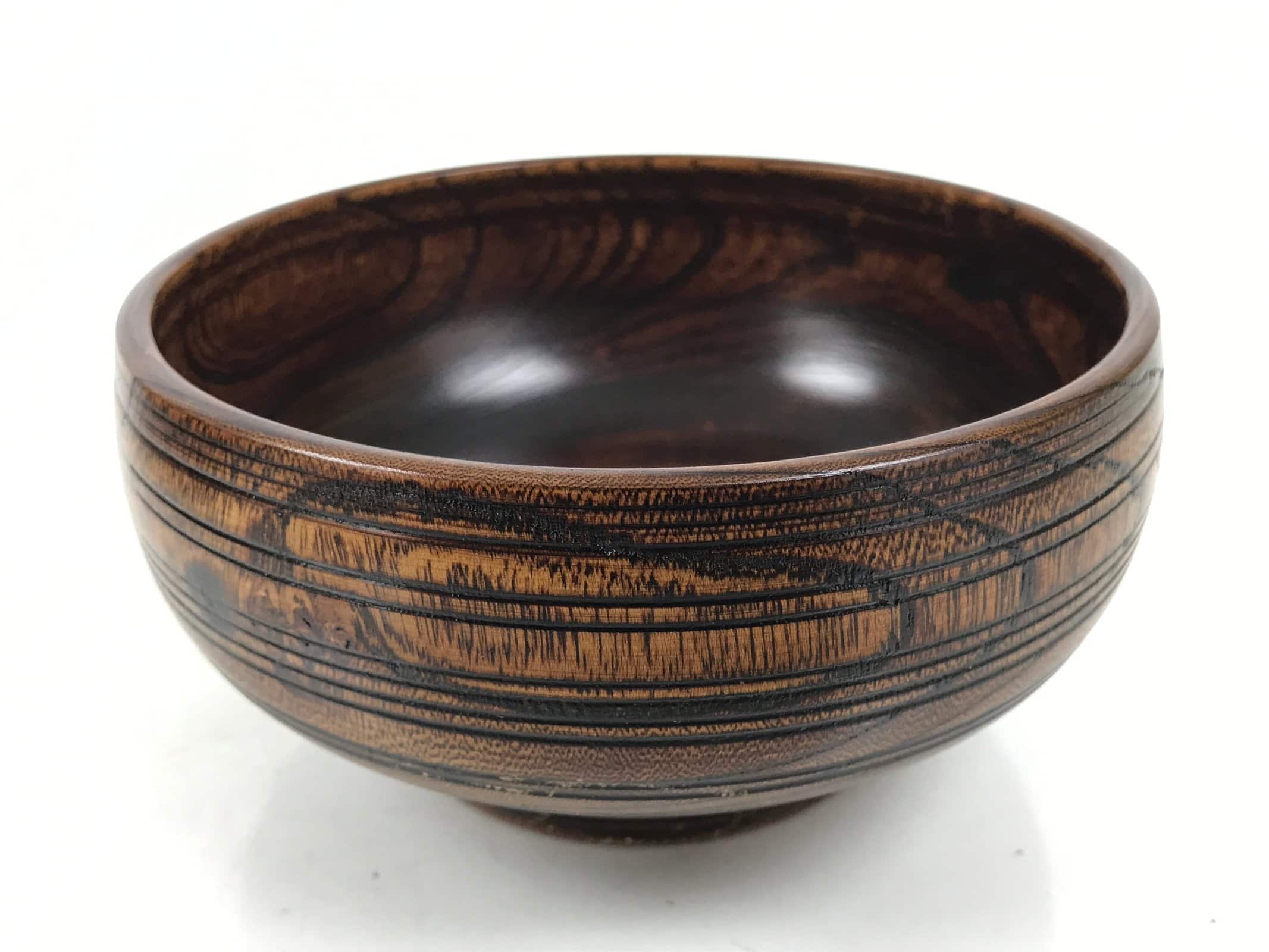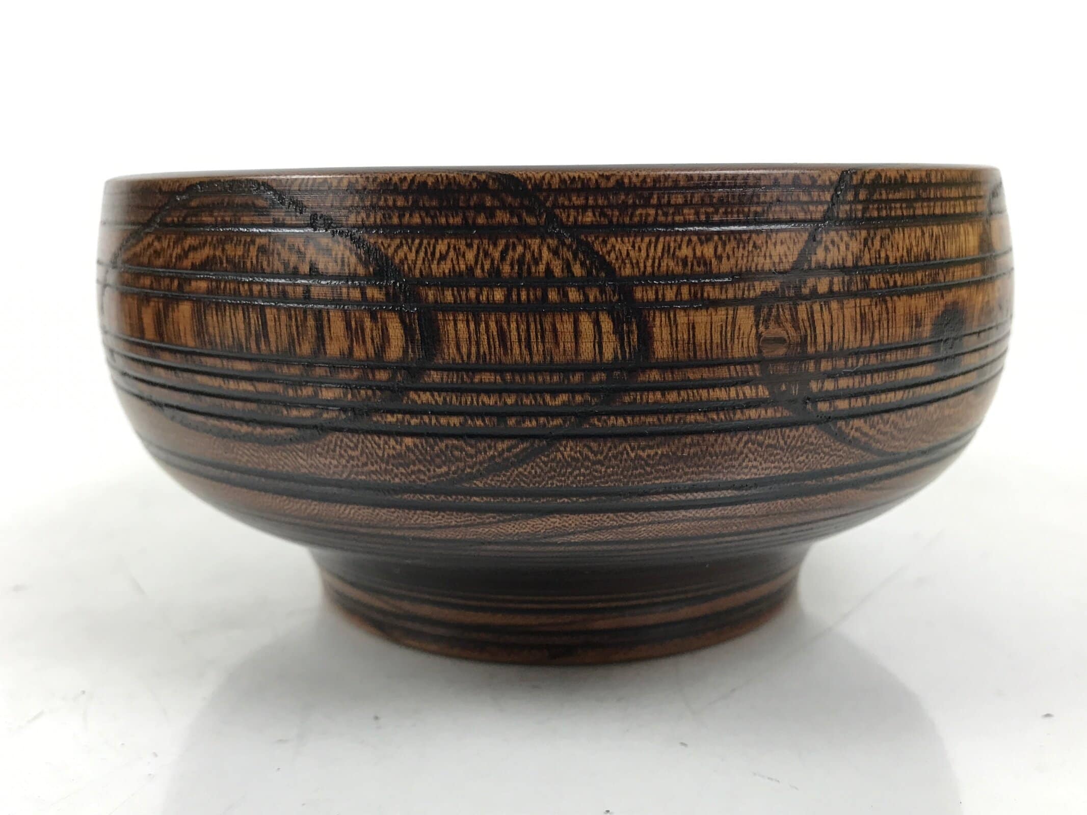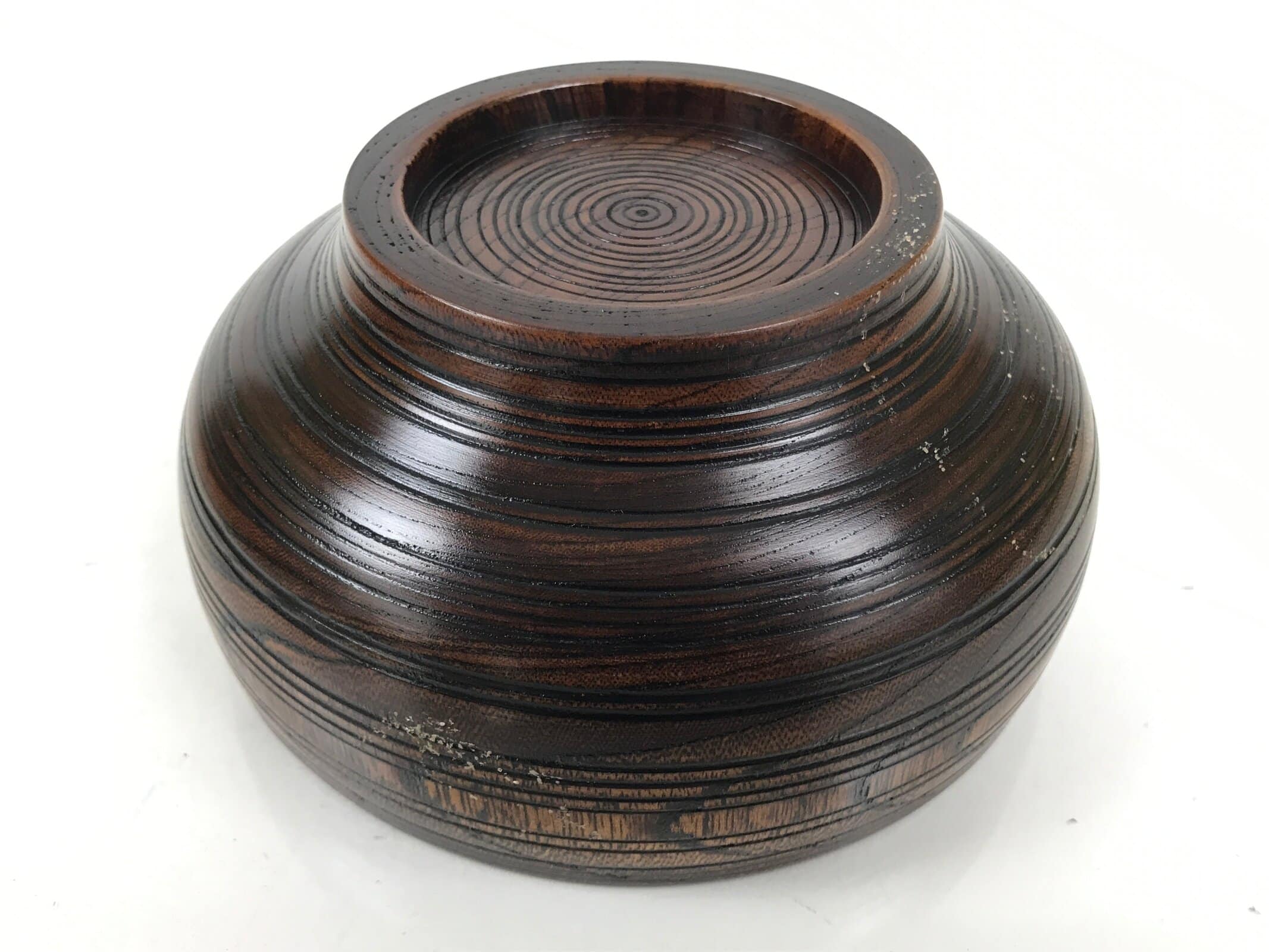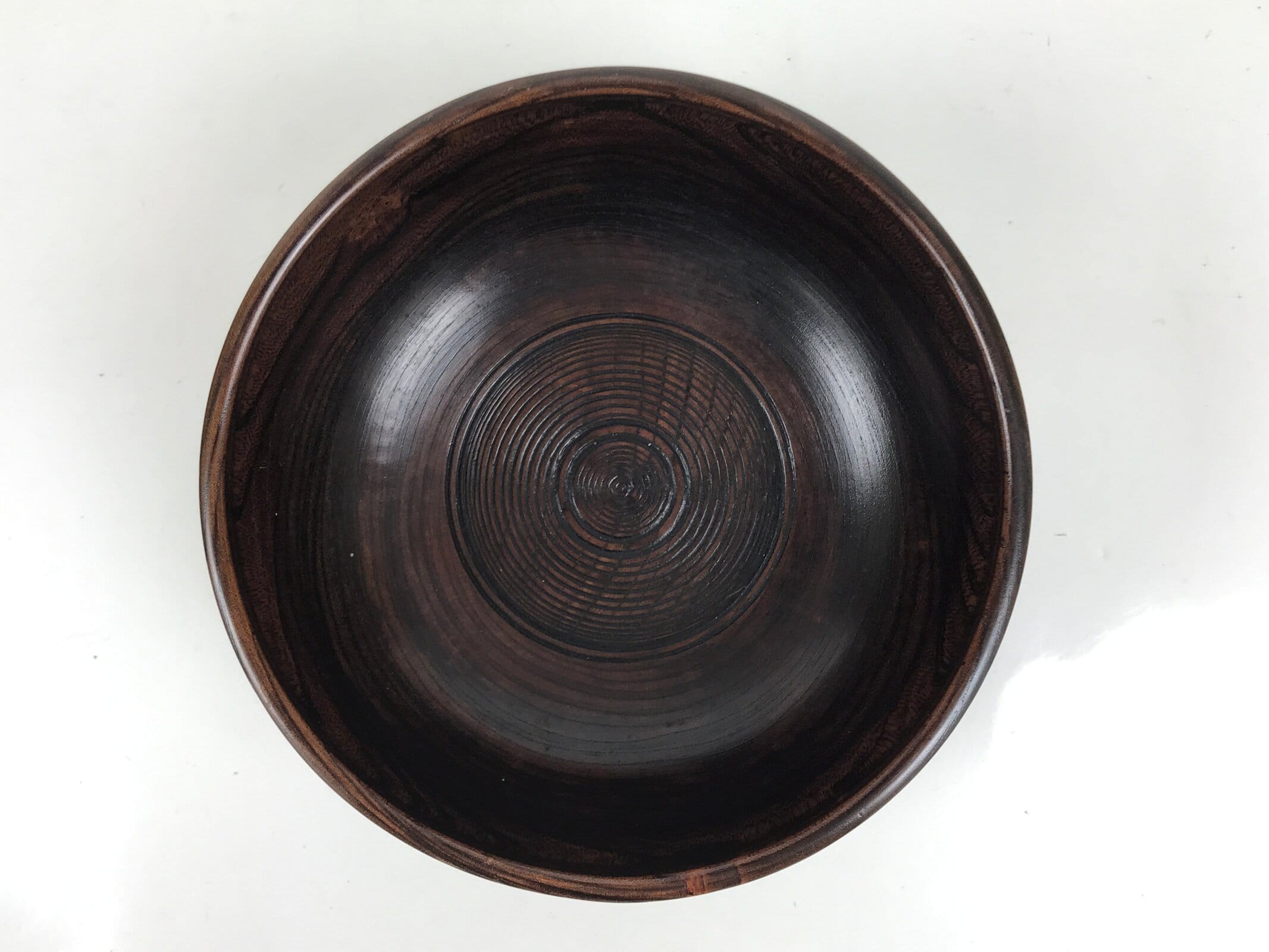 This is a Japanese vintage small bowl, or kobachi, typically used for serving cold salad, fruit, and other dishes. This round dish is carved from wood and stained a deep brown with a clear brushed lacquer finish. Circle design on the inside and outside of the bottom. The side features carved thin lines with natural wooden grain. It can also be used for storing small trinkets, jewelry, keys, etc.