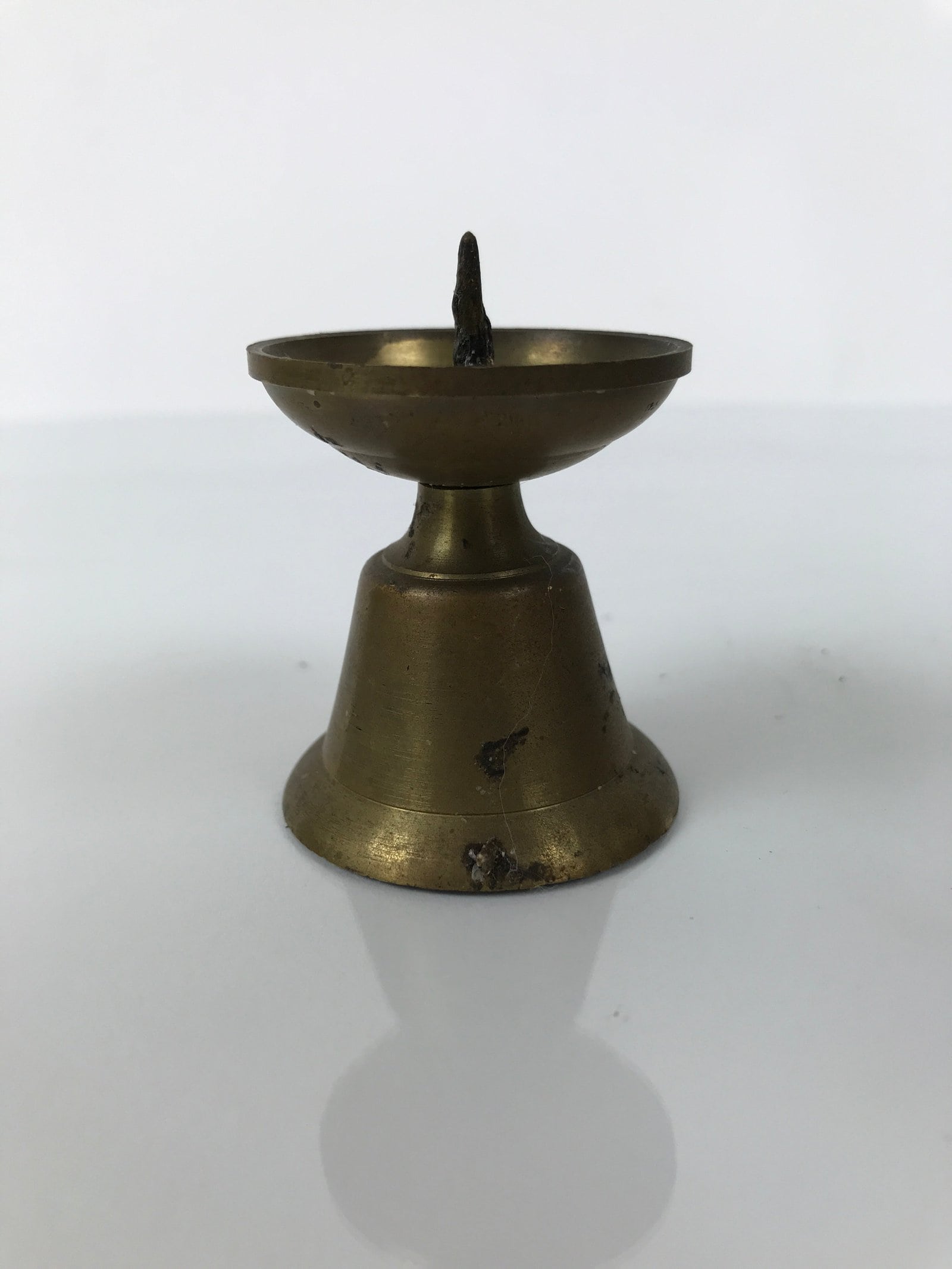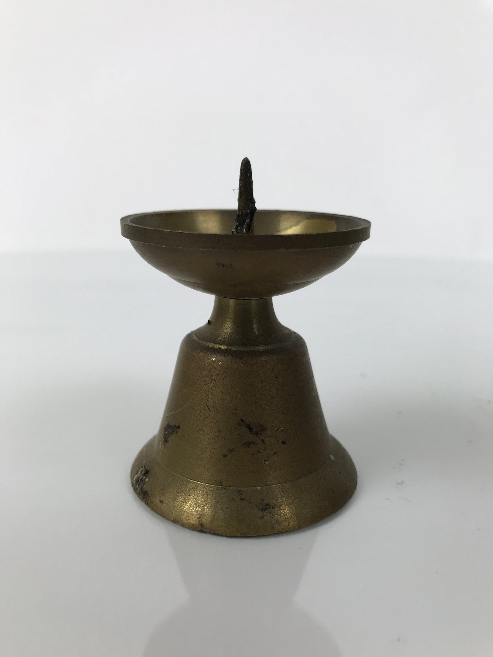 This item is a Japanese vintage Buddhist altar candle holder stand. This small brass metal candlestick is gold and has a very simple, classic design with a bell-like base. Candlestands or candlesticks are basic Buddhist tools used in most sects and an essential for Buddhist altars (Butsudan).