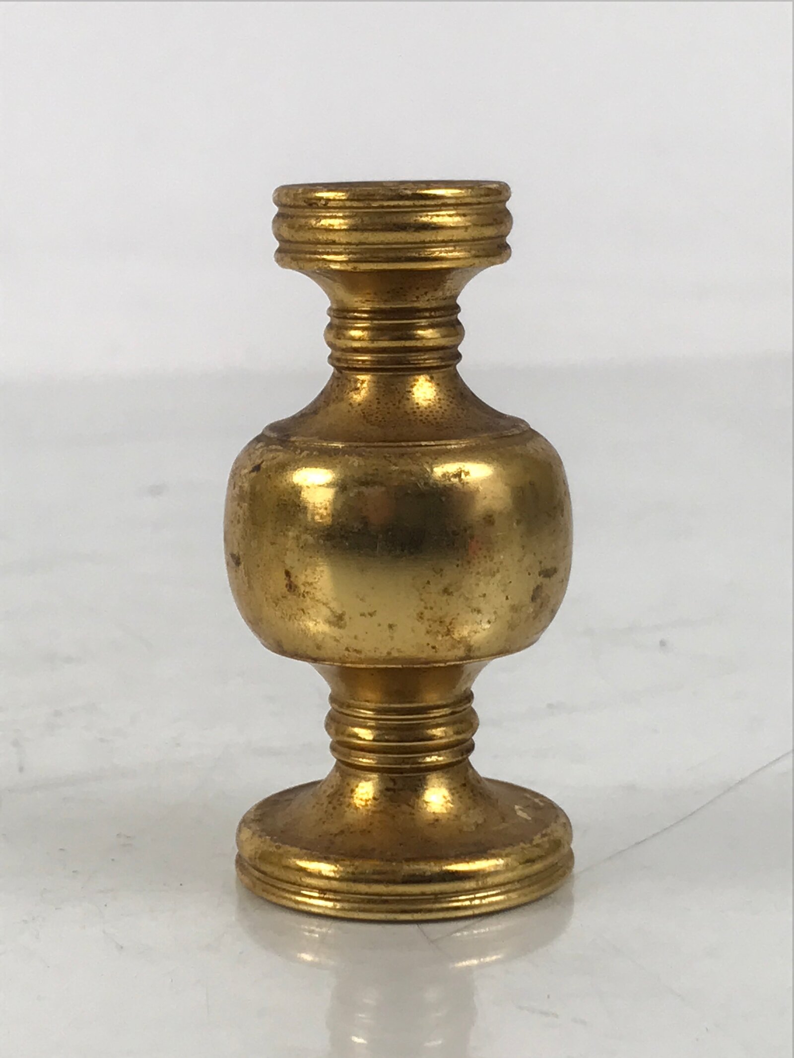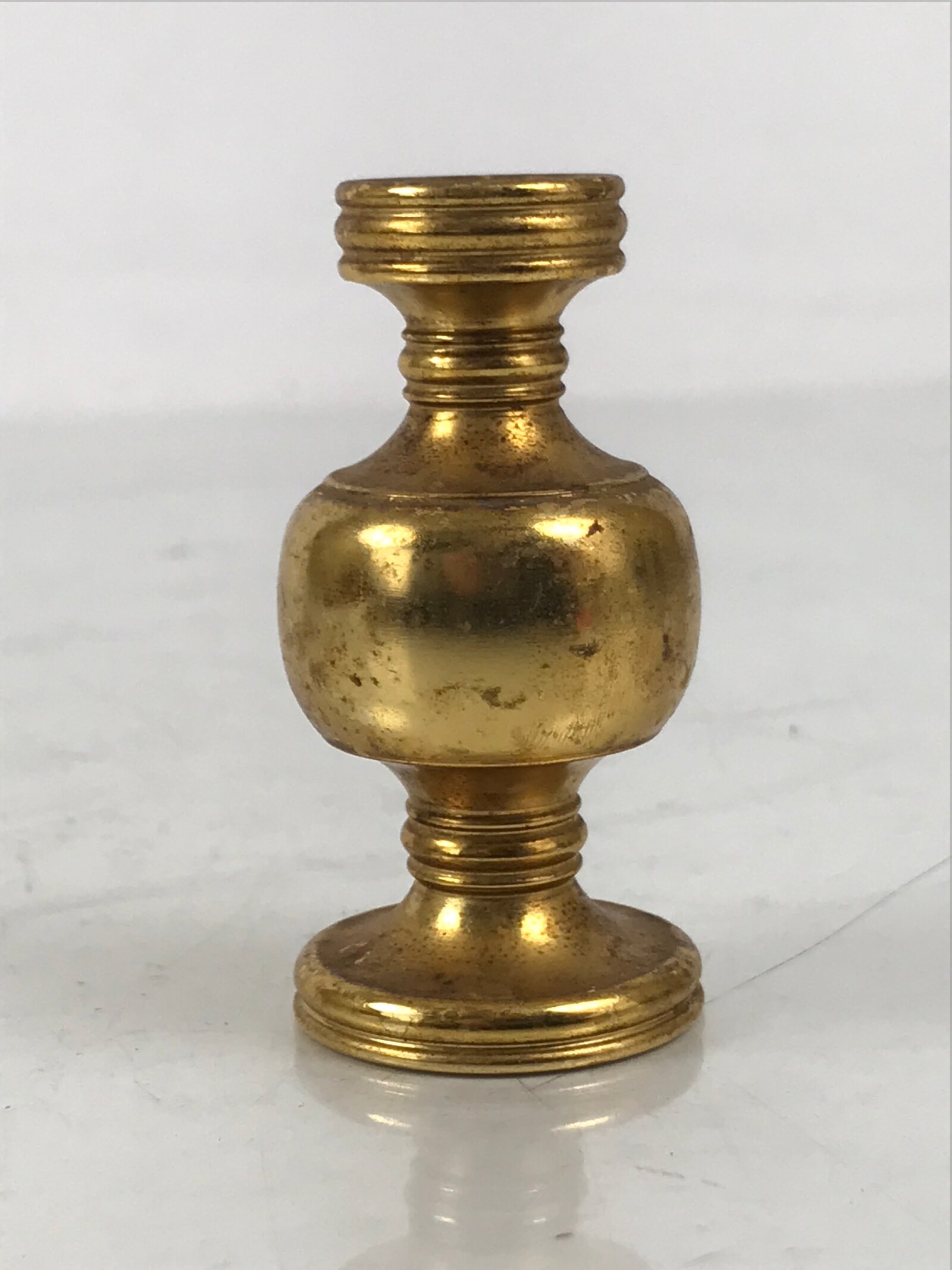 This is a vintage small metal flower vase, hanatate, for Buddhist altars. It is common to offer a range of seasonal and symbolic flowers in front of a Buddhist altar. It is also a vessel for Sakaki leaves or Shashagi leaves in Shinto. The meaning of offering sakaki tree leaves is that the gods living in the sakaki tree will protect the grave and the soul. This particular vase is very simple in design with no added embellishments or designs other than carved bands. It can hold individual or very small collections of flowers.