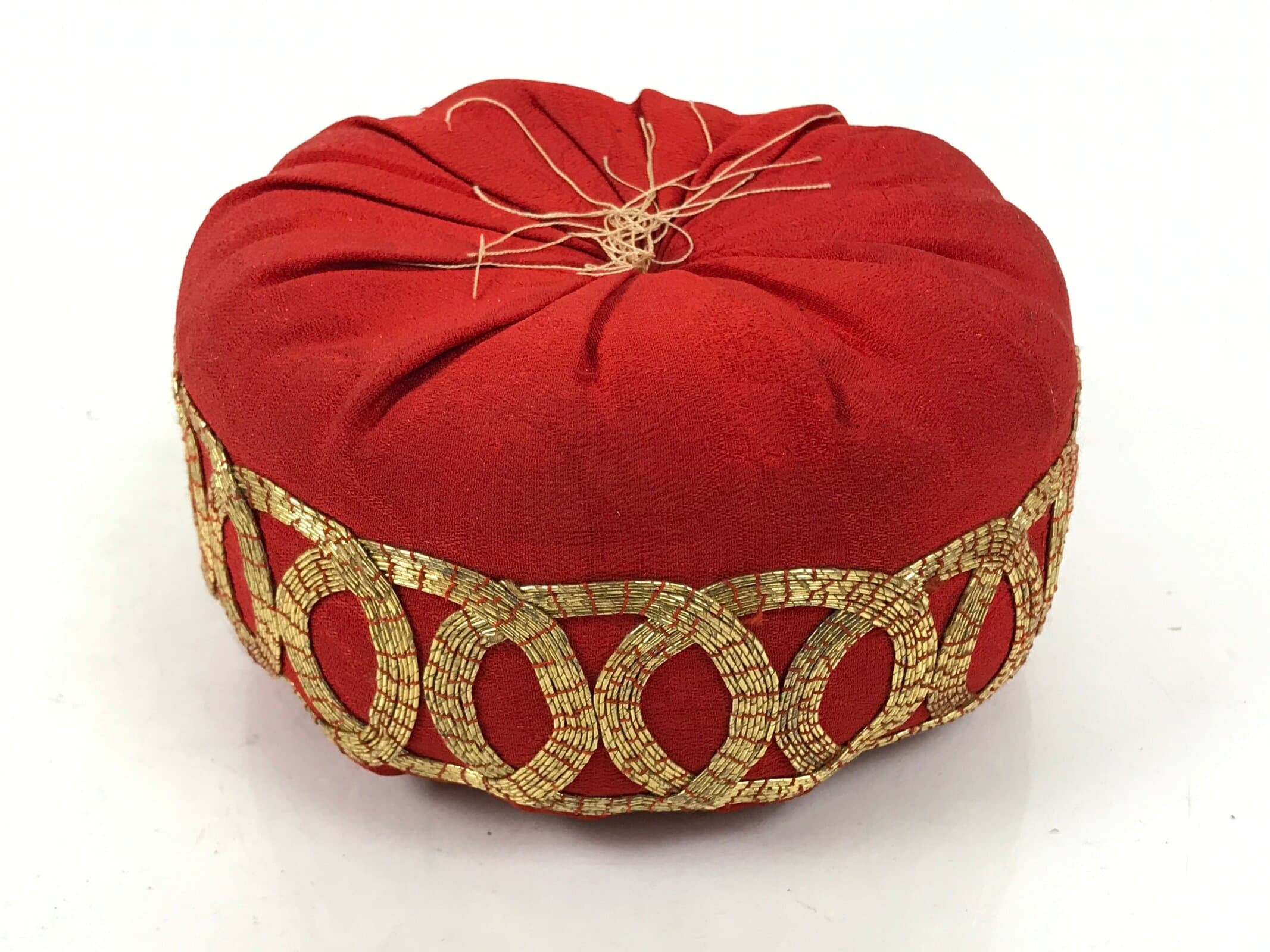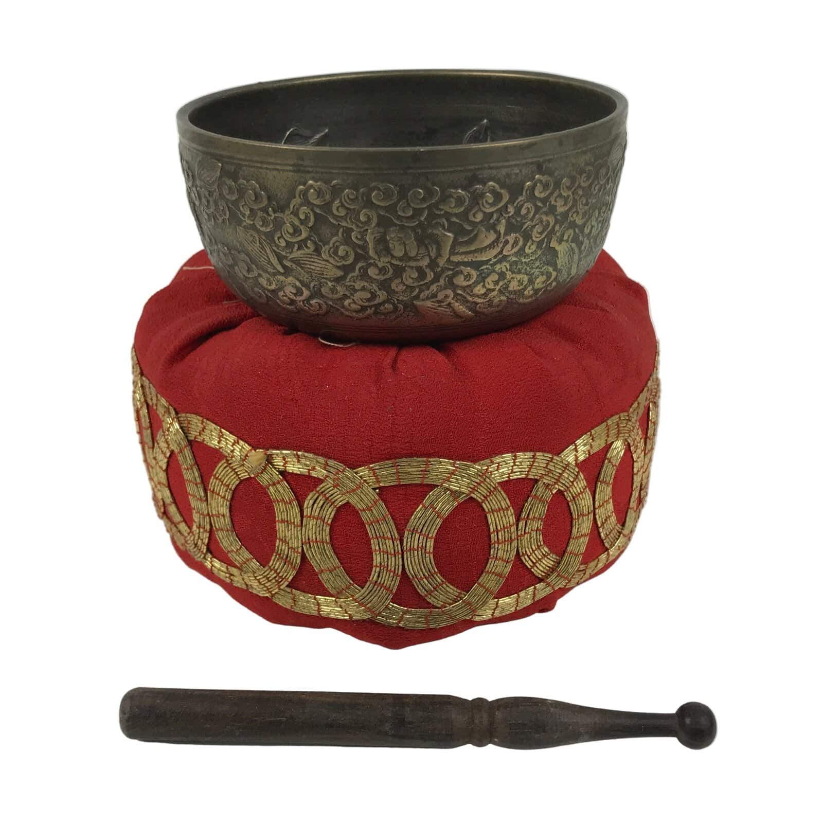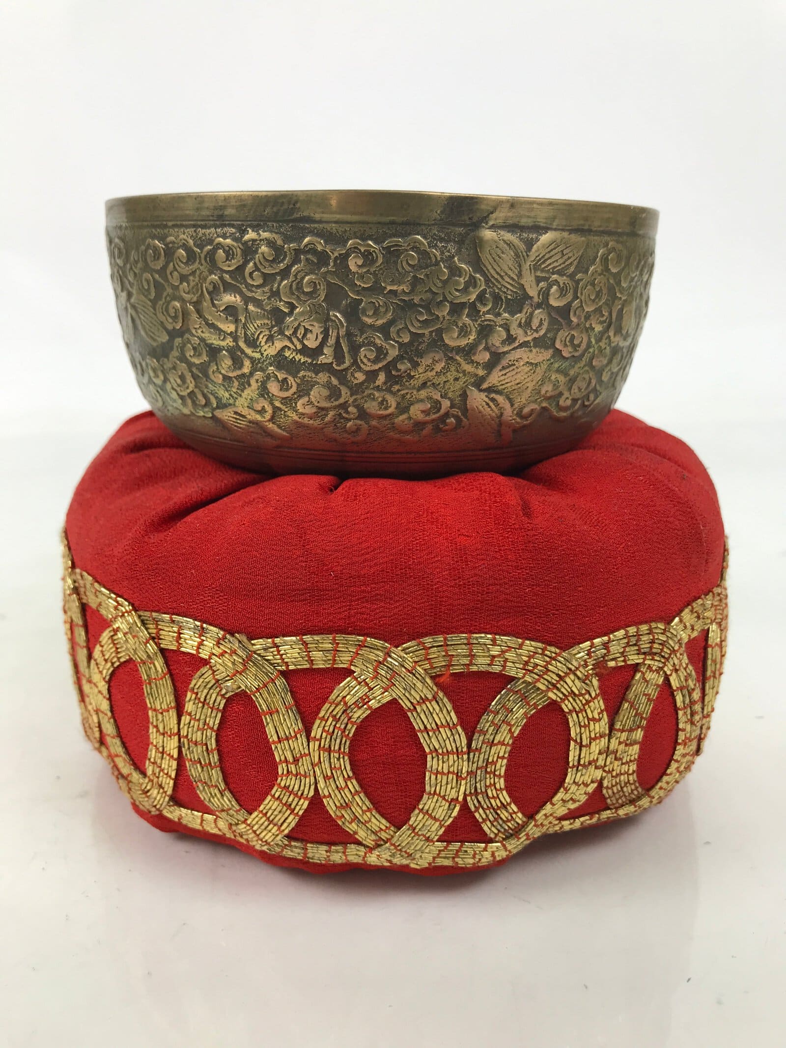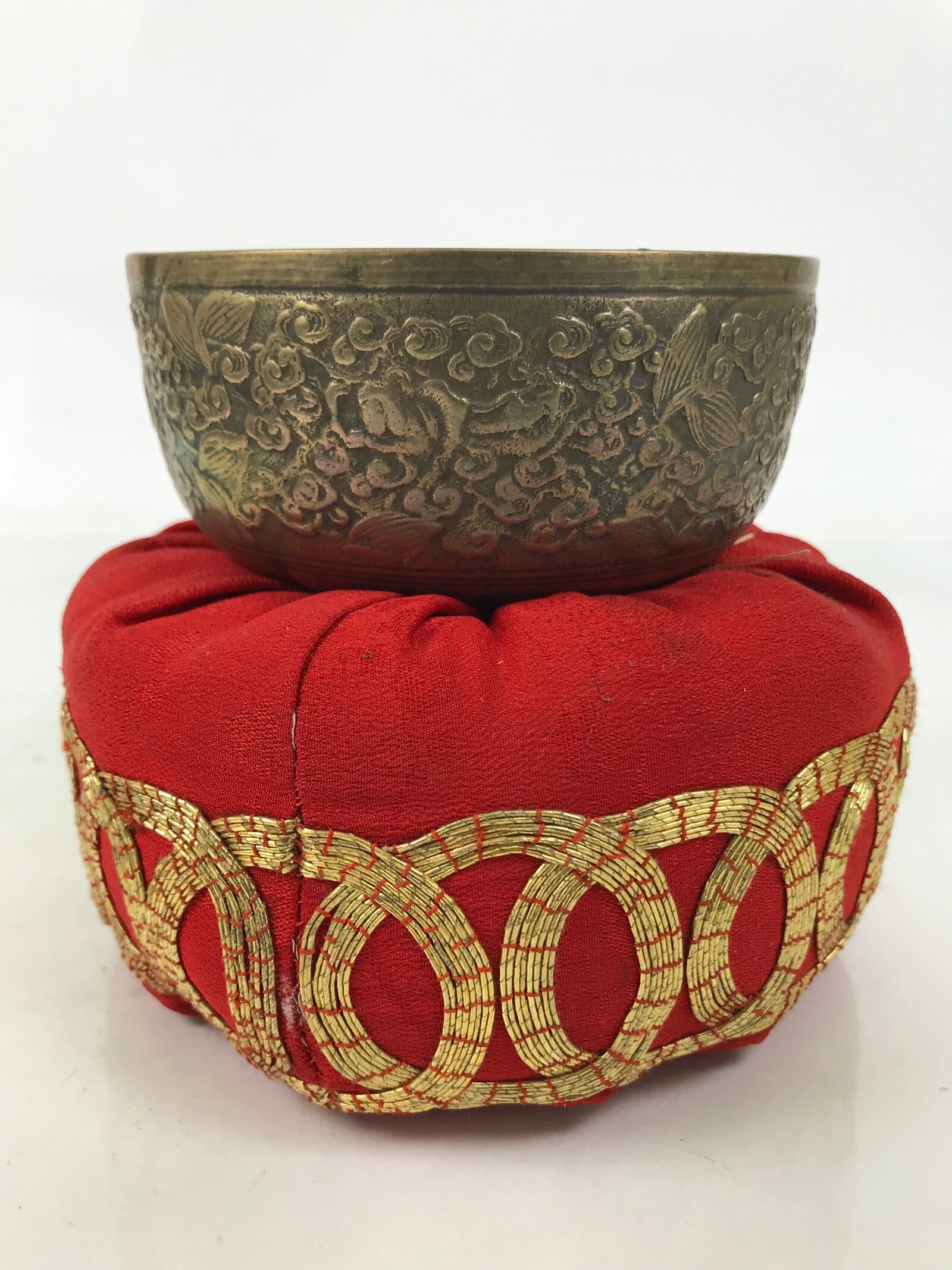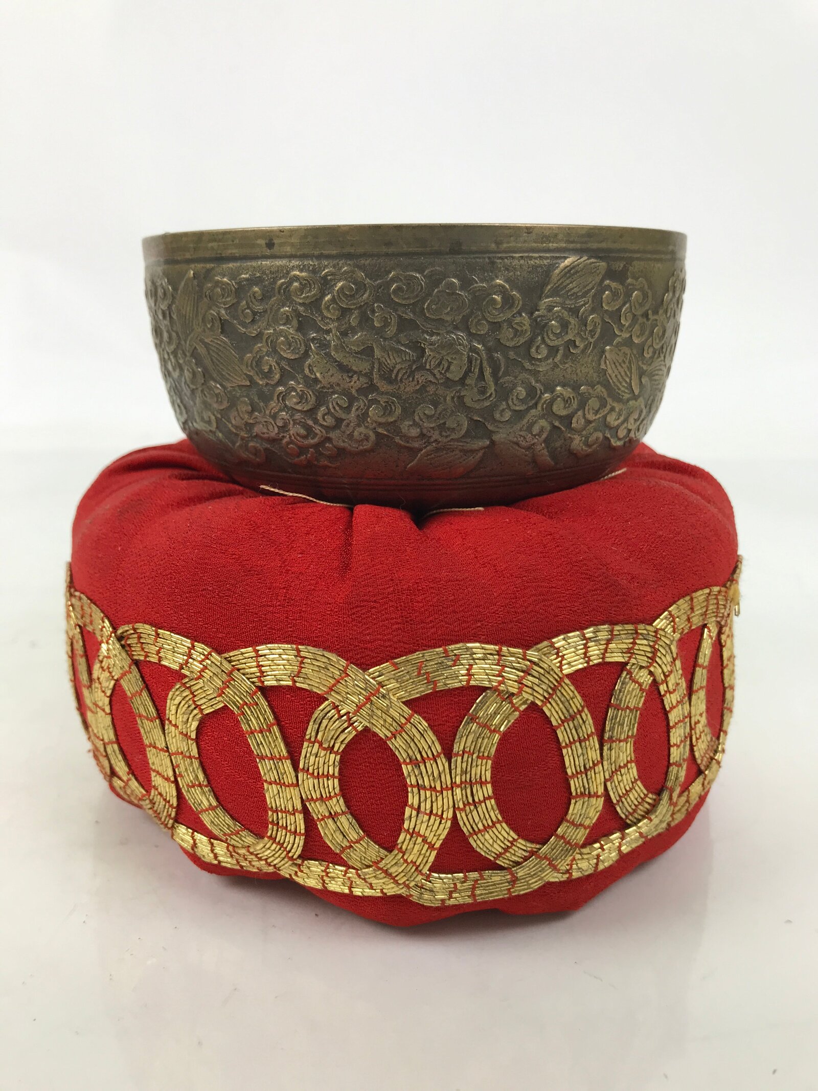 This is a vintage Japanese orin bell for Buddhist altars. It contains a brass bowl with a simple wooden striker. It rests on a platform-type pillow made of red fabric and gold embroidery. The bowl itself has a dense design on the outside that features leaves, vines, and guardian spirits. The inside of the bowl has a raised leaf design. Singing bowls are sounded during ritual prayer.
