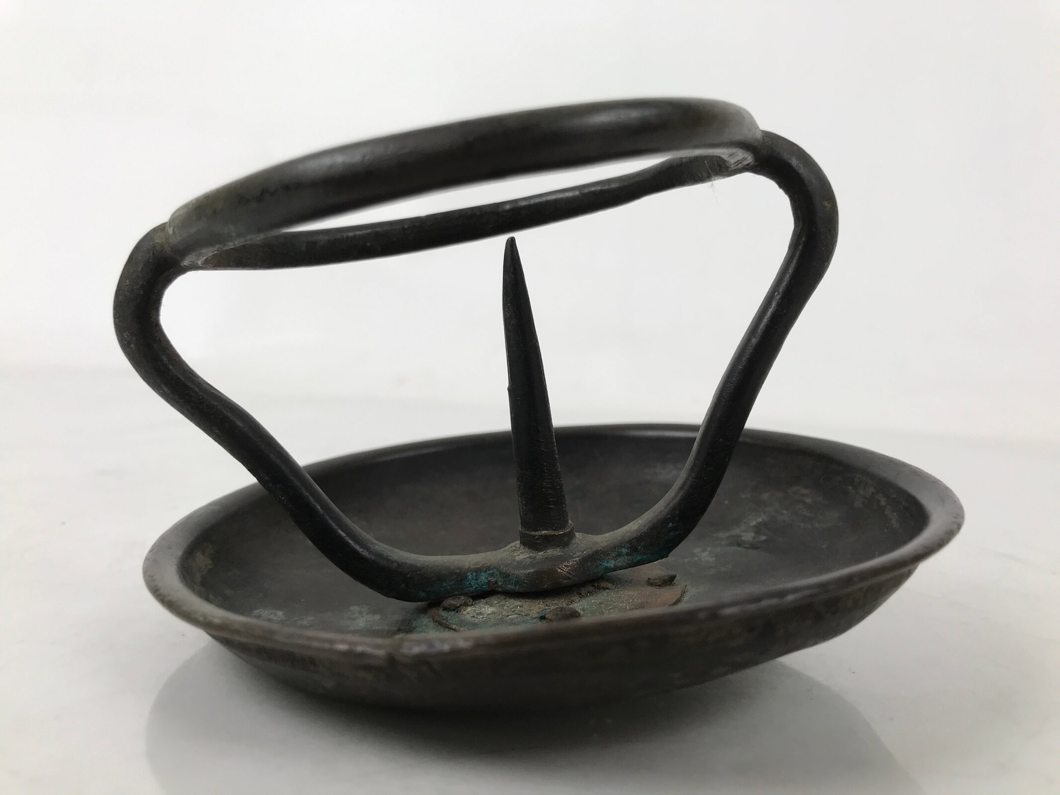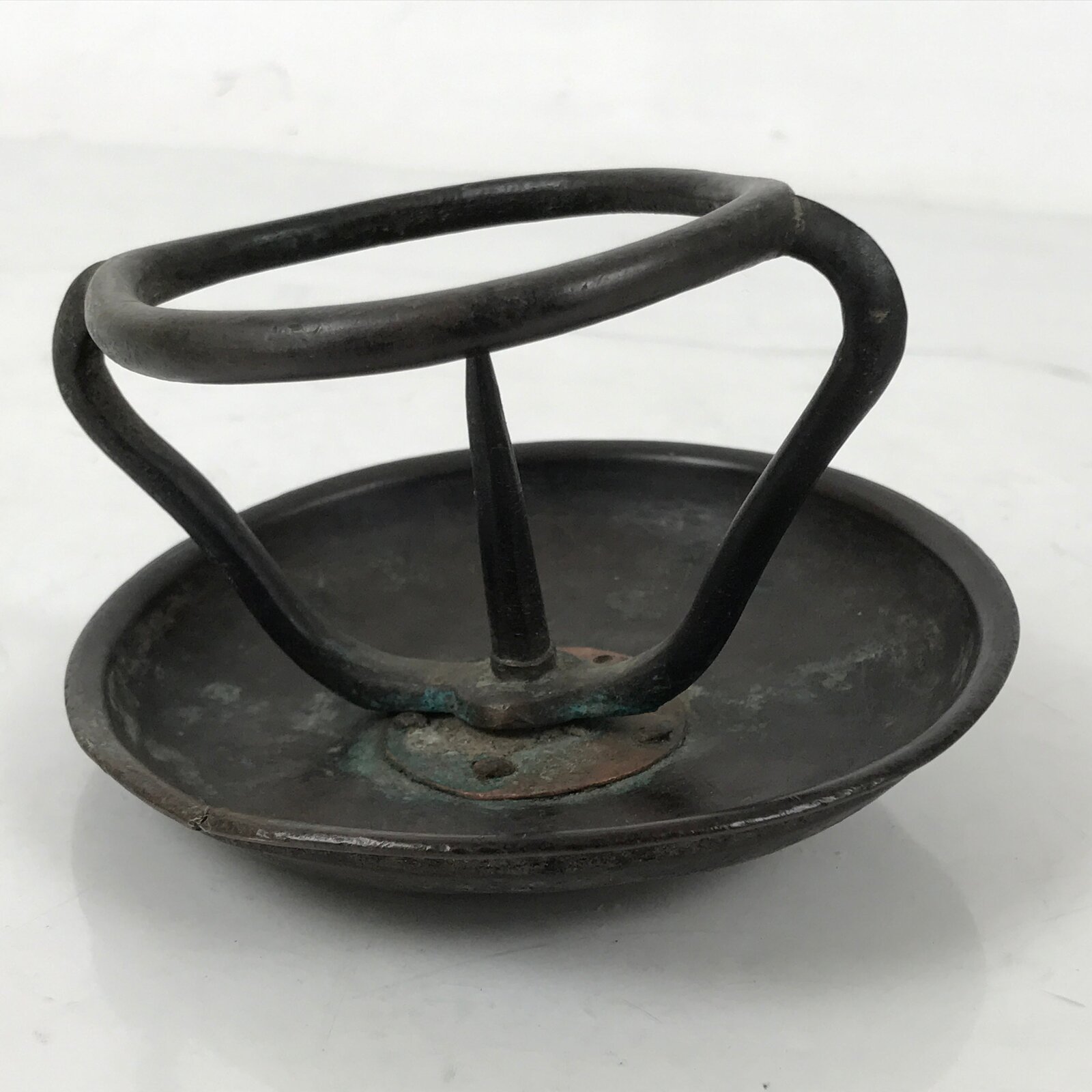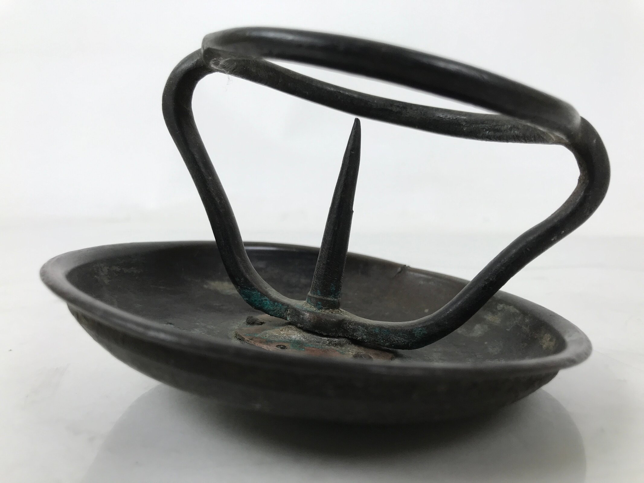 This item is a Japanese vintage Buddhist altar candle holder stand. It is part of a larger temple-sized shokudai stand. It has a spike for placing a thick candle on and a metal guard to keep it from tipping over. The underside shows where it has broken off from the pole and base. This piece can be repaired or used as-is.