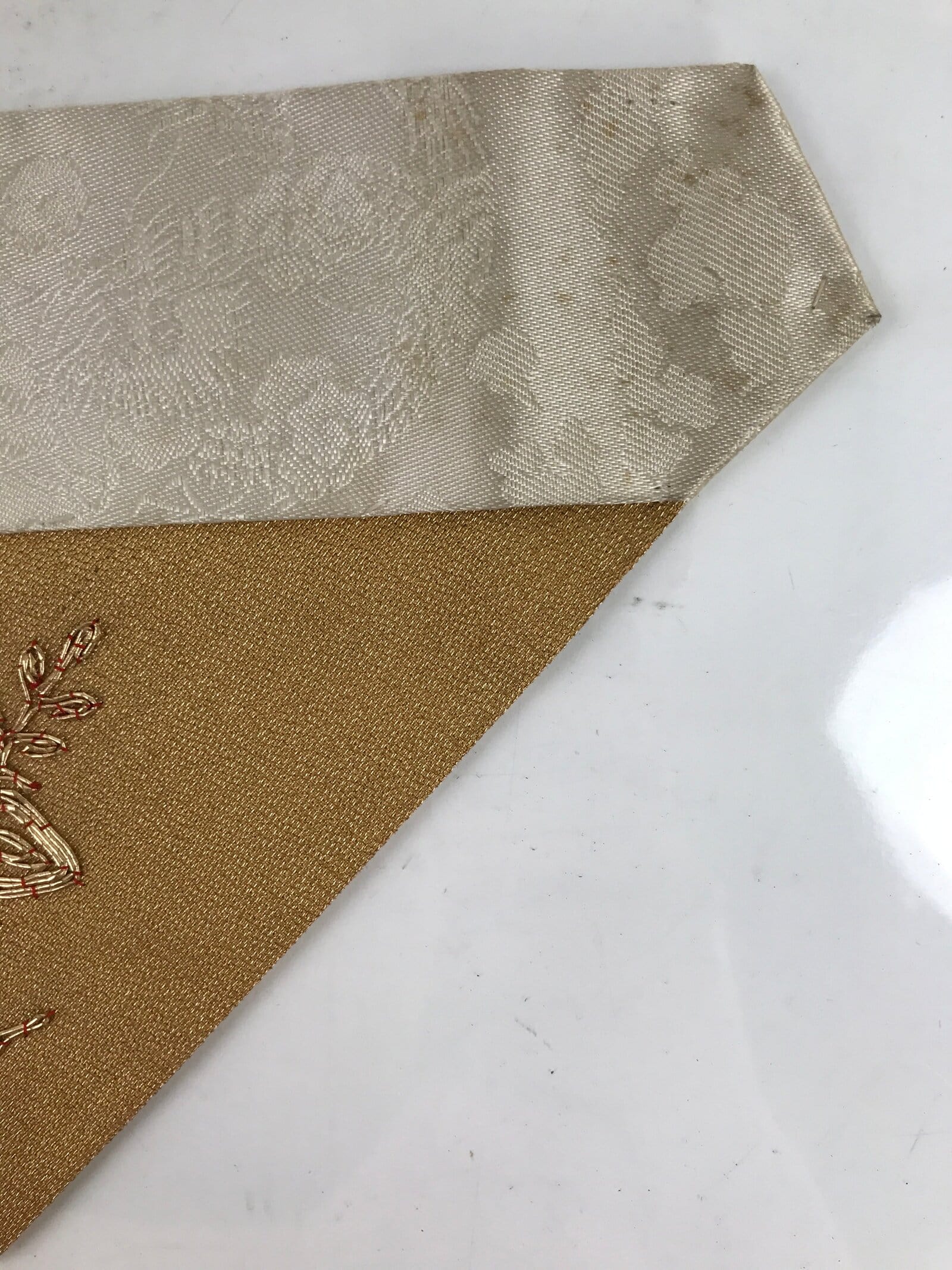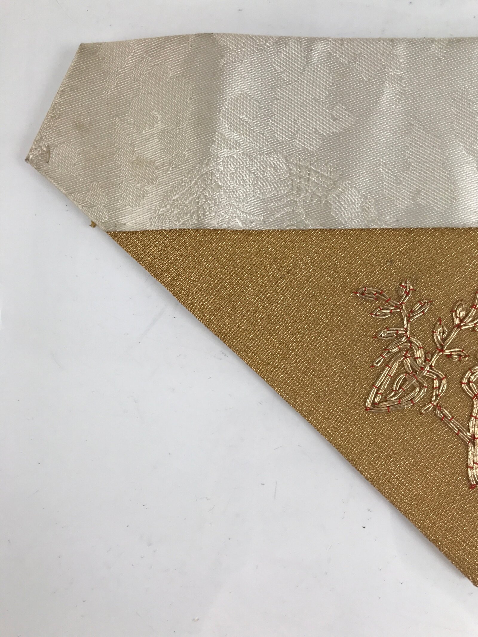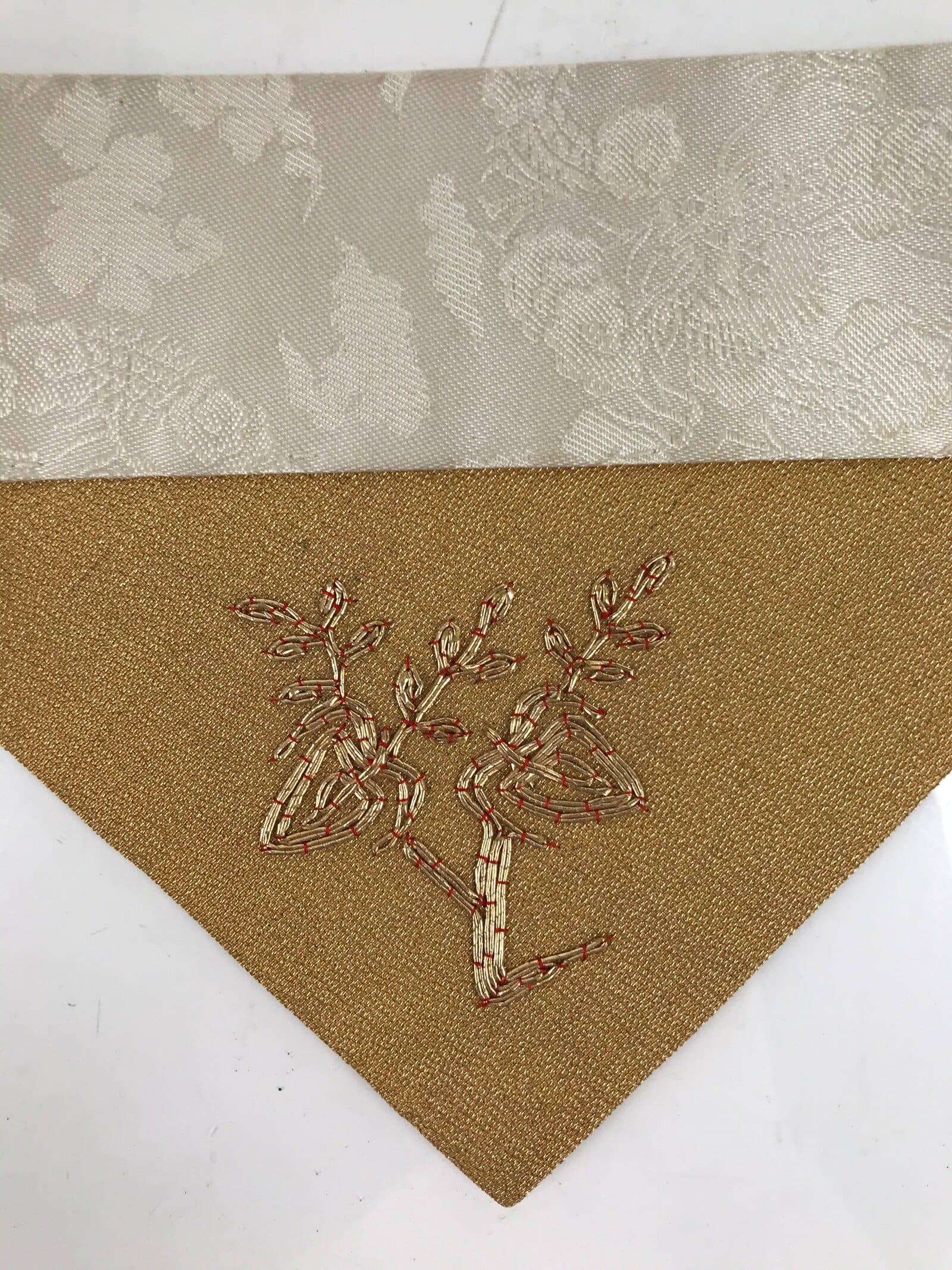 This is a vintage Japanese Buddhist altar tablecloth, or uchishiki. Made of silk and other woven fabric, the backside is white with a floral pattern while the front is gold with an embroidered gold floral pattern.