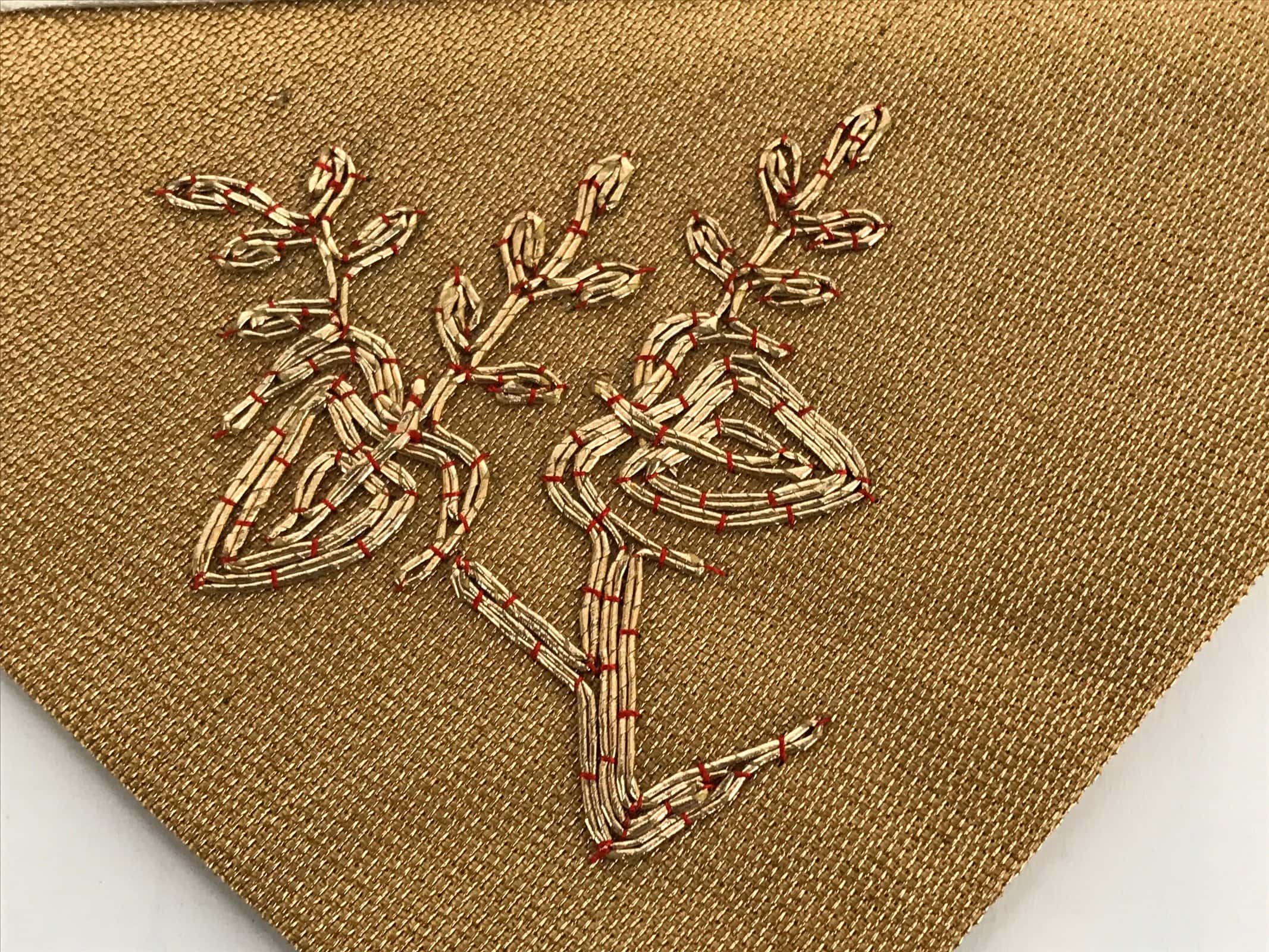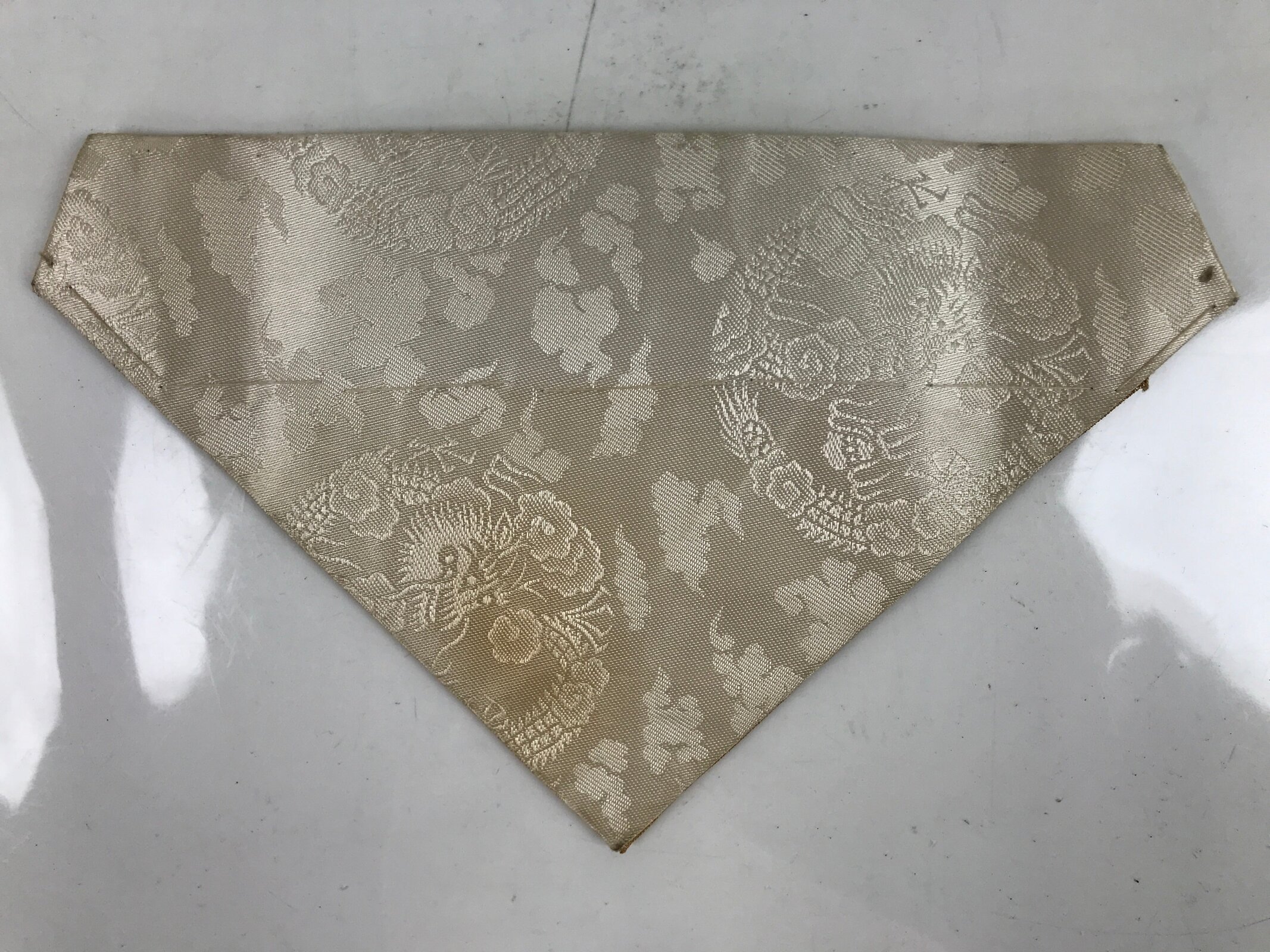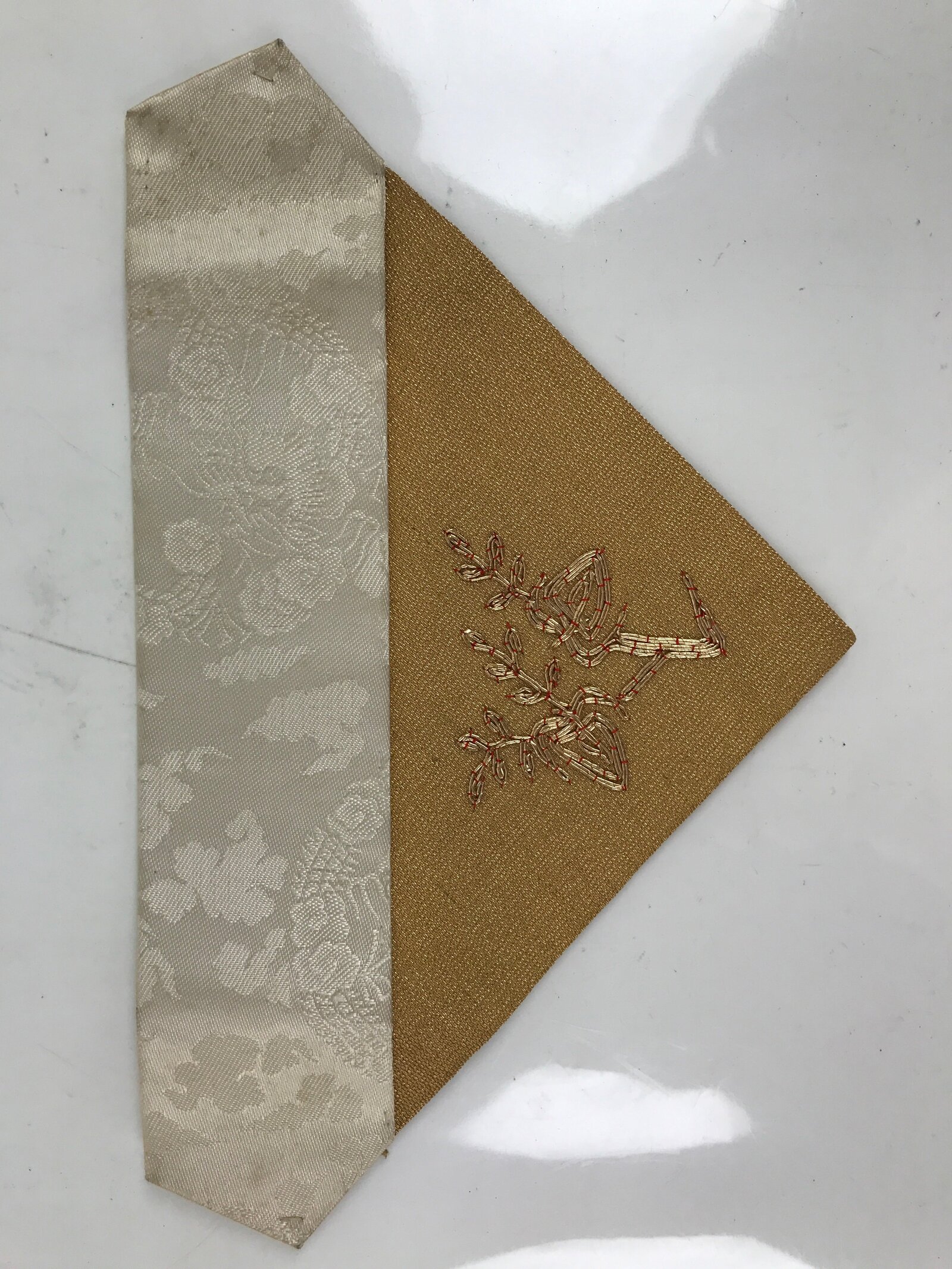 This is a vintage Japanese Buddhist altar tablecloth, or uchishiki. Made of silk and other woven fabric, the backside is white with a floral pattern while the front is gold with an embroidered gold floral pattern.