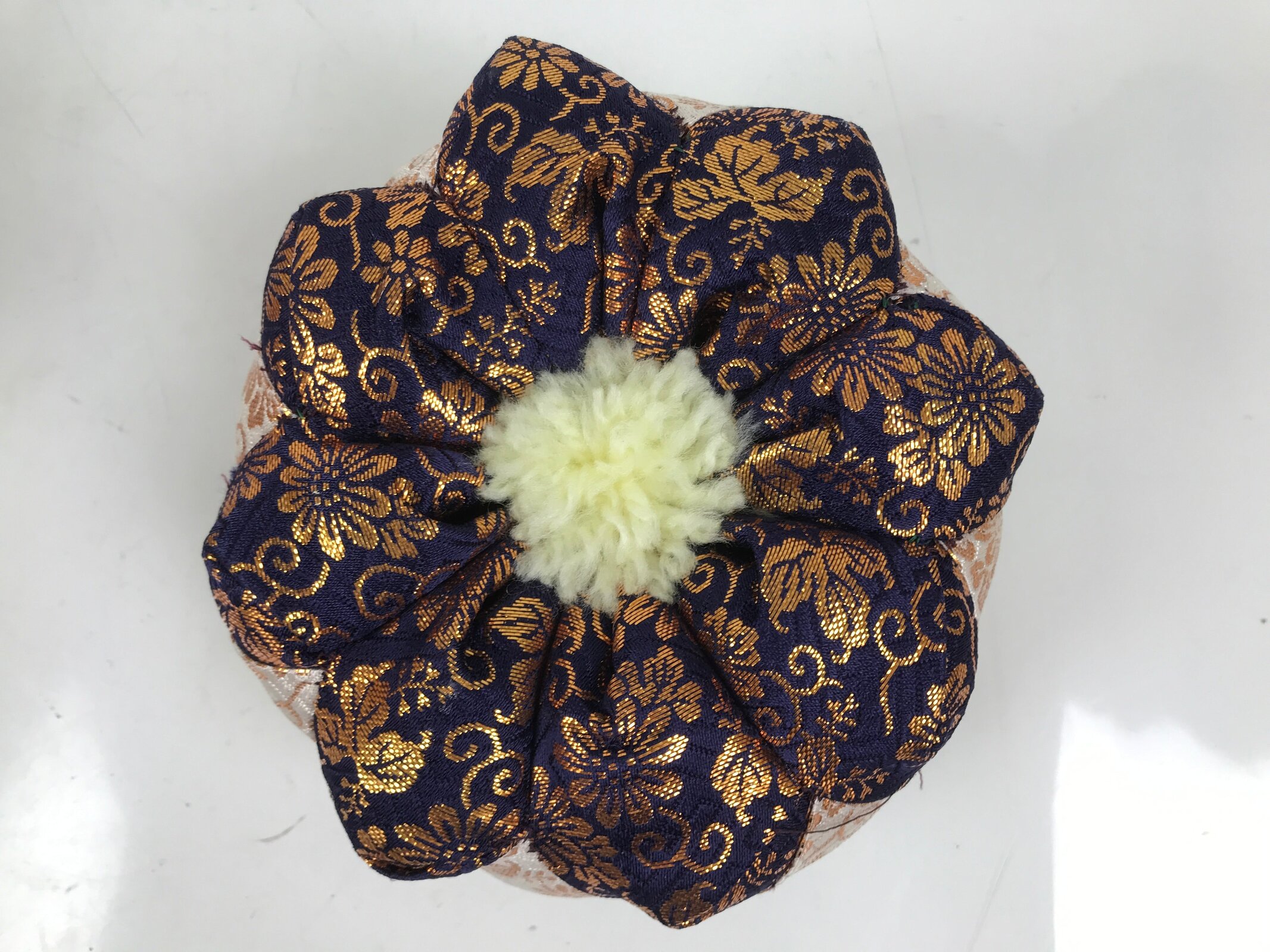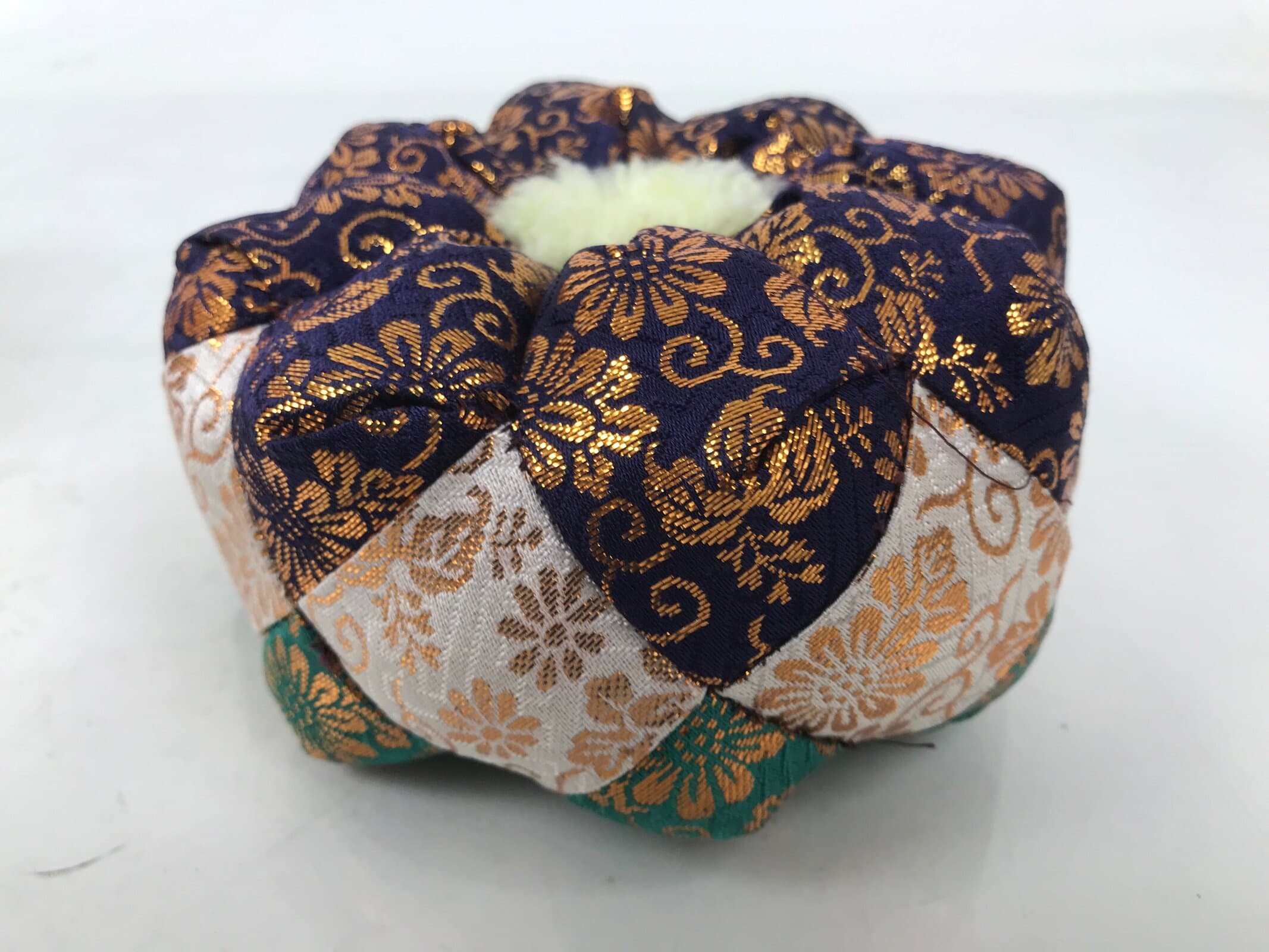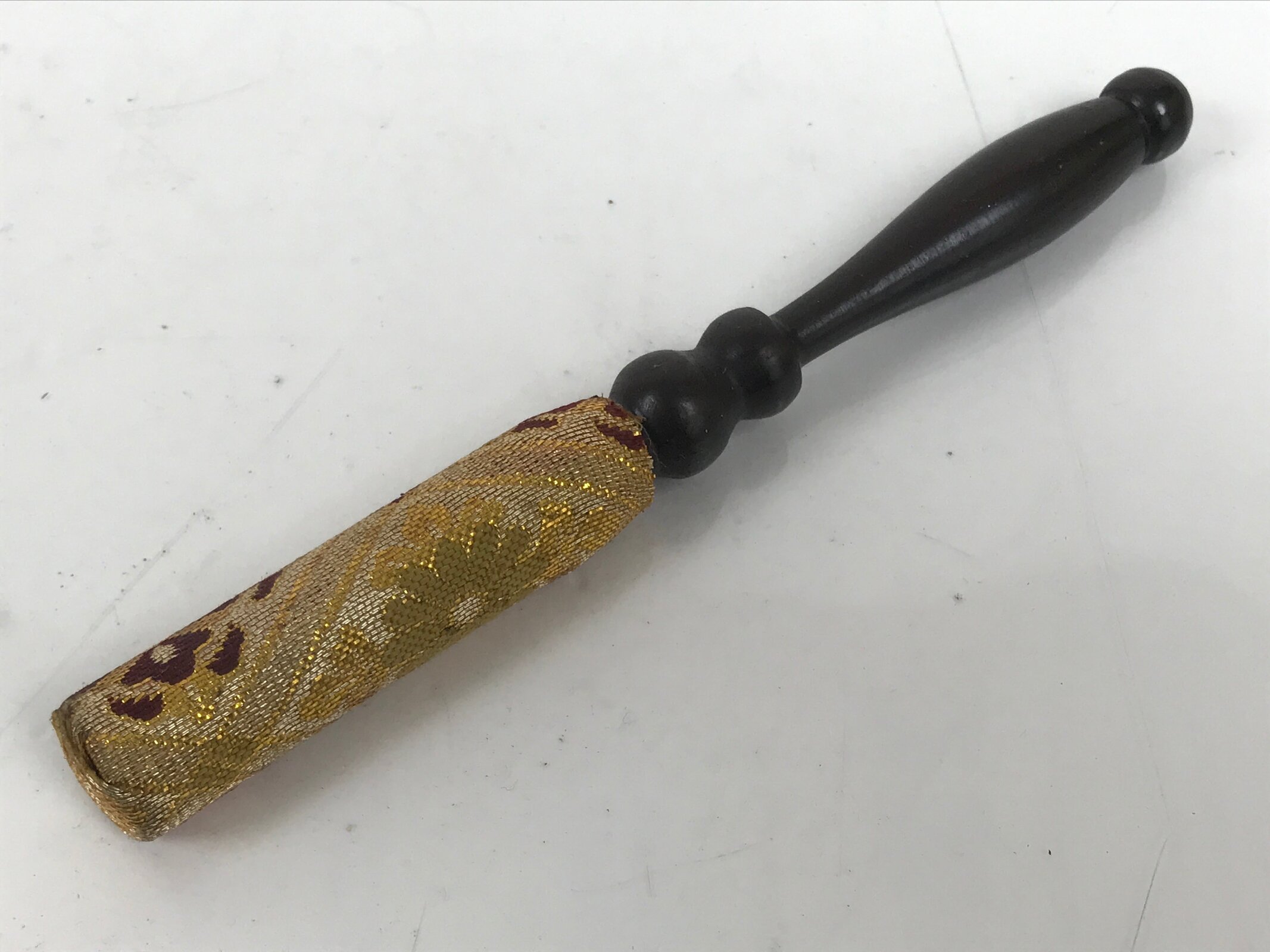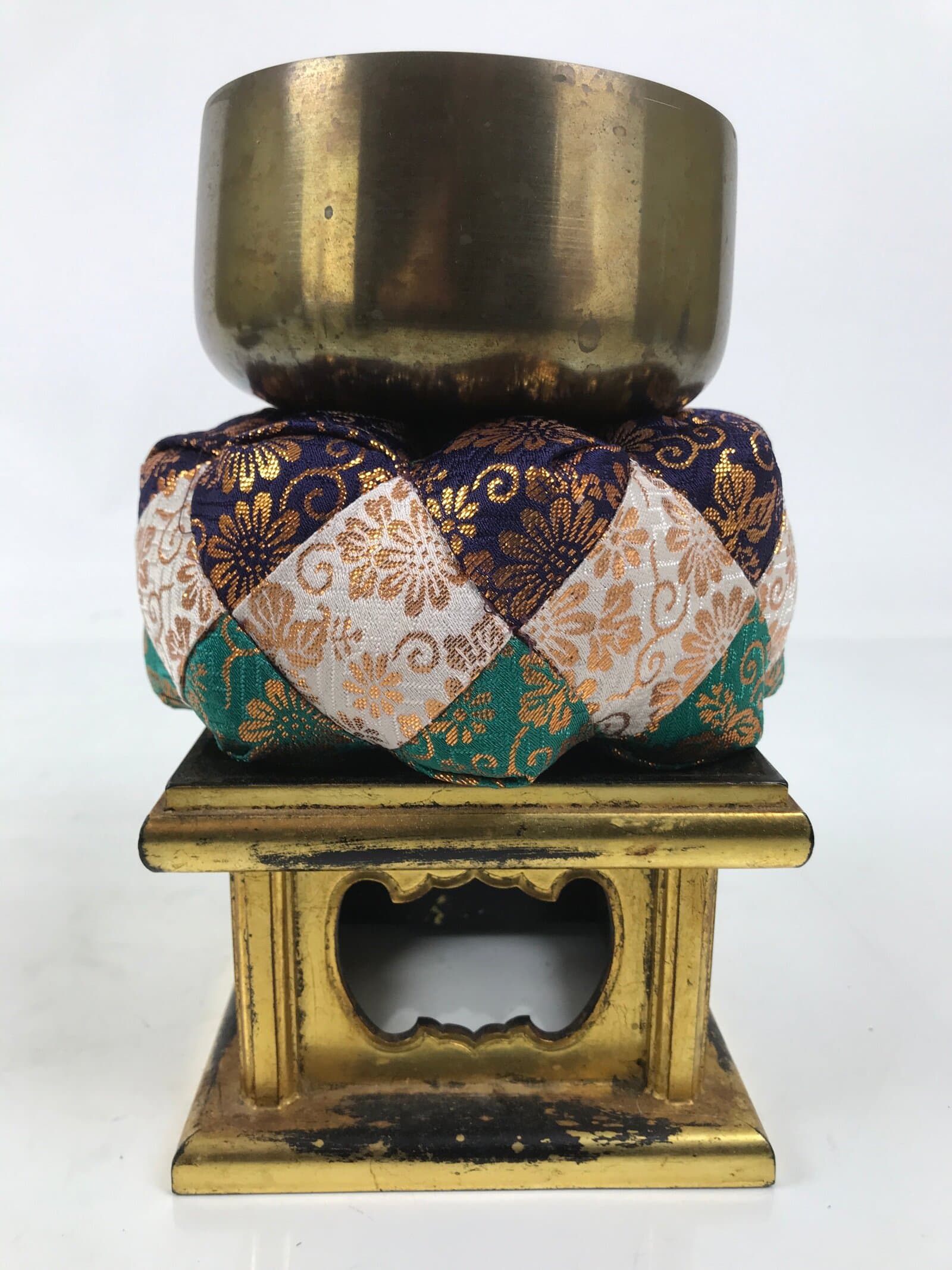 This is a vintage Japanese orin bell for Buddhist altars. It contains a brass metal bowl with a dark brown wooden striker that has silk fabric covering the striking end. It rests on an angular, rounded purple, white, teal, and gold silk pillow with light yellow yarn tassels. It also comes with a square black and gold resin stand.