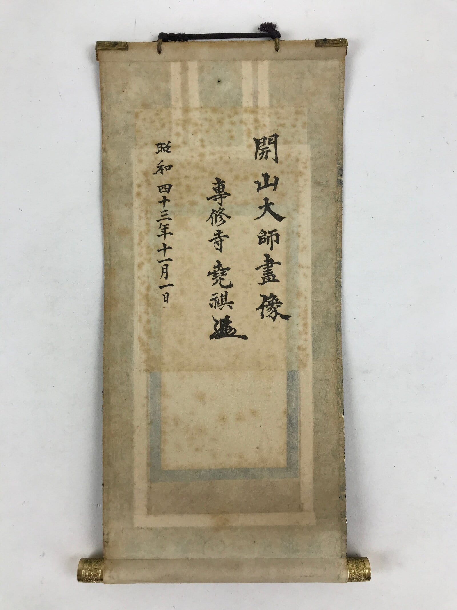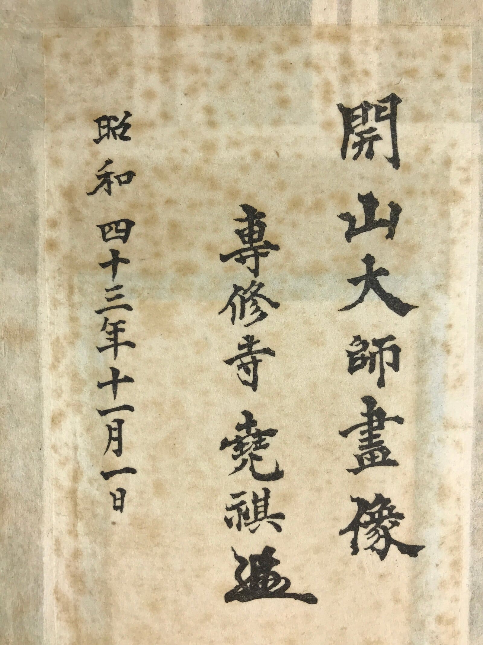 This is a Japanese hanging scroll that hangs on the Buddhist altar. The sect is Shinshu-Takada. This hanging scroll depicts the image of Shinran Shonin. On the back of the words say “Kaizan Daishi image statue, Senshu-ji Temple, October 1, 1968.