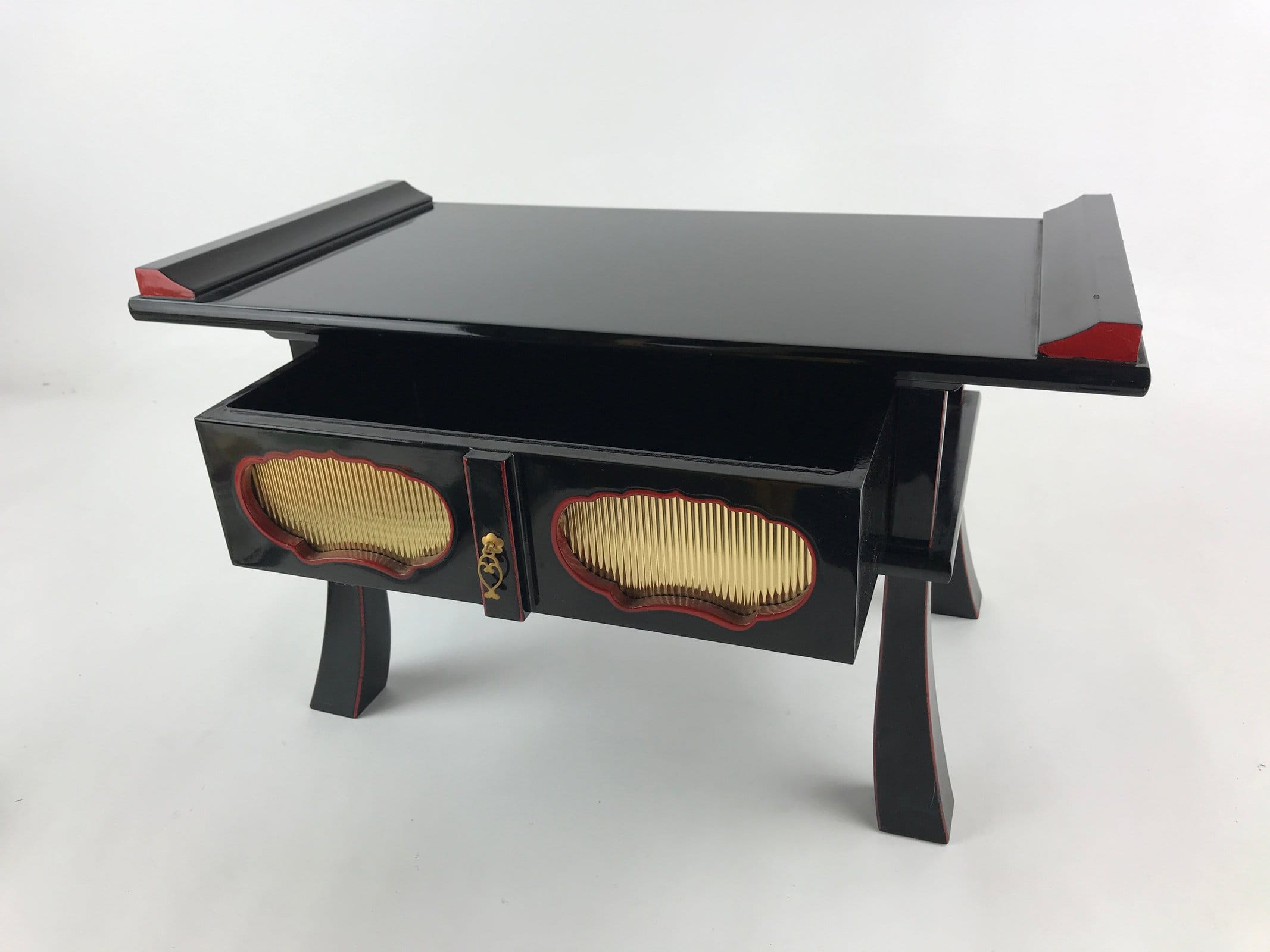 Painted with red, black, and gold lacquer, this vintage Japanese Buddhist kyozukue offering table with a traditional shape is a stunning focal point in any home altar. This piece contains a small drawer for items such as prayer beads, incense, and candles.