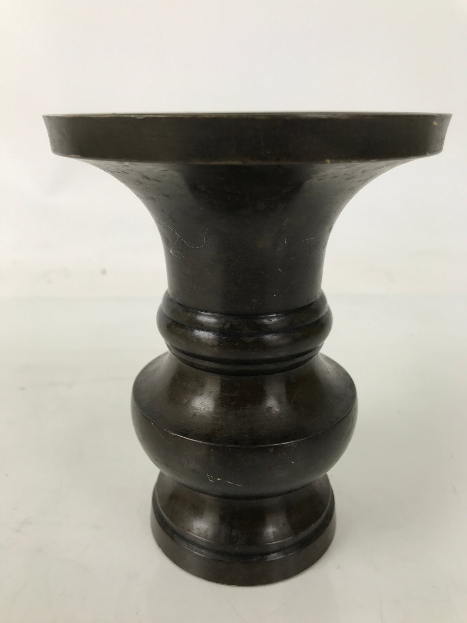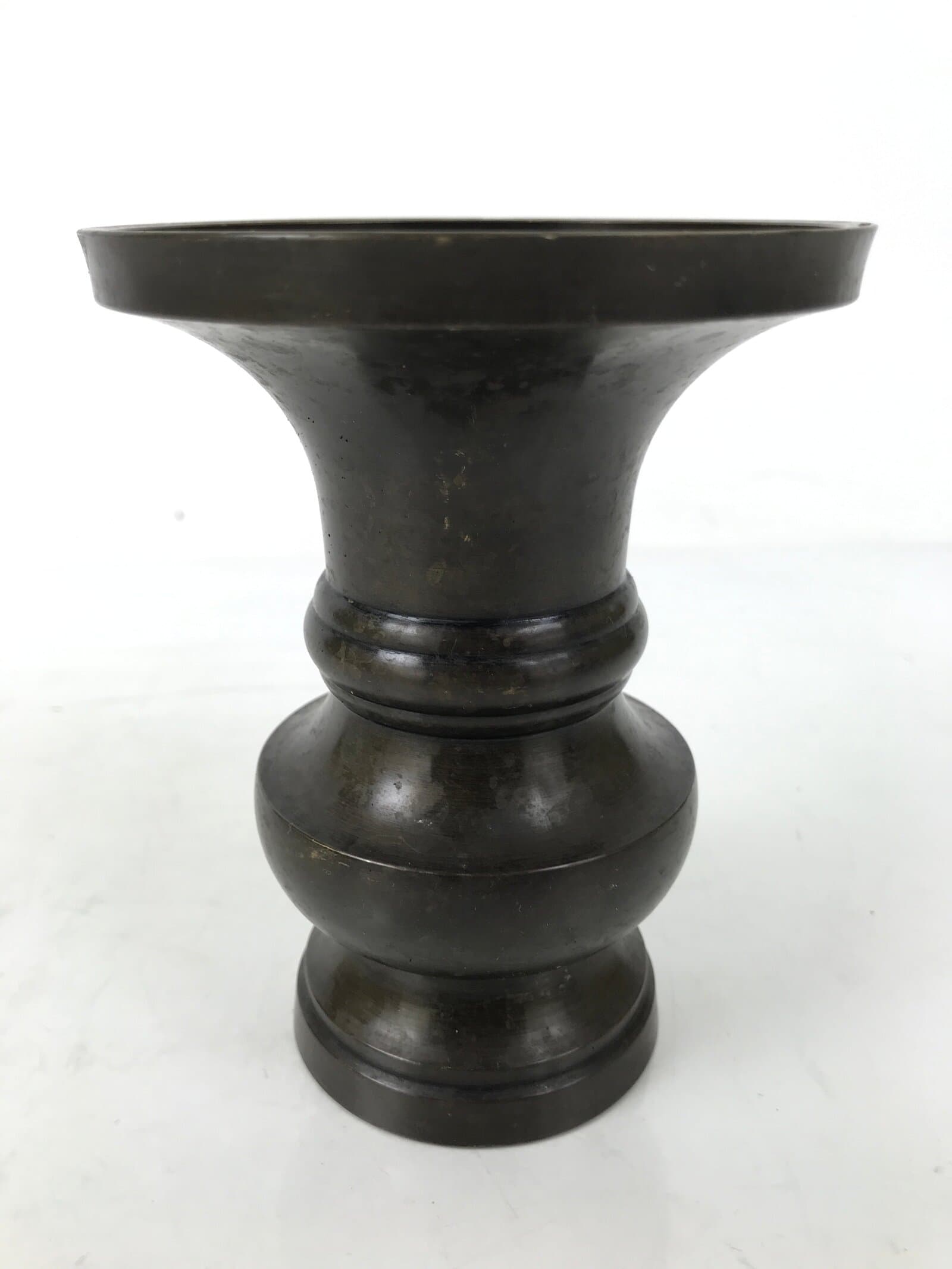 This is a vintage Japanese metal flower vase, or hanatate, for Buddhist altars. It is common to offer a range of seasonal and symbolic flowers in front of a Buddhist altar. It is also a vessel for Sakaki leaves or Shashagi leaves in Shinto. The offering of Sakaki tree leaves signifies that the gods living in the sakaki tree will protect the grave and the soul.
