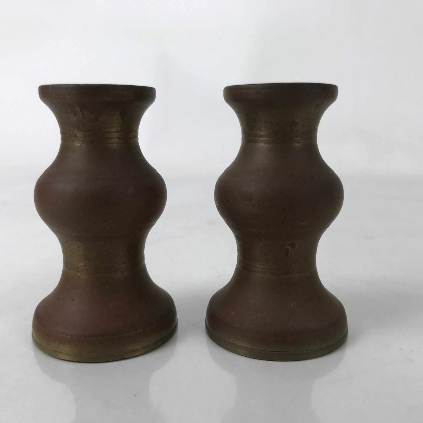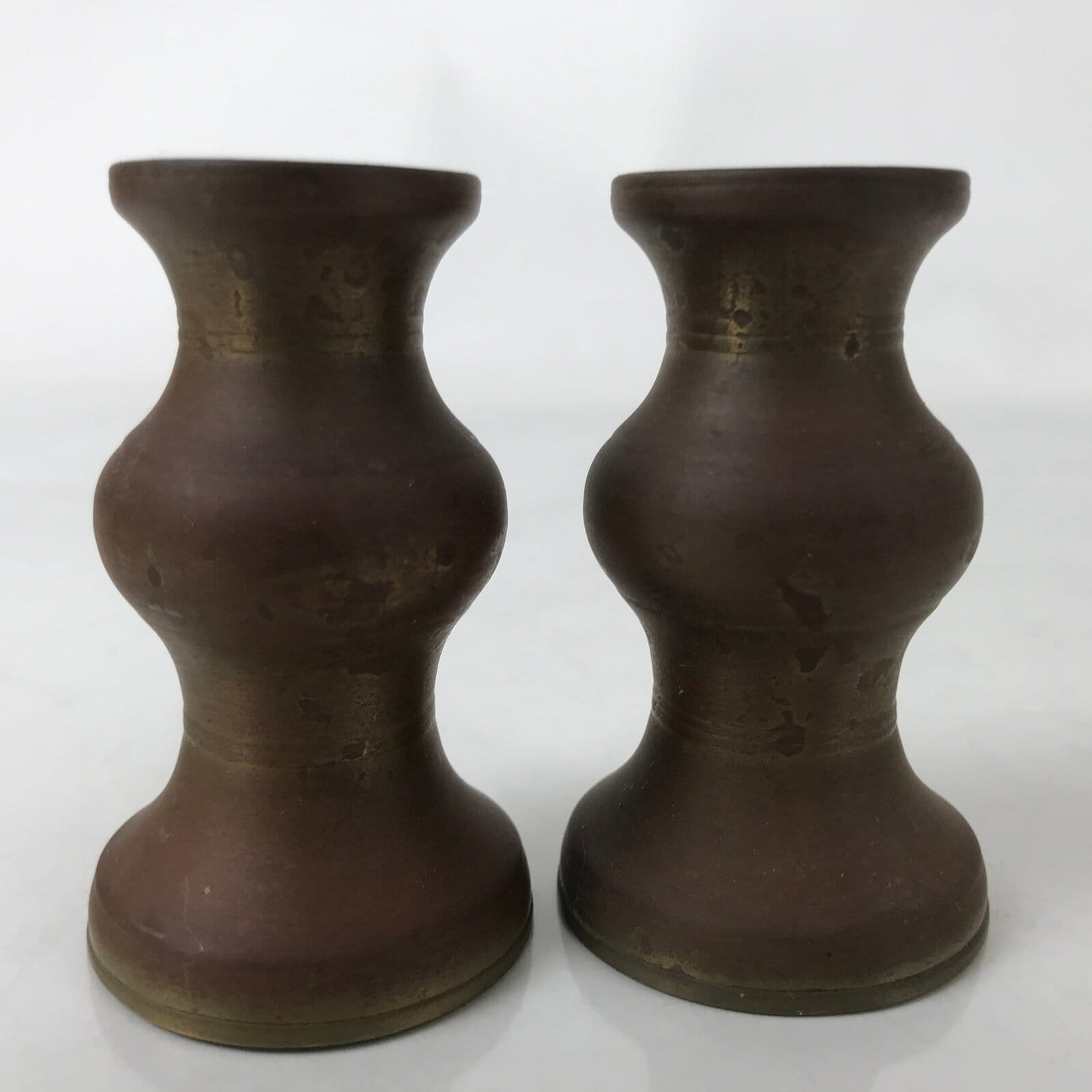 This is a vintage pair of metal flower vases, hanatate, for Buddhist altars. It is common to offer a range of seasonal and symbolic flowers in front of a Buddhist altar. It is also a vessel for Sakaki leaves or Shashagi leaves in Shinto. The meaning of offering sakaki tree leaves is that the gods living in the sakaki tree will protect the grave and the soul. These particular brushed bronze-looking vases are very simple in design, rounded with no added embellishments or designs. They each can hold individual or very small collections of flowers.