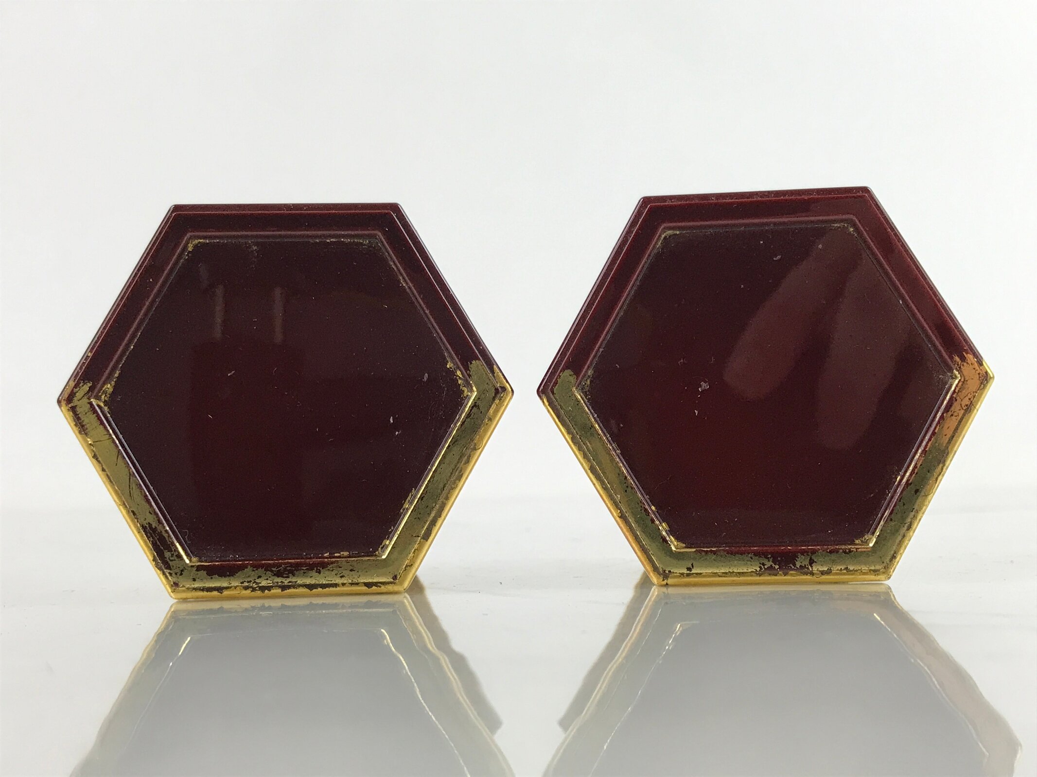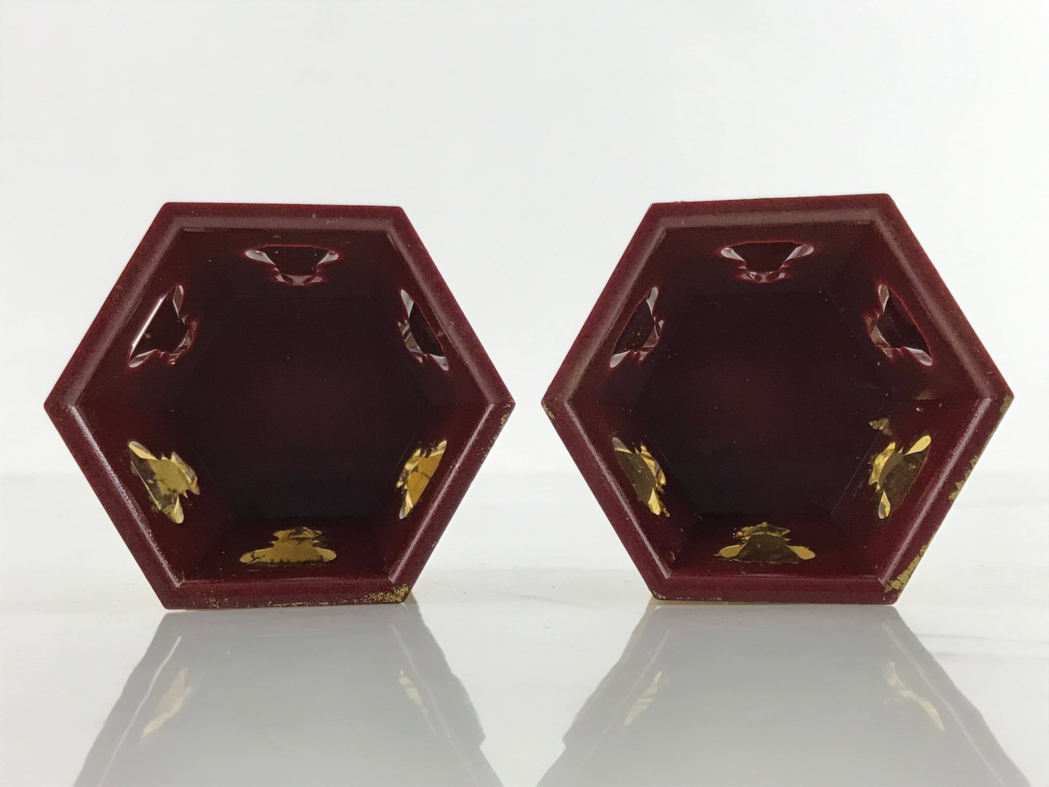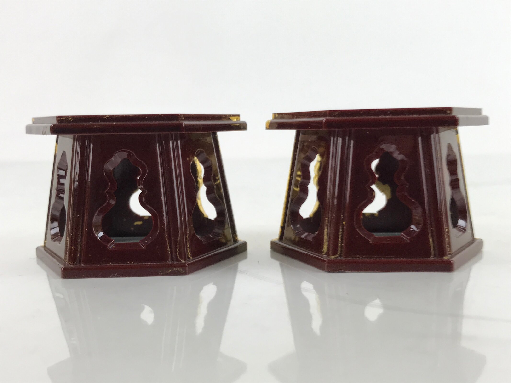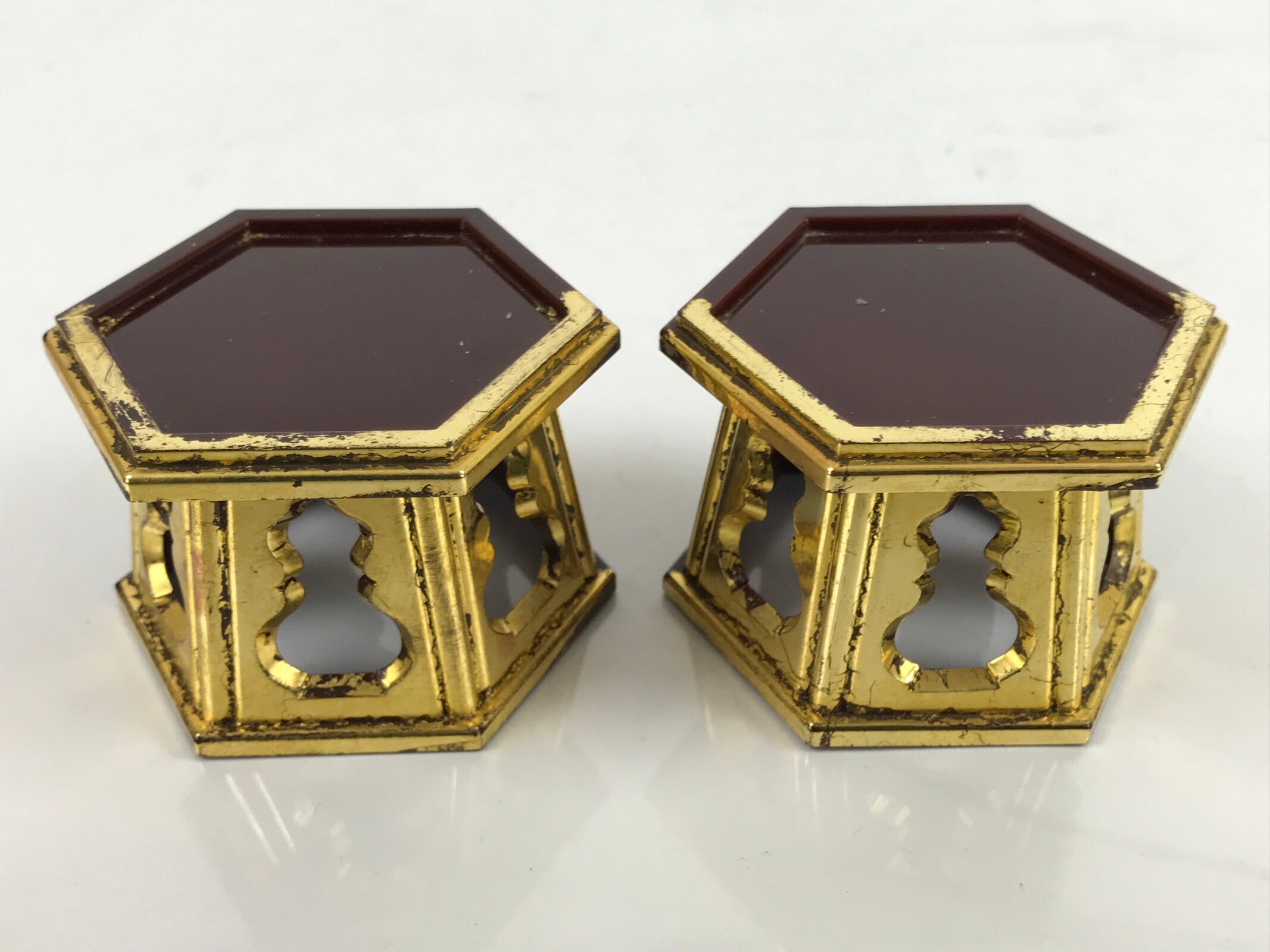 This is a pair of Japanese offering cup stands for a Buddhist altar. Also called bukki, this important altar accessory is coated with gold and reddish brown lacquer and has a simple hexagonal shape. It is used often in pairs to hold small cups of rice, sake, and more as an offering to Buddha and one’s ancestors.