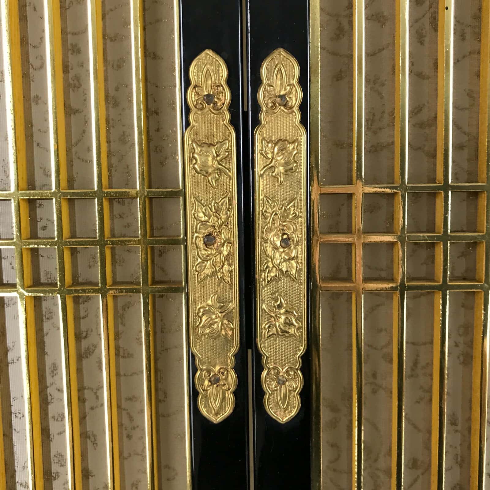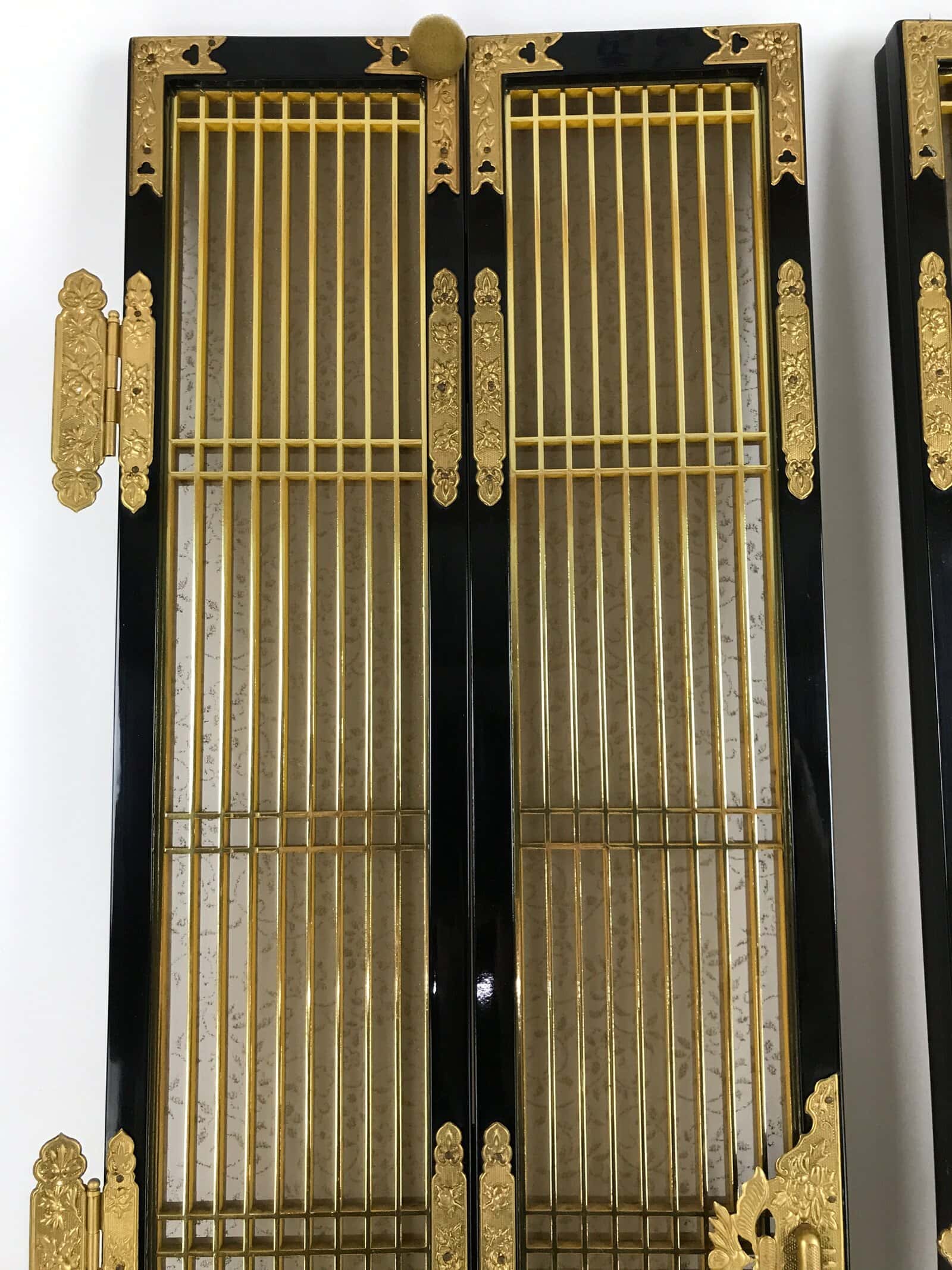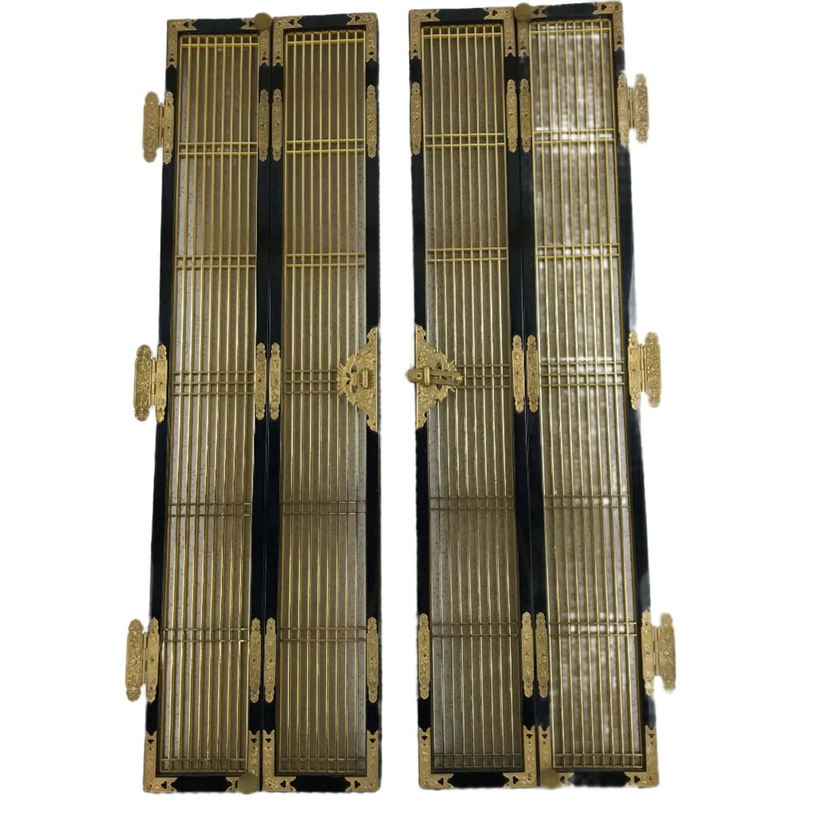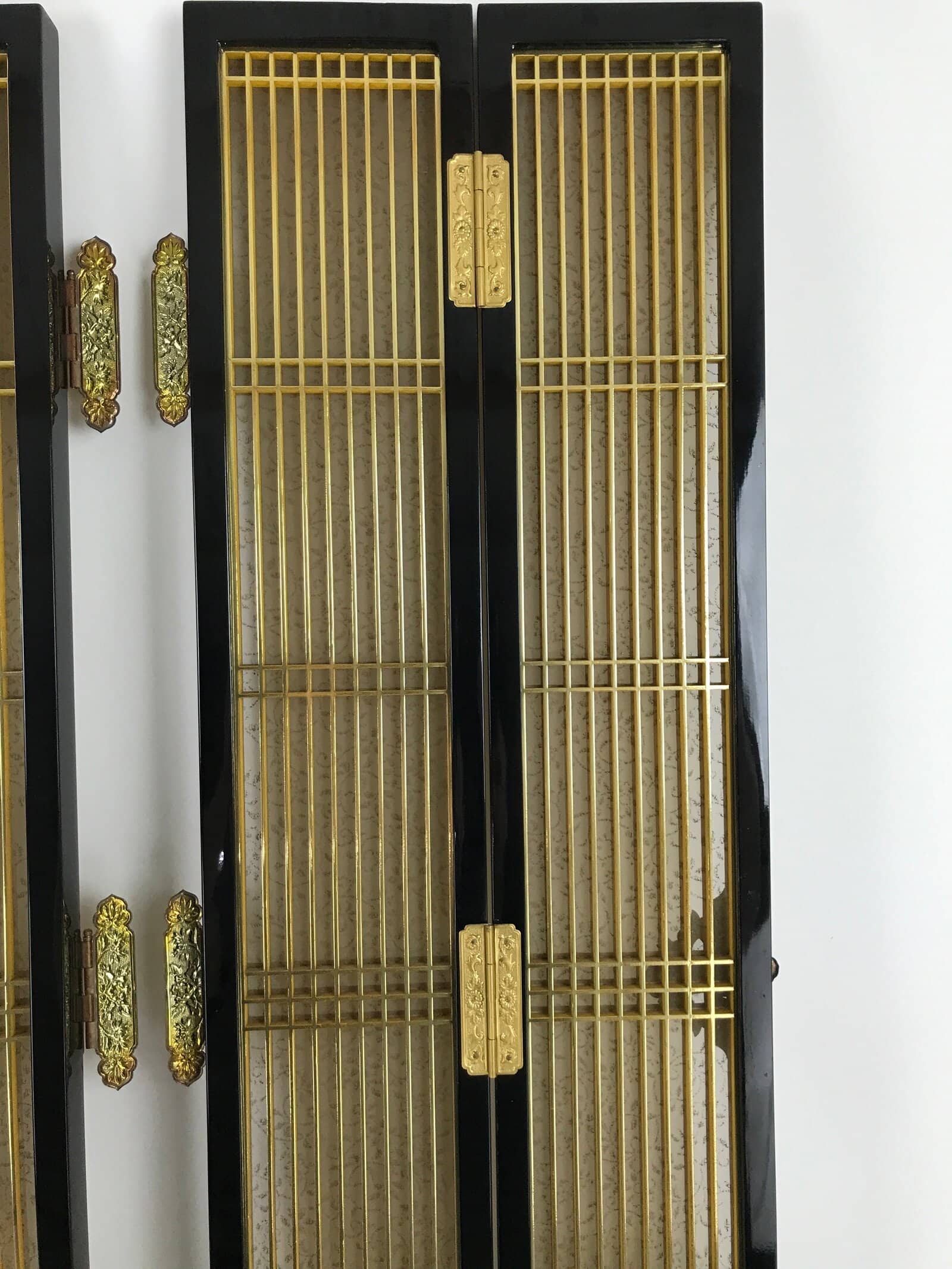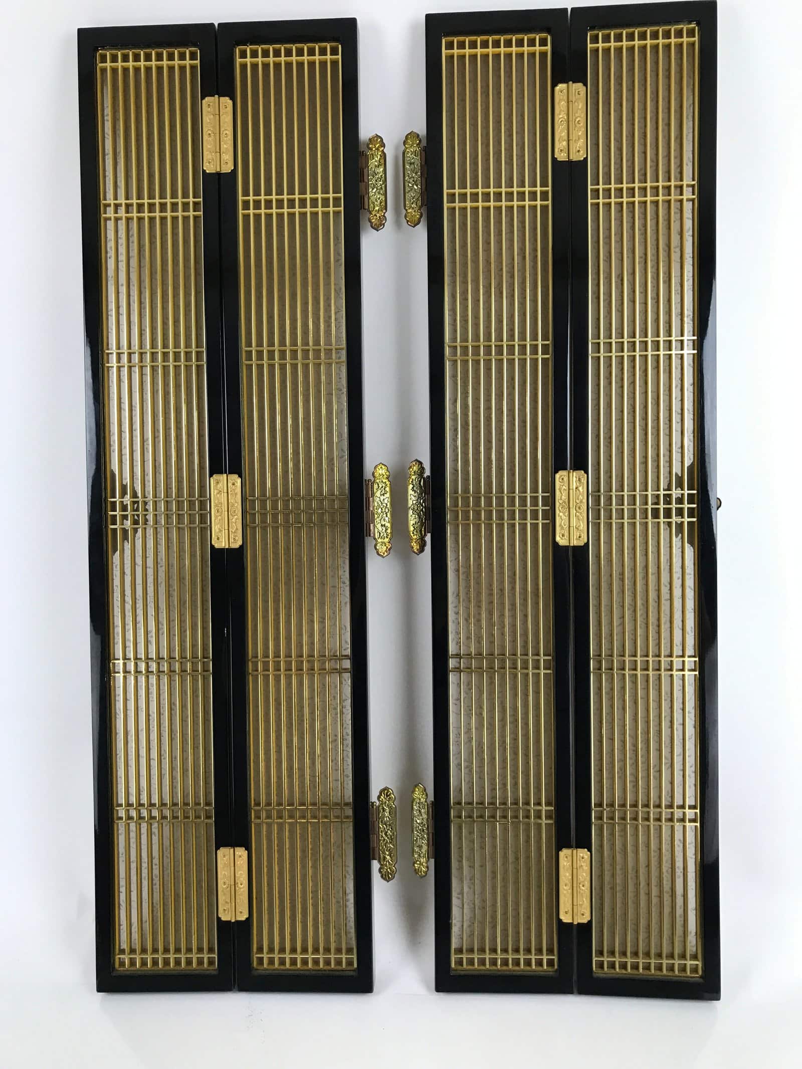 This is a 2-piece set of inner doors coming from a Japanese vintage wooden Buddhist altar cabinet. The two doors, a total of four tall panels, showcase a slatted front and back with a light mesh fabric material with a twisting vine (karakusa) pattern on the inside for airflow. There are brass metal plate embellishments on the border as well as the hinges that feature chrysanthemums and peonies.