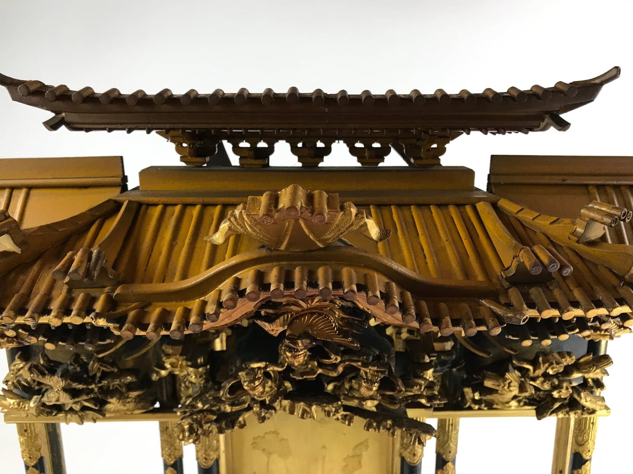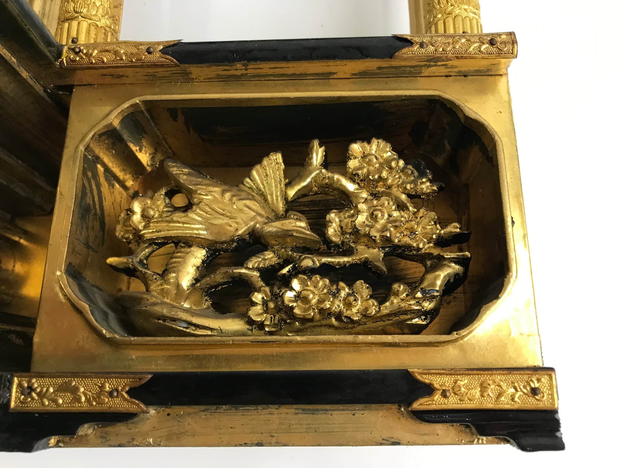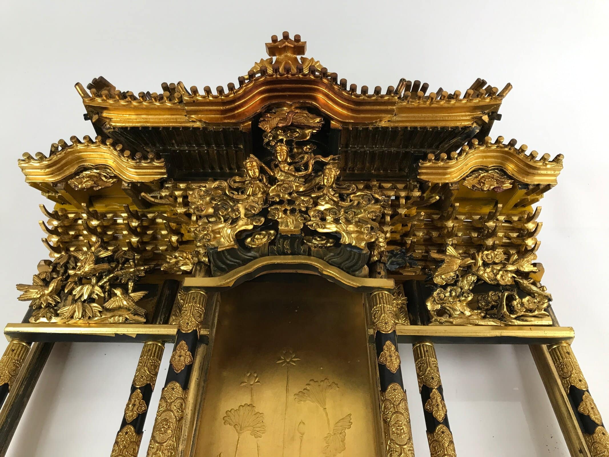 This item is a large decorative part from a Japanese vintage wooden Buddhist altar cabinet. This piece is the inner temple and the main feature of the altar. Typically it houses a statue and small scrolls at the back. It is a stunning piece with 3D carved wood pieces and decorations exactly as one might see in a real Japanese temple. It is mostly gold with a black lacquered base and brass embellishments throughout. It has an embossed brass plate at the back depicting a pond scene. There are numerous bird and floral motifs throughout.