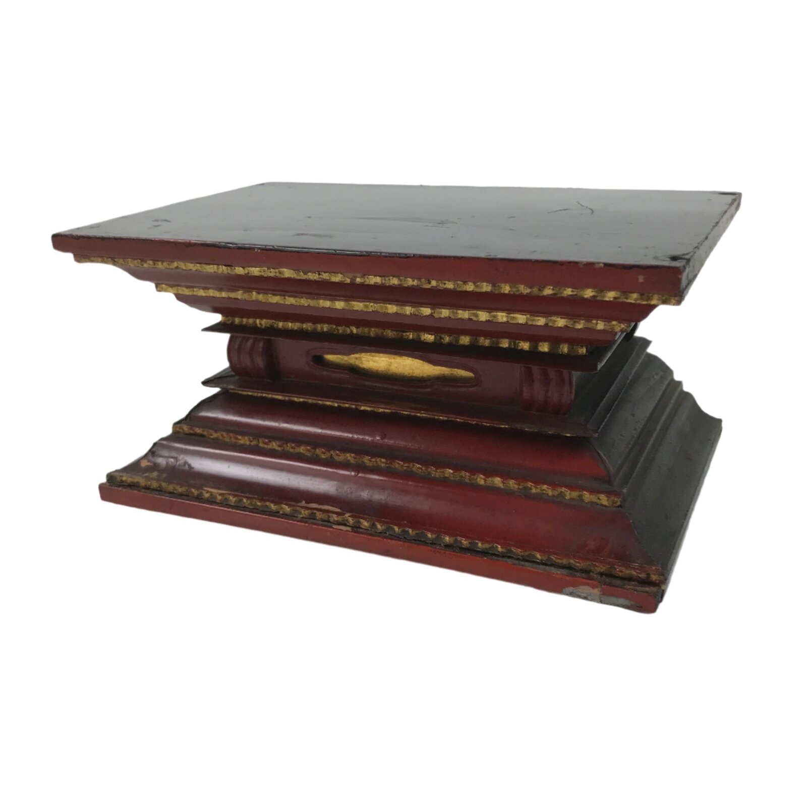 This is an antique Japanese part of a Buddhist altar, or butsudan. It is called shumidan or Sumeru Altar. It is the last tier before reaching the Buddha in this representation. The design is carved and constructed from wood and features simple scalloped border pieces. It is lacquered with mostly red with a black top piece and gold accents.