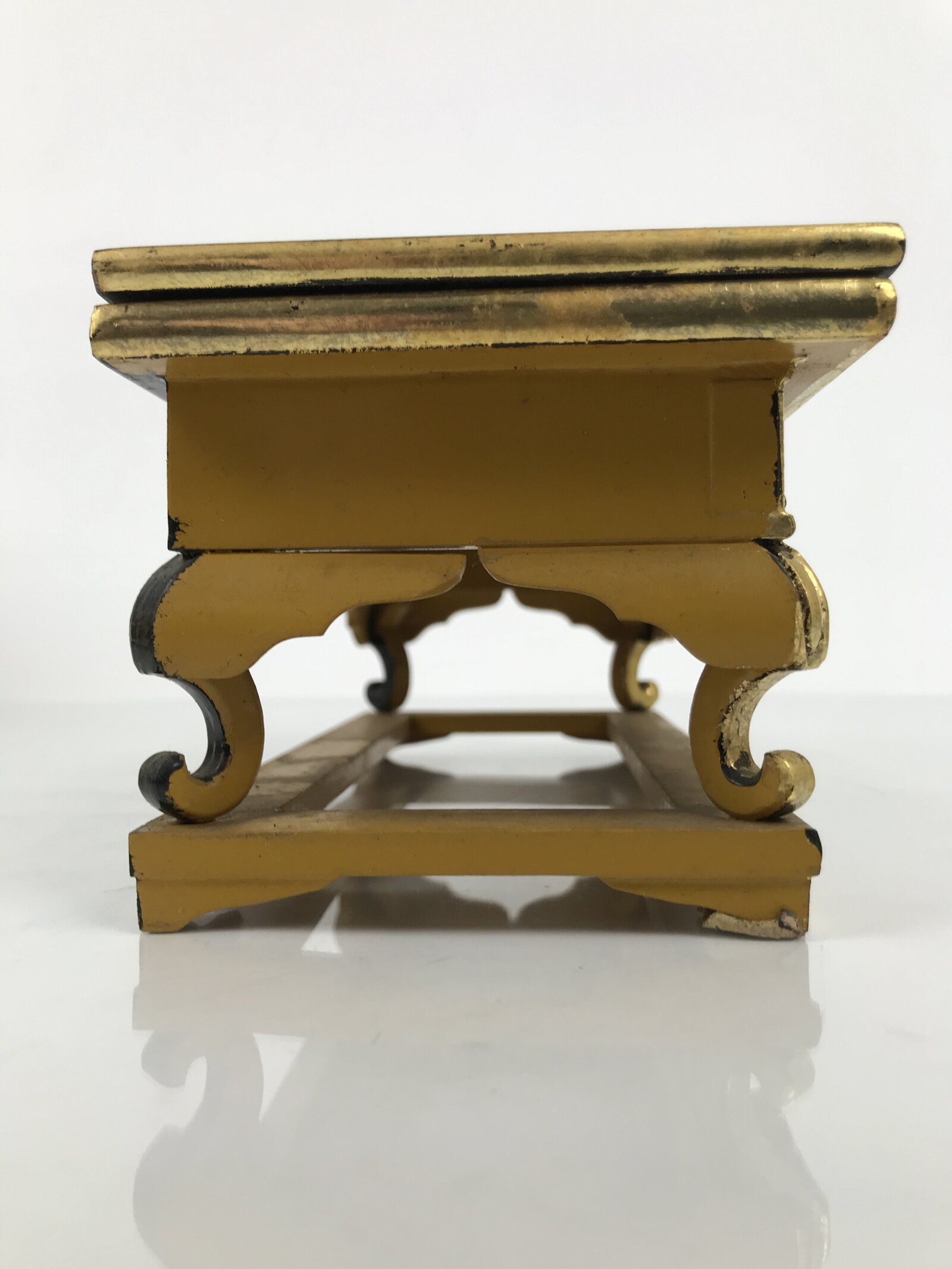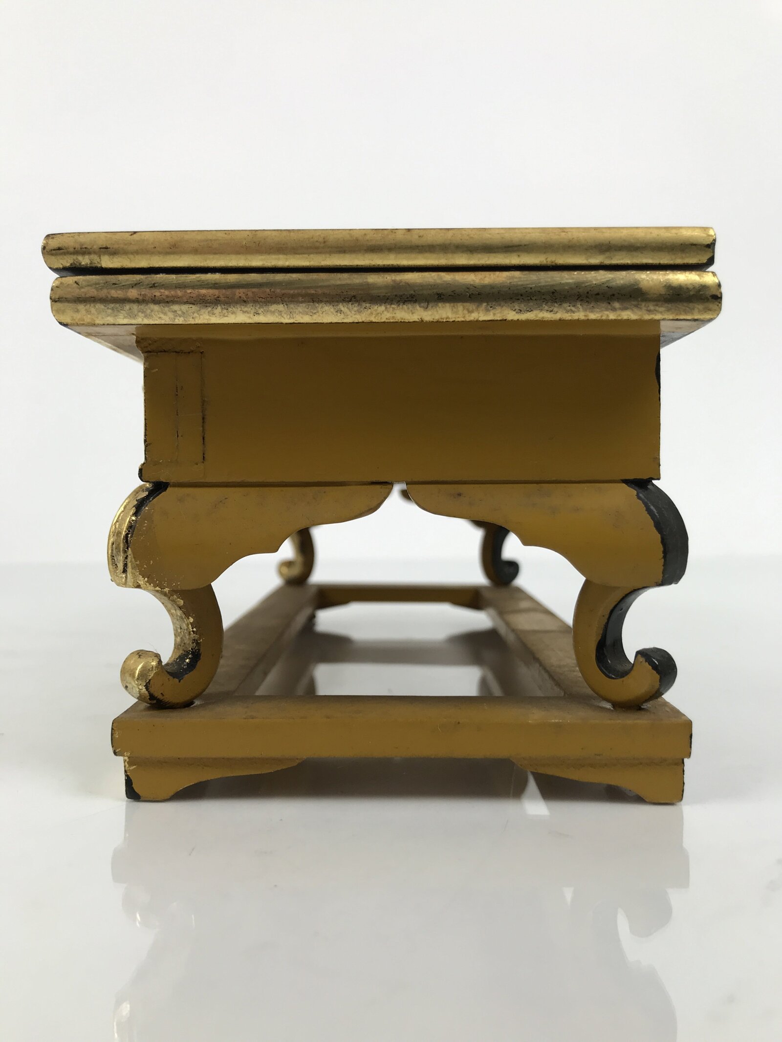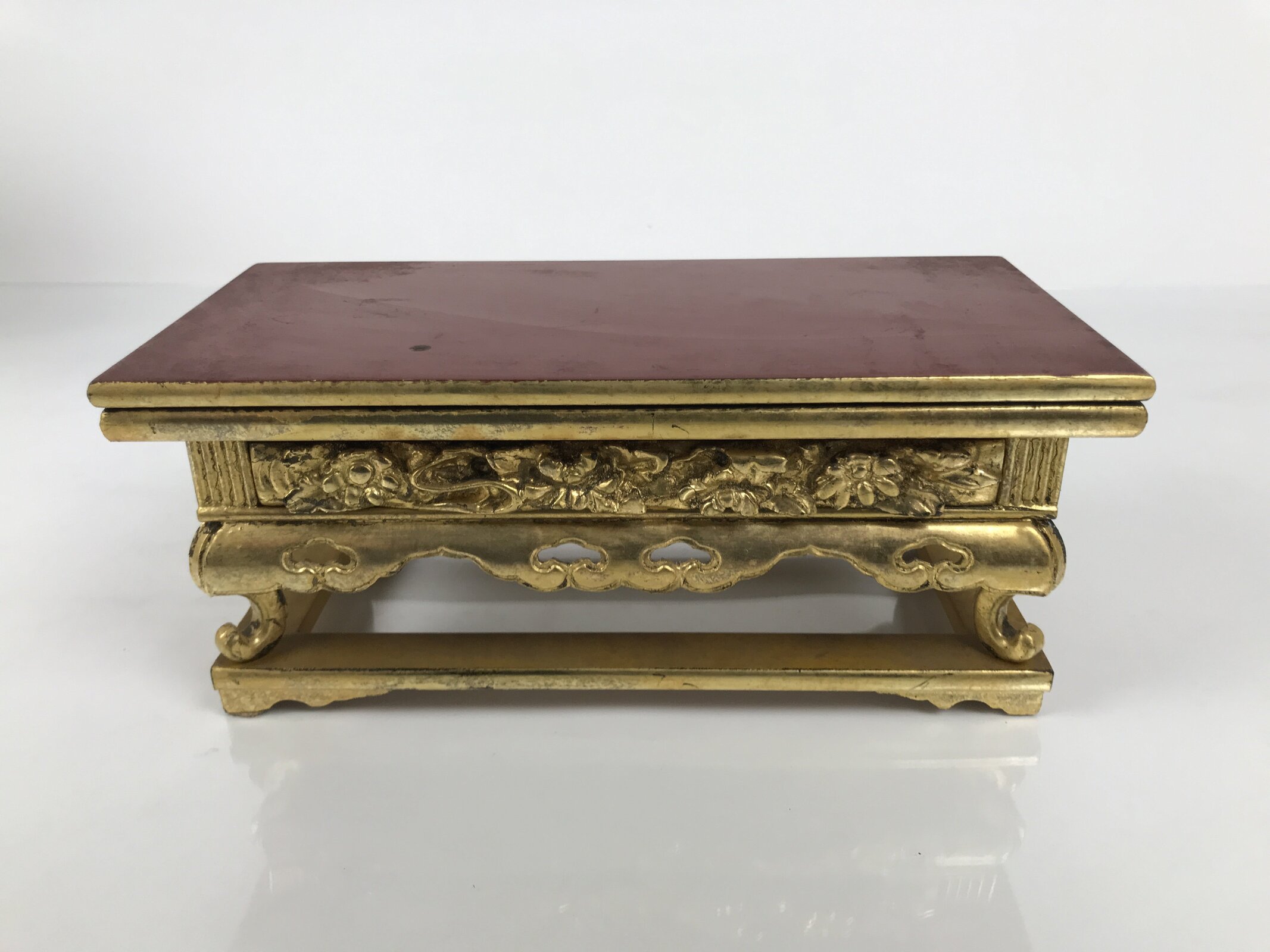 This is a vintage Japanese Buddhist altar offering table (uwajoku). It is coated with gold, red, black, and yellow lacquer and made with wood (main body) and resin (legs and gold fringe pieces). The front side is all gold with small chrysanthemums. While it appears that the top panel can be removed (this is usually the case), the previous owner has adhered the pieces together.