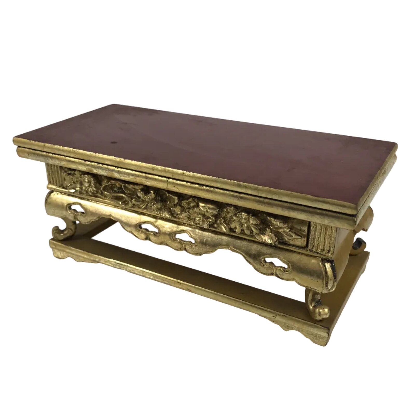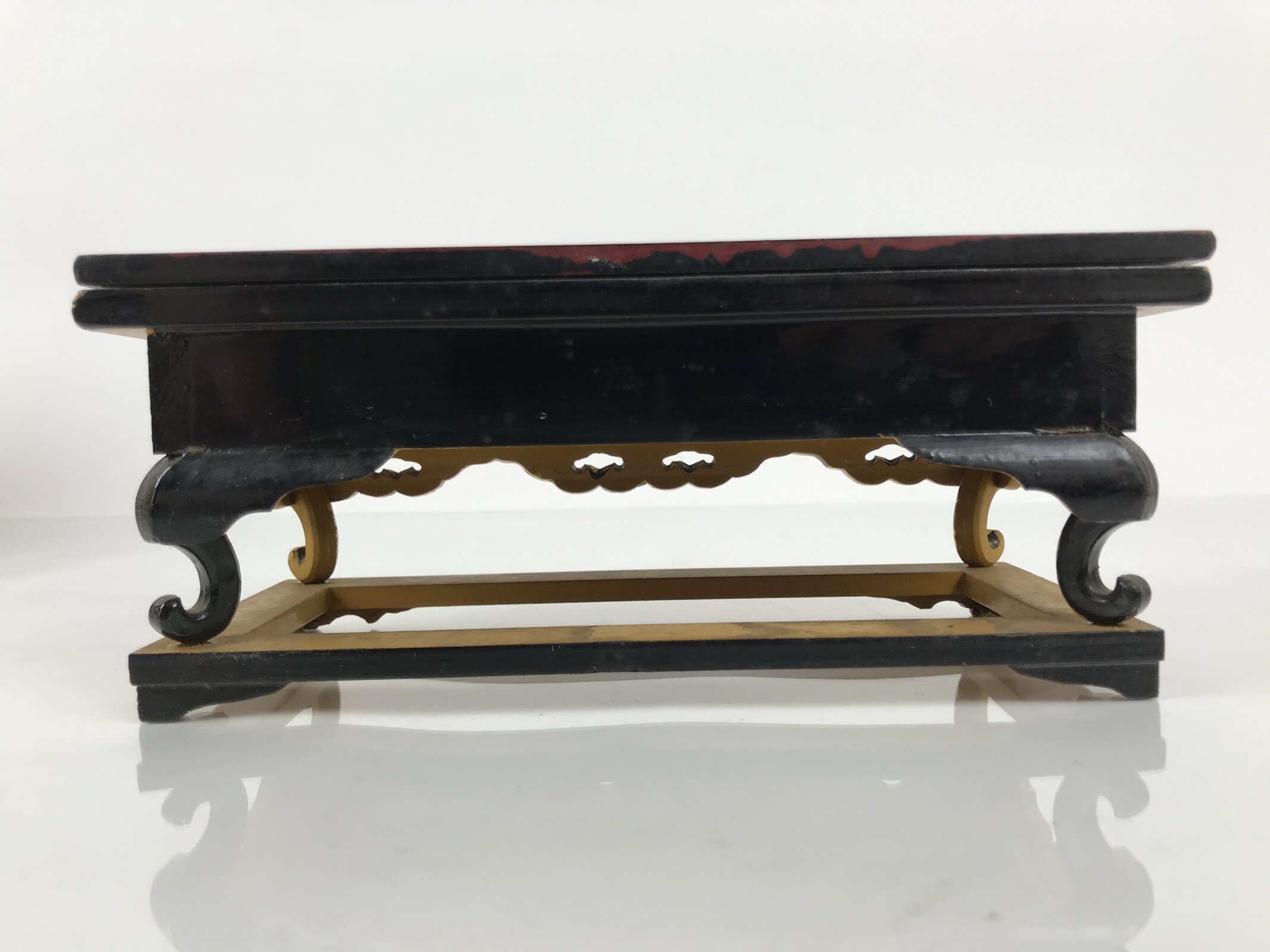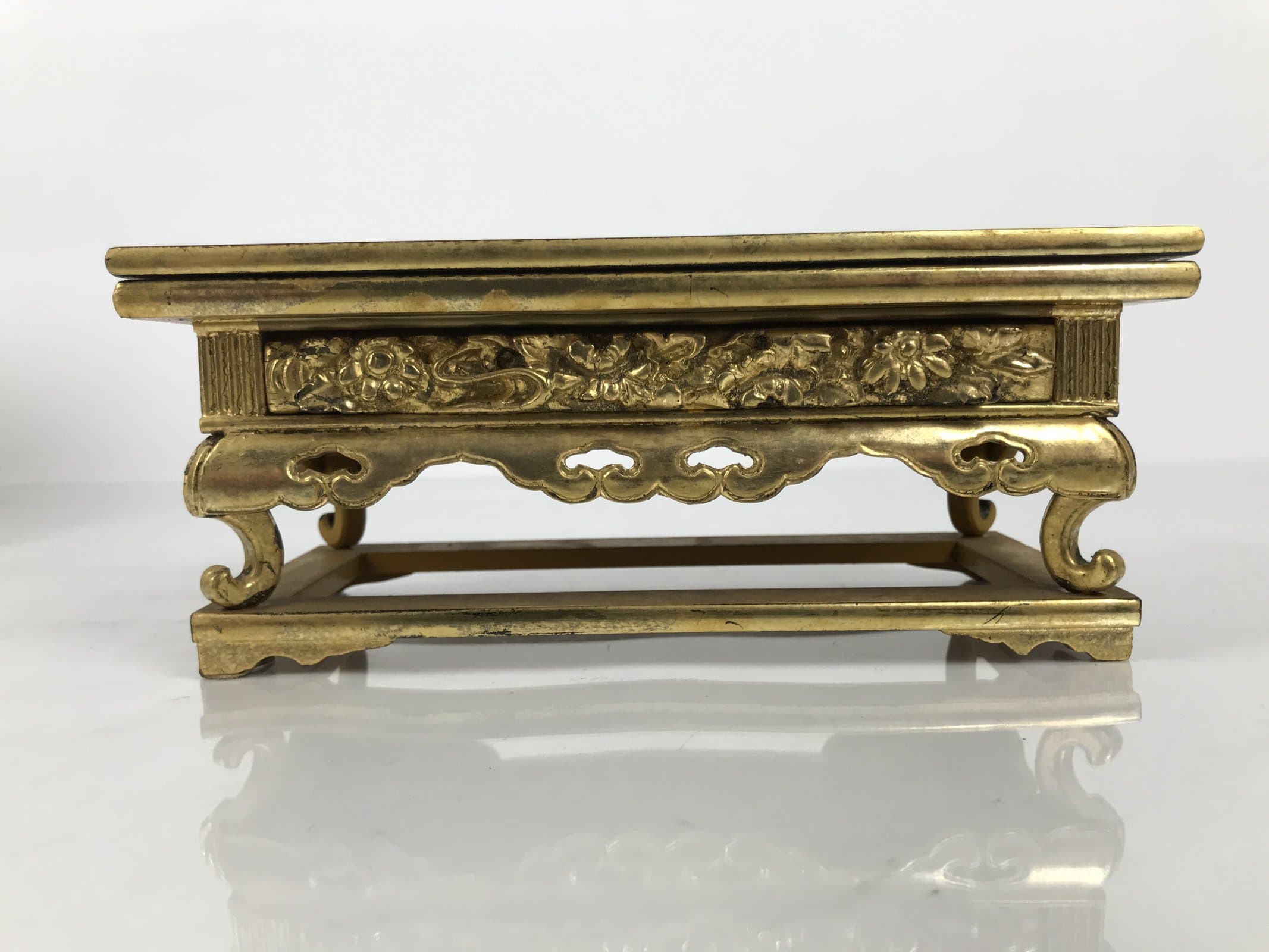 This is a vintage Japanese Buddhist altar offering table (uwajoku). It is coated with gold, red, black, and yellow lacquer and made with wood (main body) and resin (legs and gold fringe pieces). The front side is all gold with small chrysanthemums. While it appears that the top panel can be removed (this is usually the case), the previous owner has adhered the pieces together.
