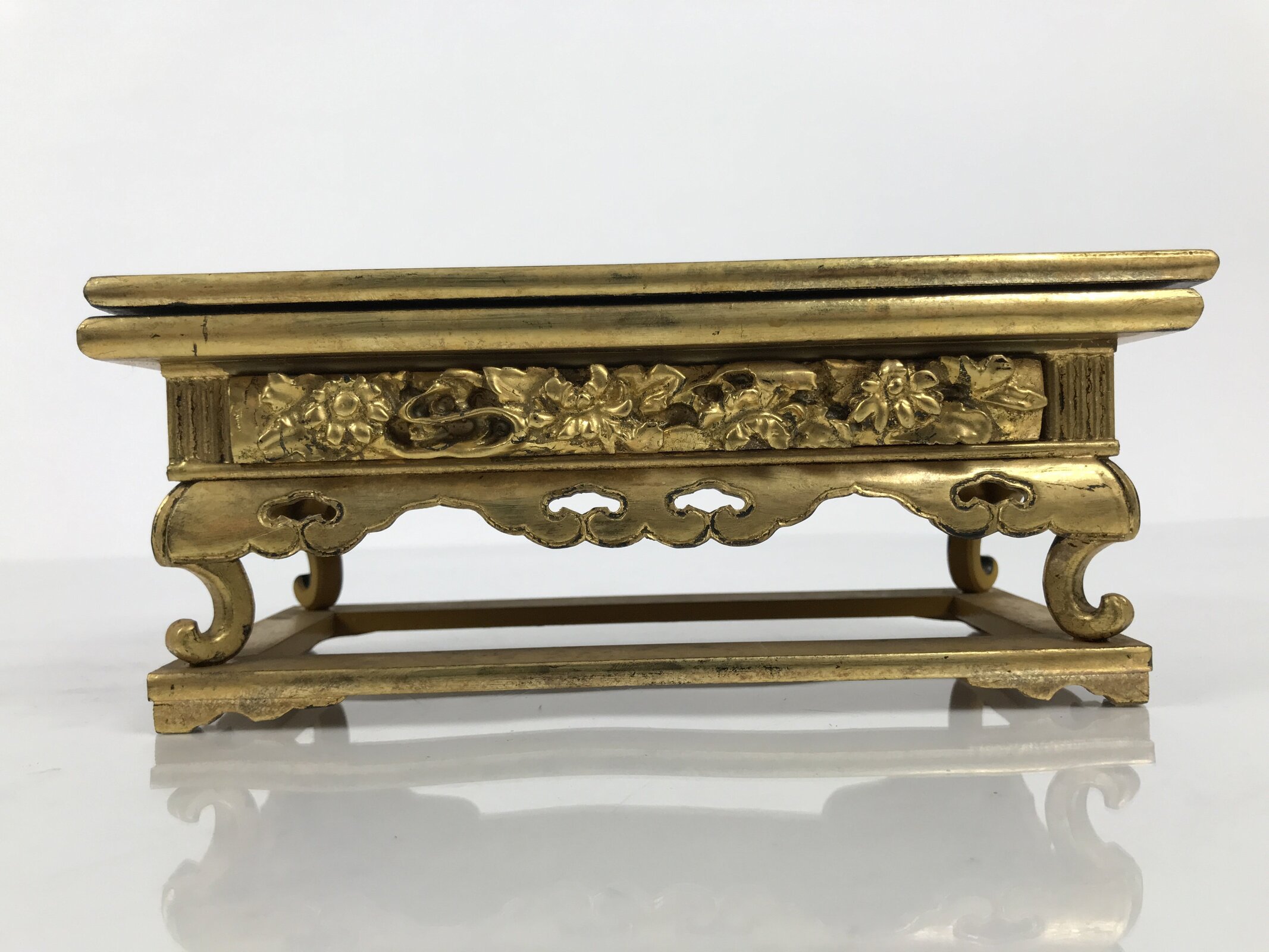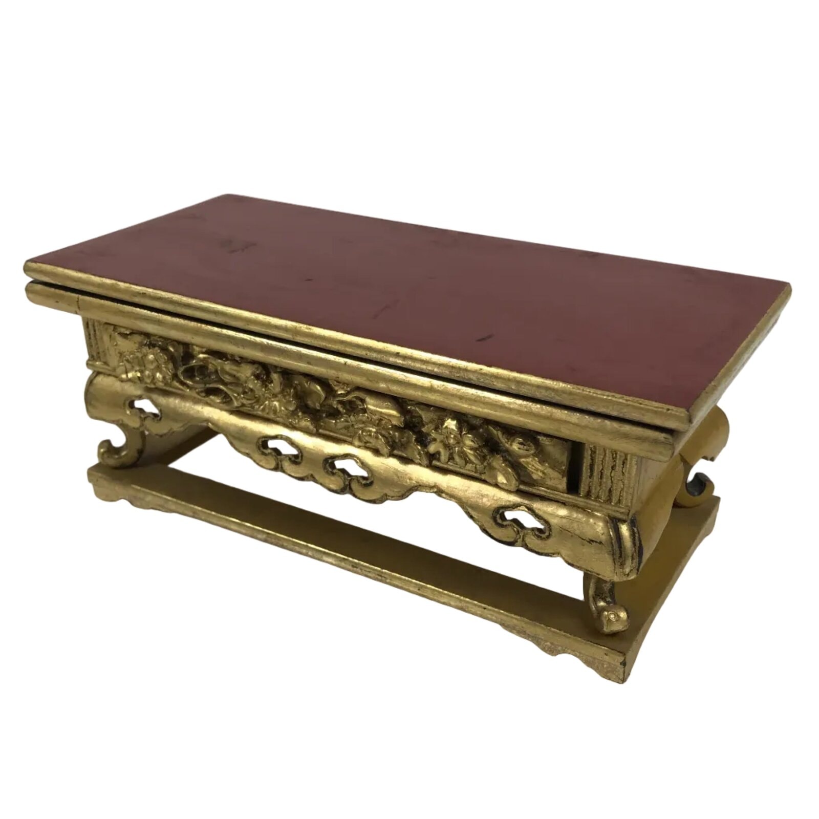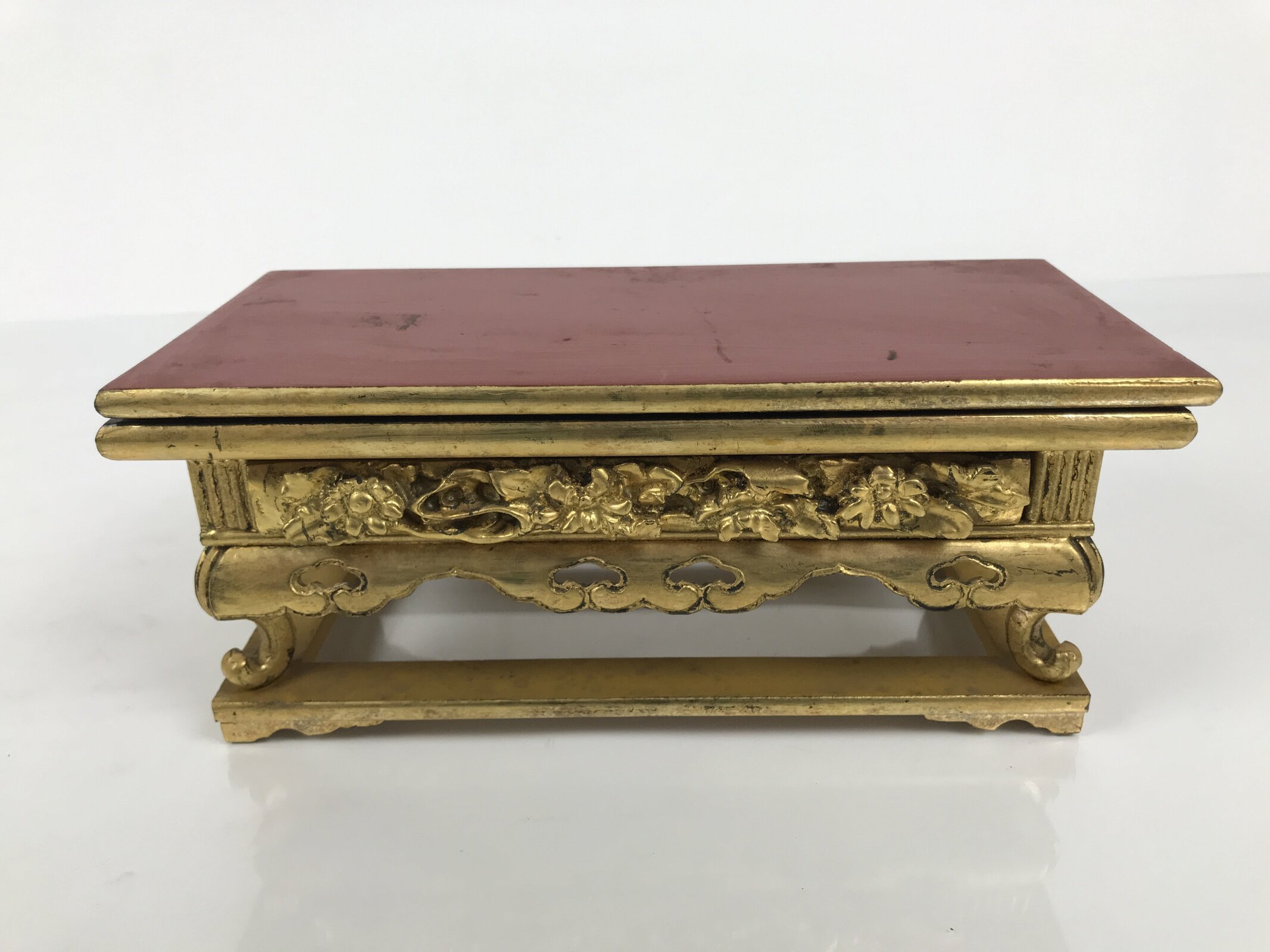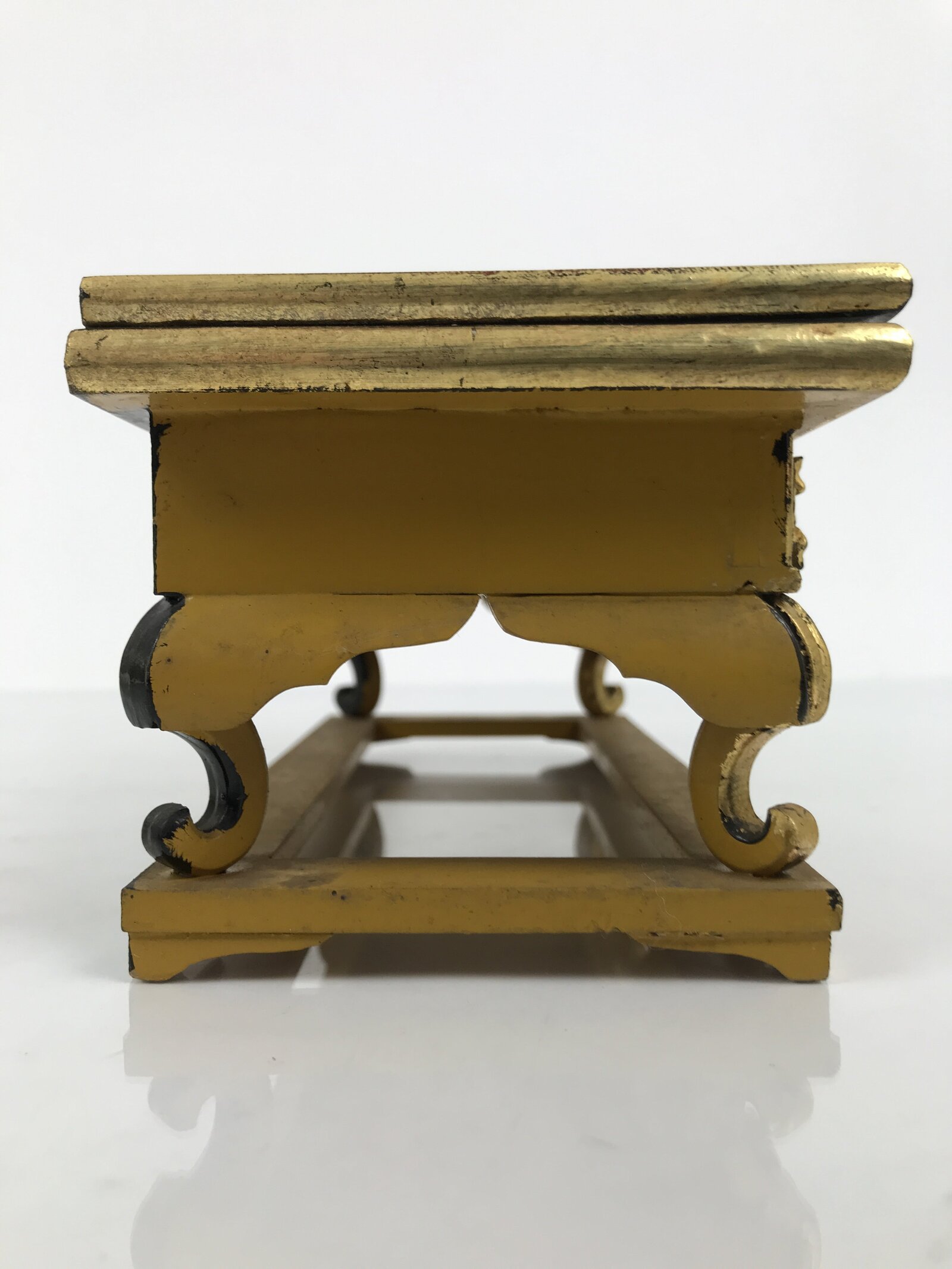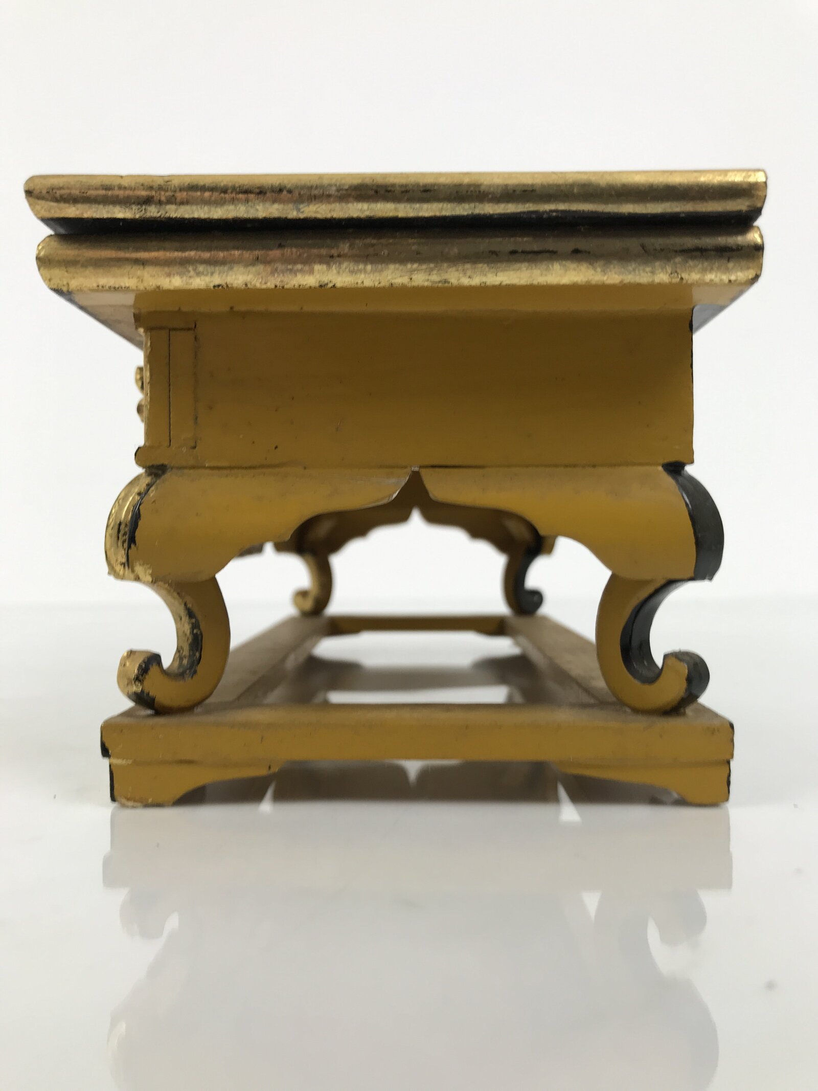 This is a vintage Japanese Buddhist altar offering table (uwajoku). It is coated with gold, red, black, and yellow lacquer and made with wood (main body) and resin (legs and gold fringe pieces). The front side is all gold with small chrysanthemums. While it appears that the top panel can be removed (this is usually the case), the previous owner has adhered the pieces together.
