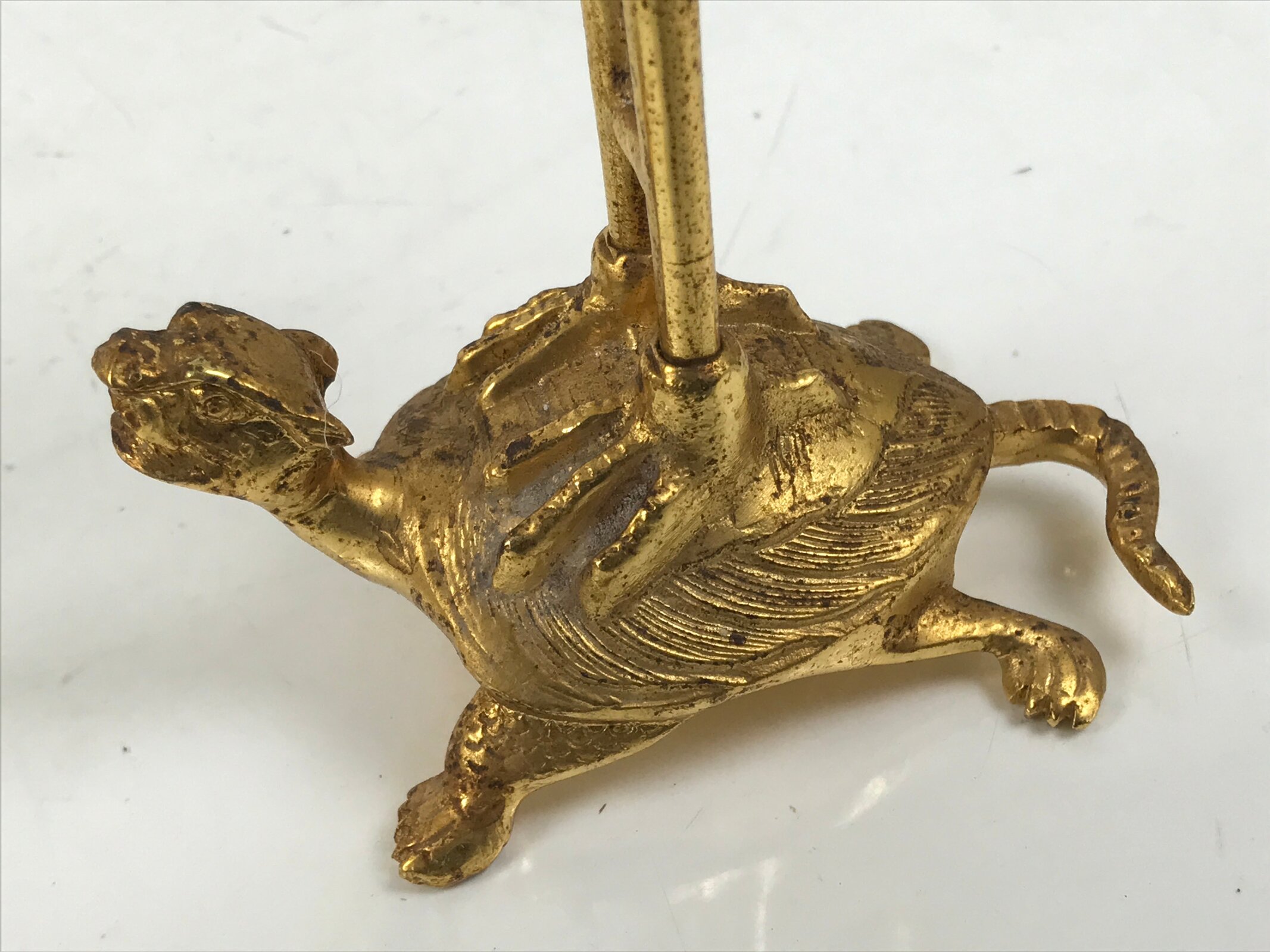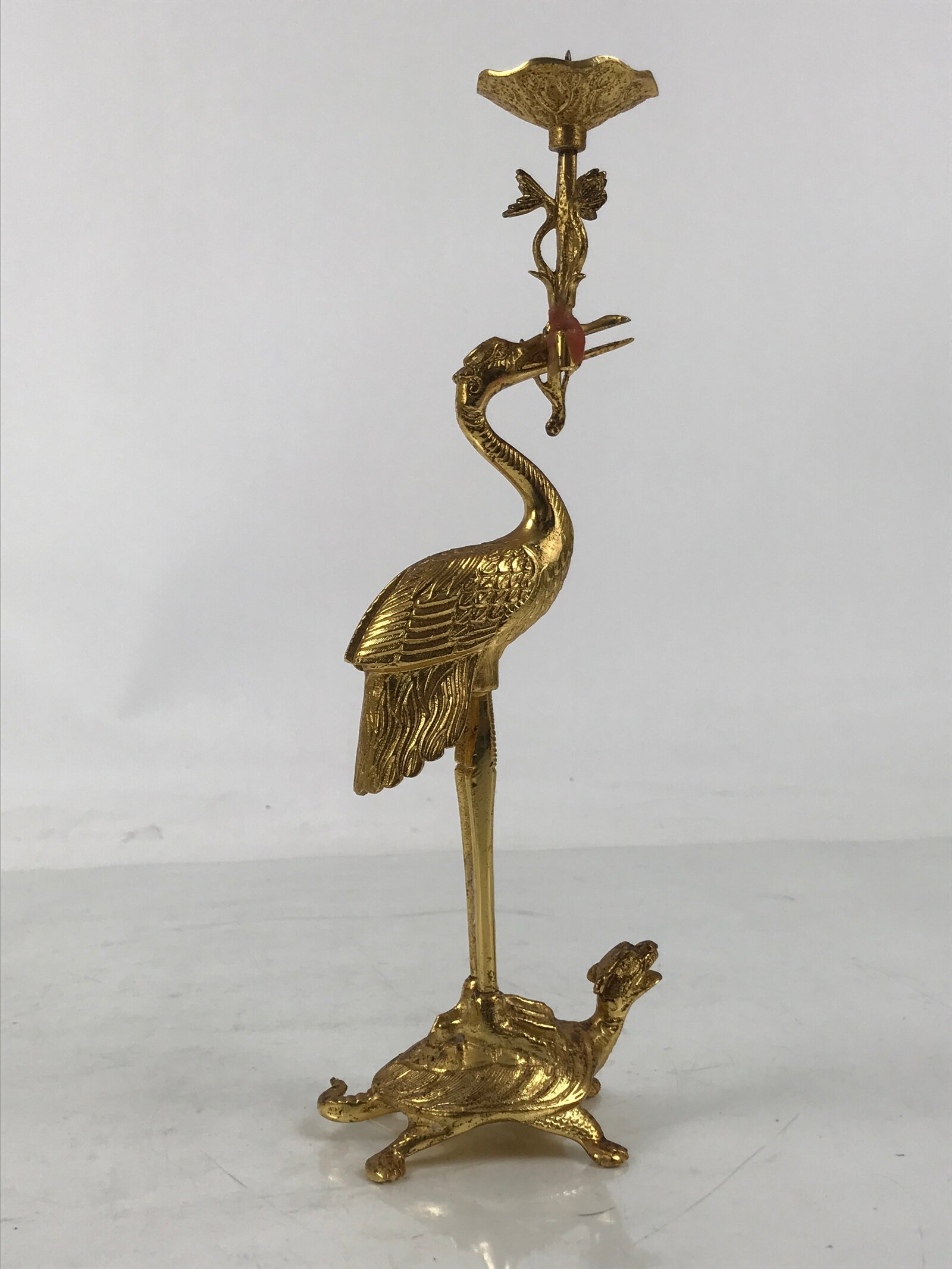 This is a Japanese vintage brass candle stand, Shokudai. Some sects of Jodo Shinshu Buddhism use this crane and turtle candle stand. In Japanese Buddhism, the candle stand is a fundamental Buddhist tool used in most sects. In the Buddhist world, the light that shines a warmly in the darkness has been considered the light of Buddha’s wisdom and mercy.