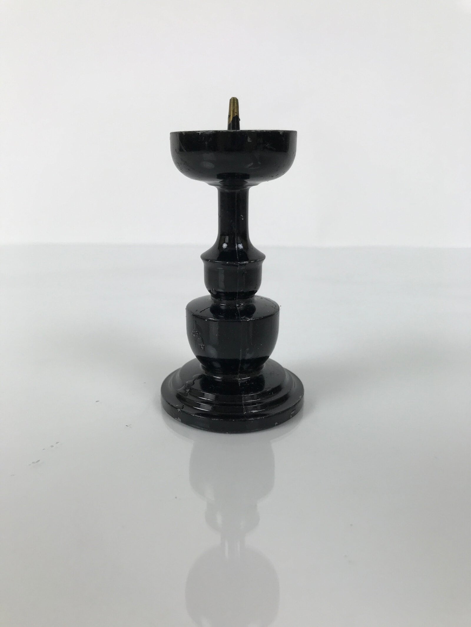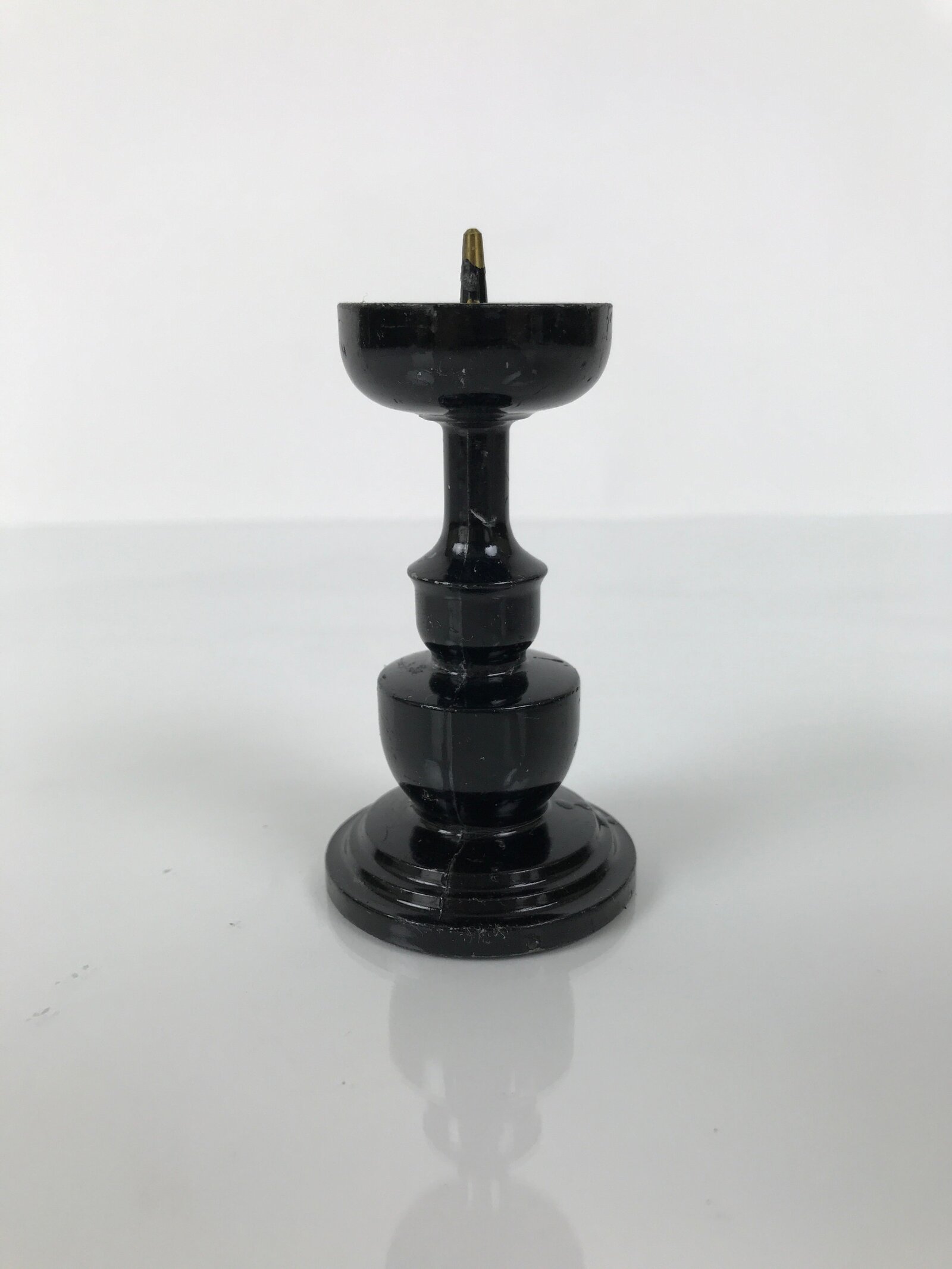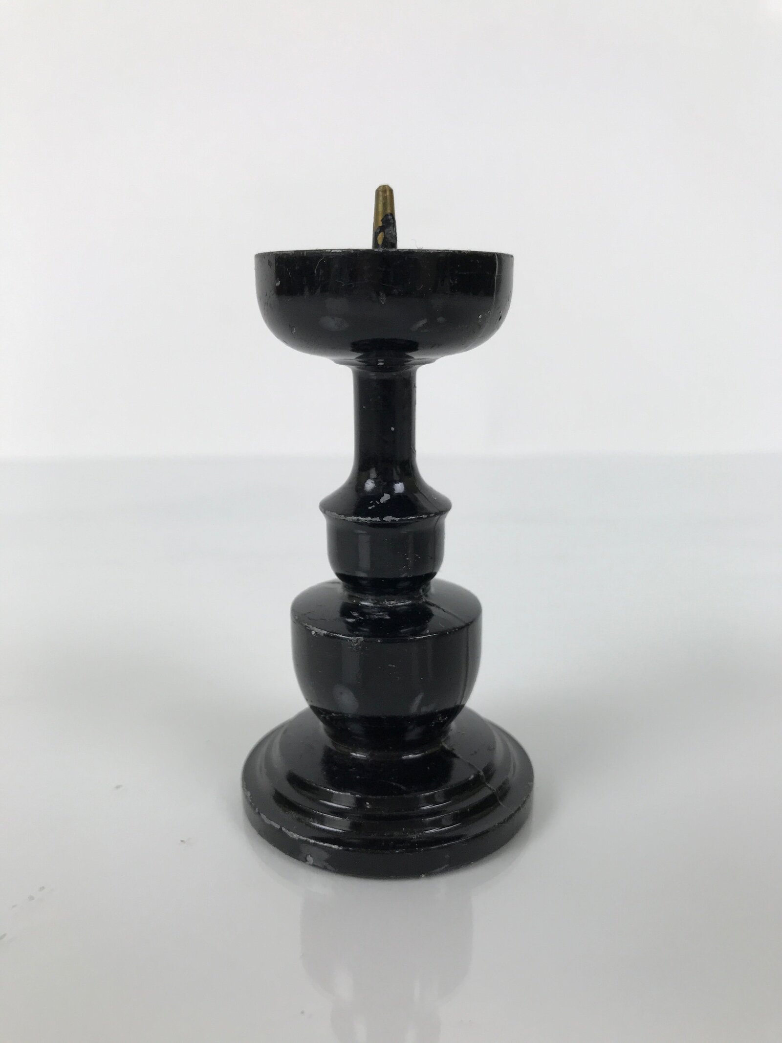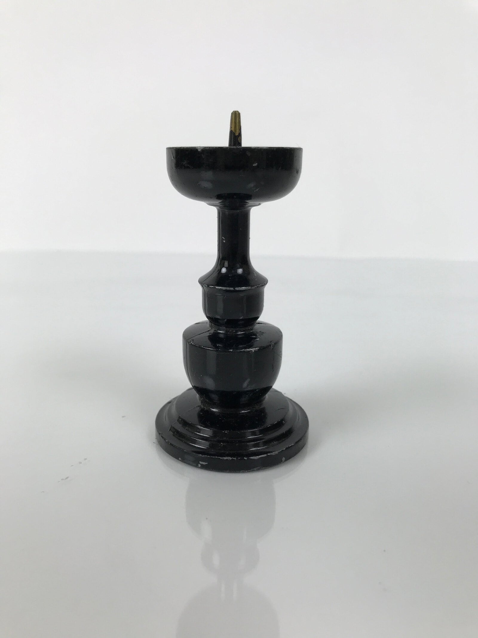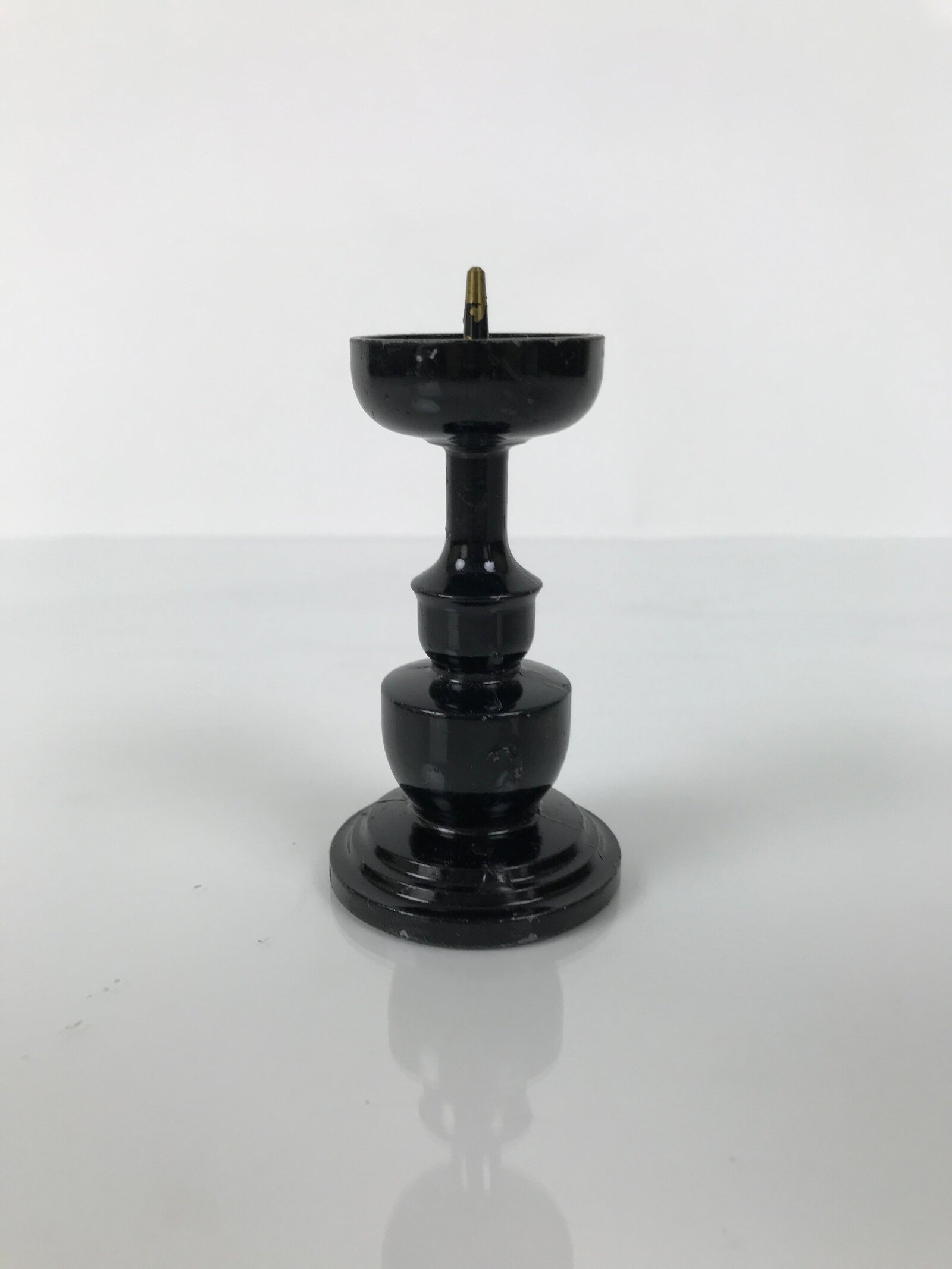 This item is a Japanese vintage Buddhist altar candle holder stand. This small metal candlestick is painted black and has a very simple, classic design. Candlestands or candlesticks are basic Buddhist tools used in most sects and an essential for Buddhist altars (Butsudan).