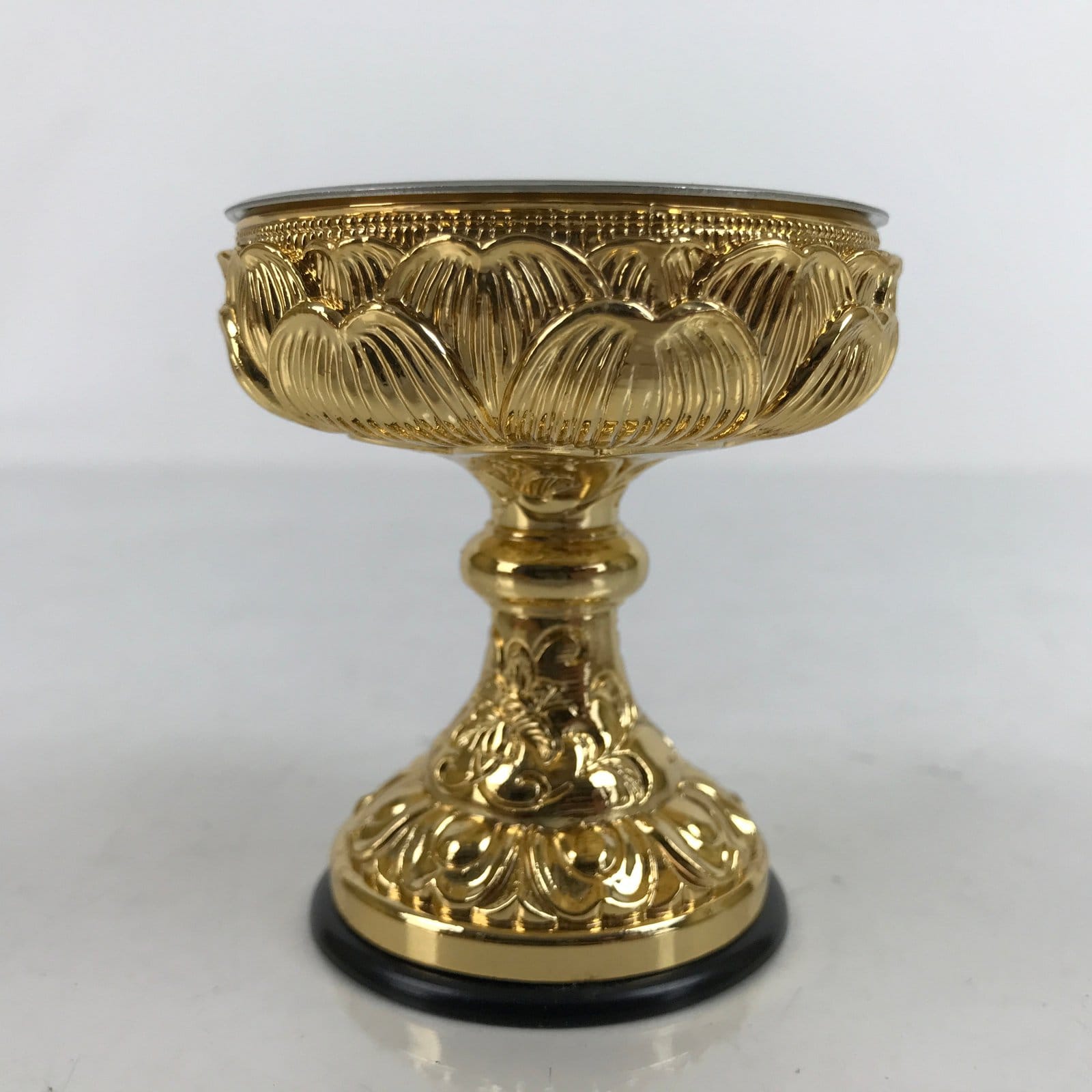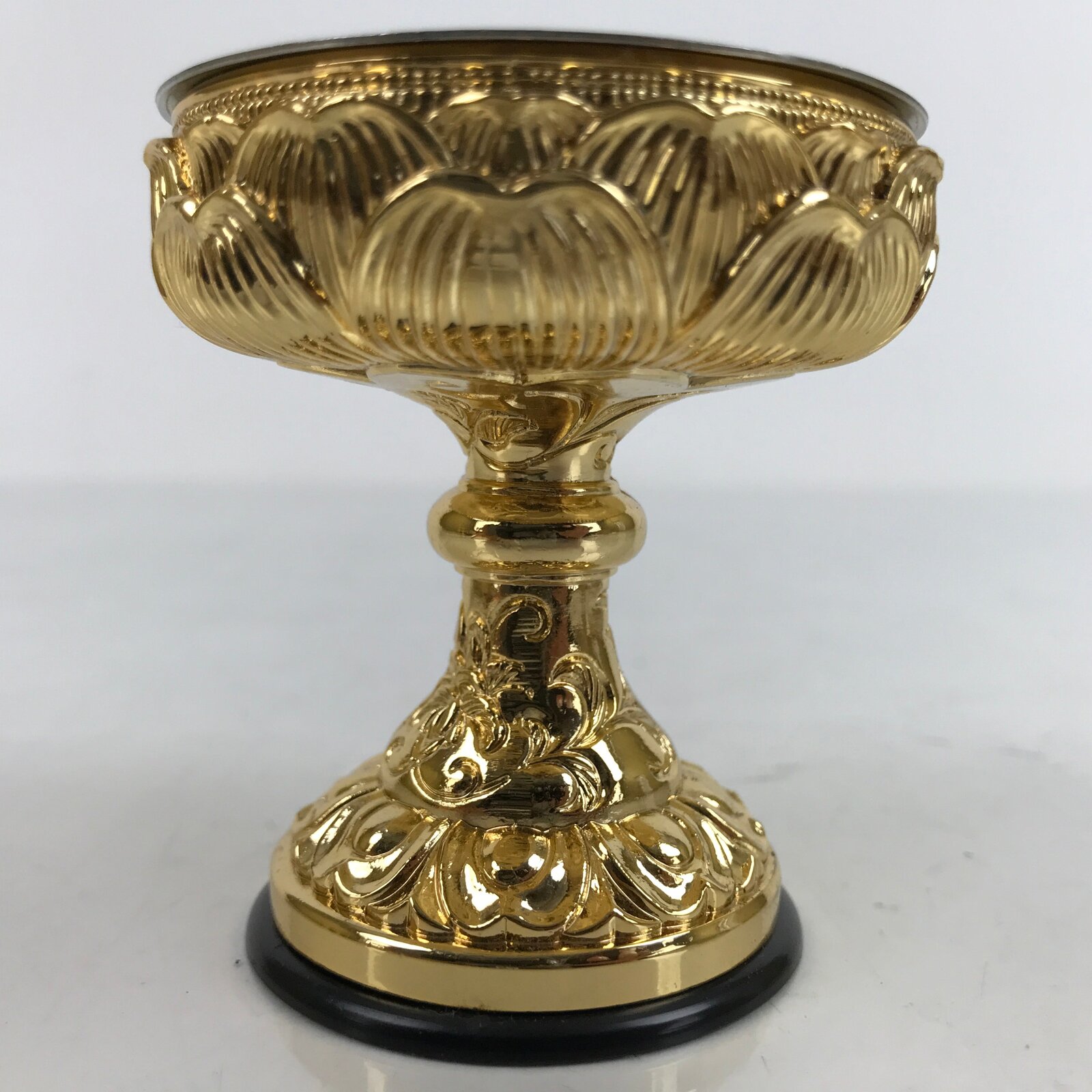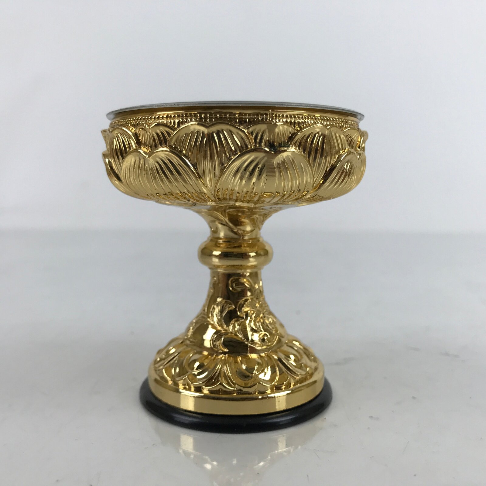 This is a Japanese rice offering cup, Buppanki, made for use in a Buddhist altar. This cup is small and made of gold-colored metal with a lotus flower design. There is a black plastic base that protects surfaces from scratching. It has a plain metal removable insert. It has a plain metal removable insert. The rice offered to Buddhist altars is called “Buppan”. Other things such as sake, mochi, etc are also offered at home and temple altars in this style of cup.