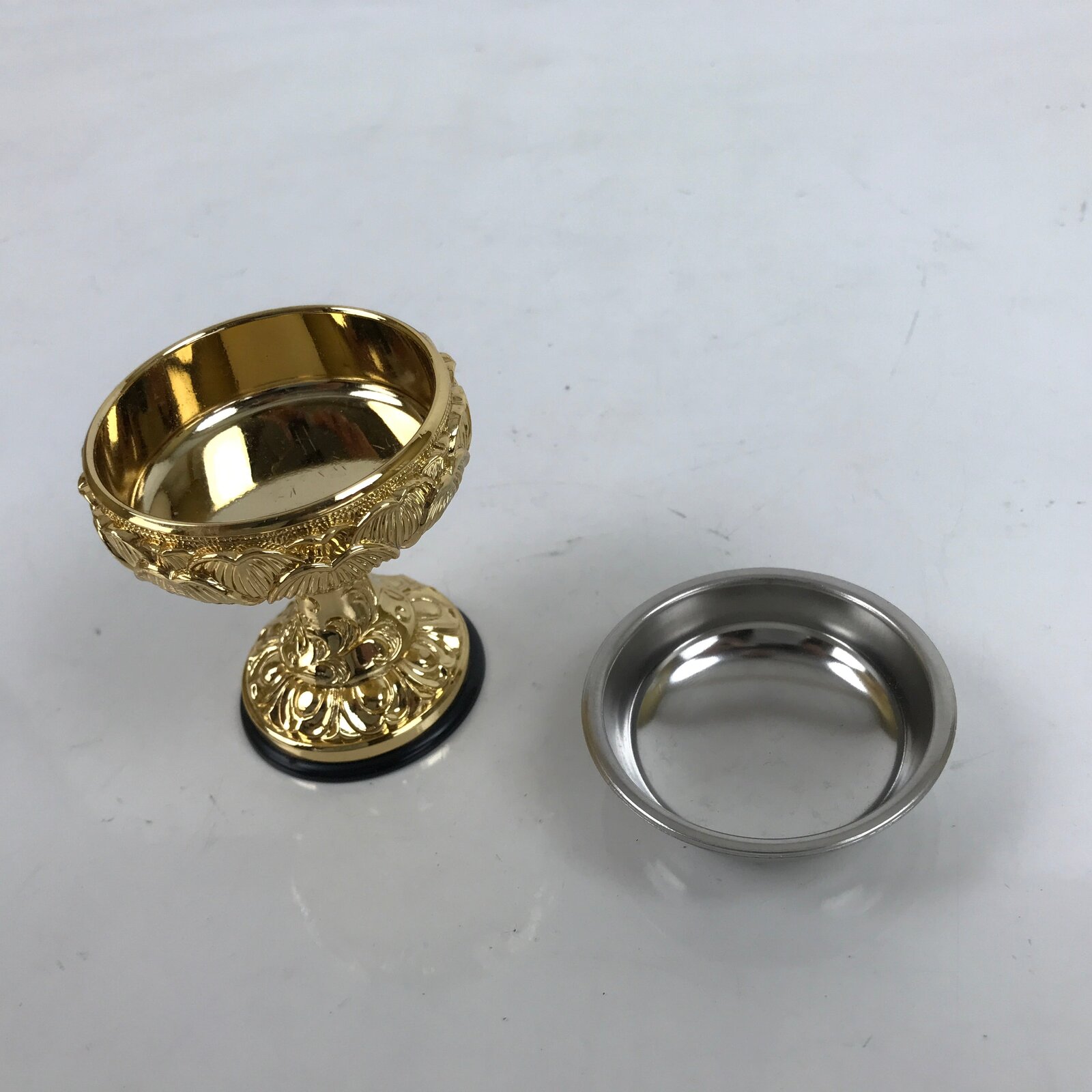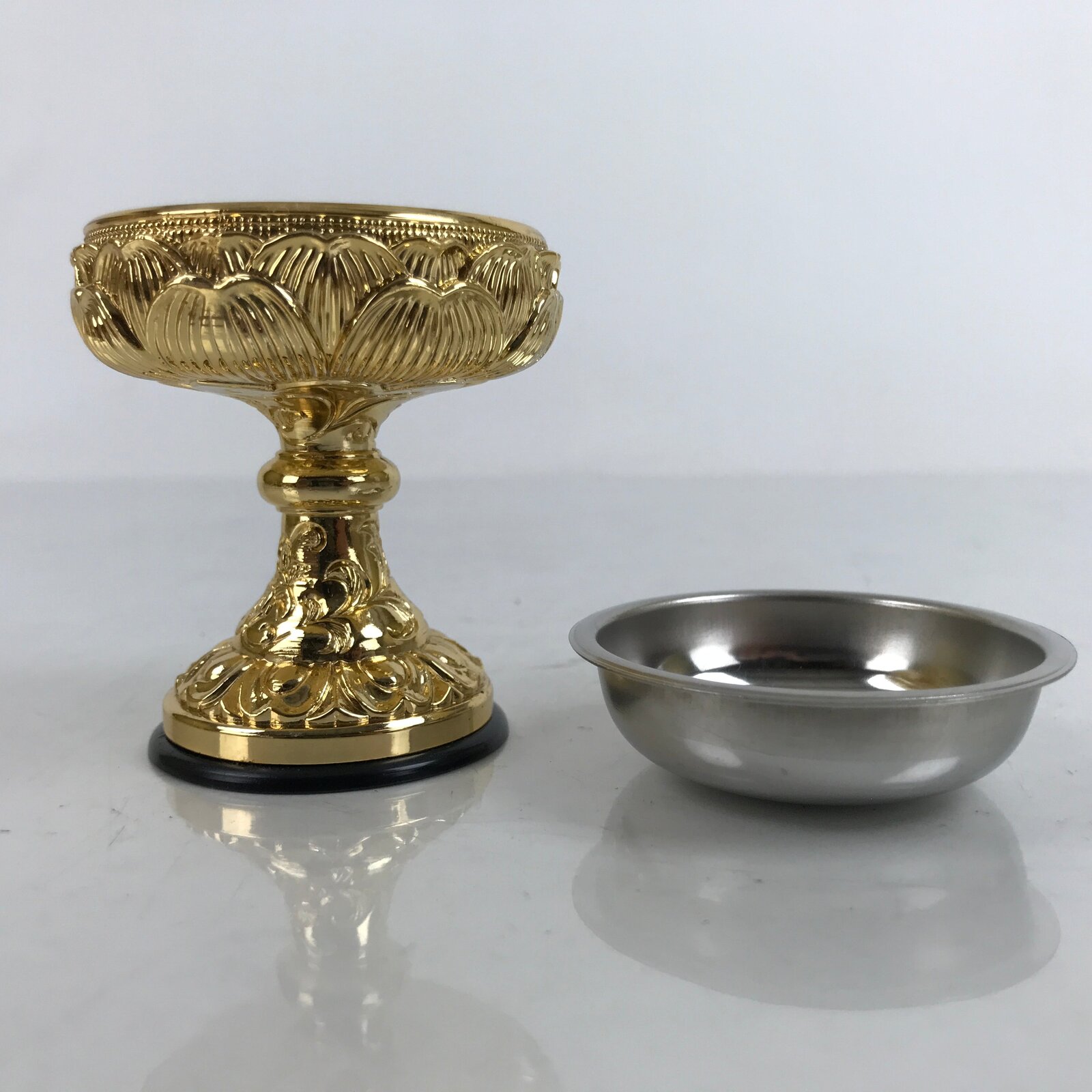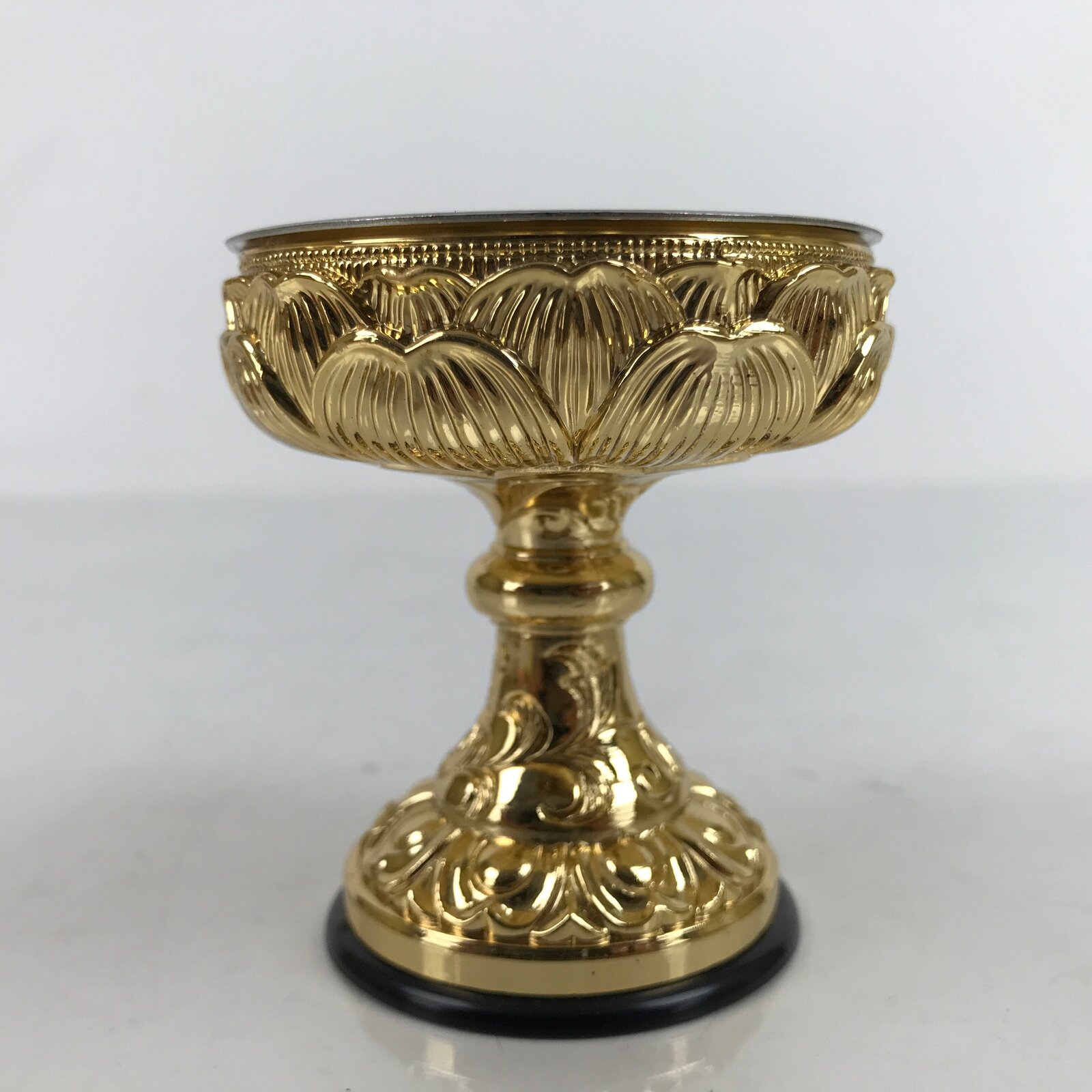 This is a Japanese rice offering cup, Buppanki, made for use in a Buddhist altar. This cup is small and made of gold-colored metal with a lotus flower design. There is a black plastic base that protects surfaces from scratching. It has a plain metal removable insert. It has a plain metal removable insert. The rice offered to Buddhist altars is called “Buppan”. Other things such as sake, mochi, etc are also offered at home and temple altars in this style of cup.