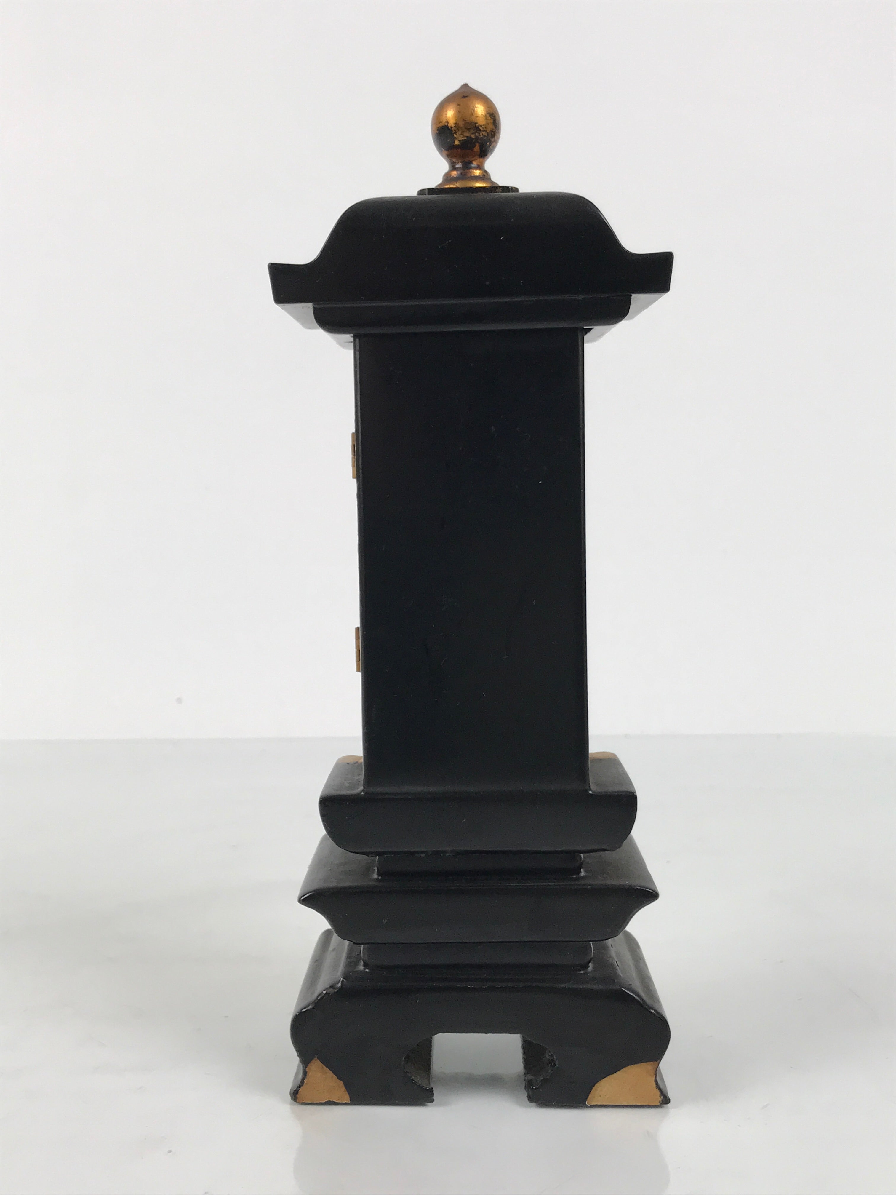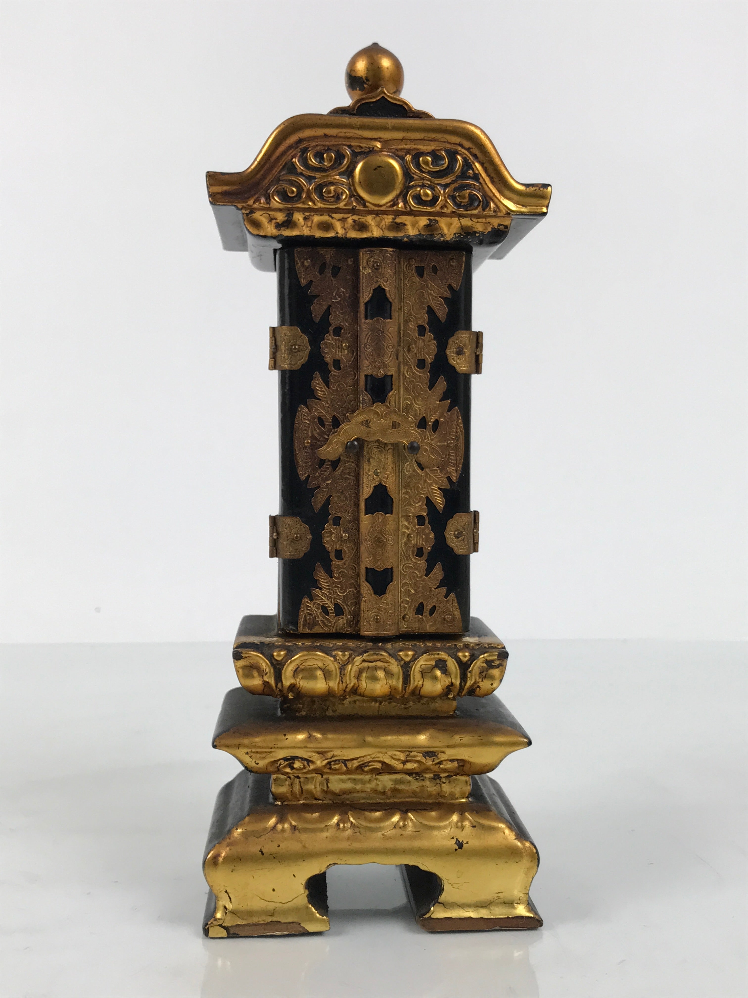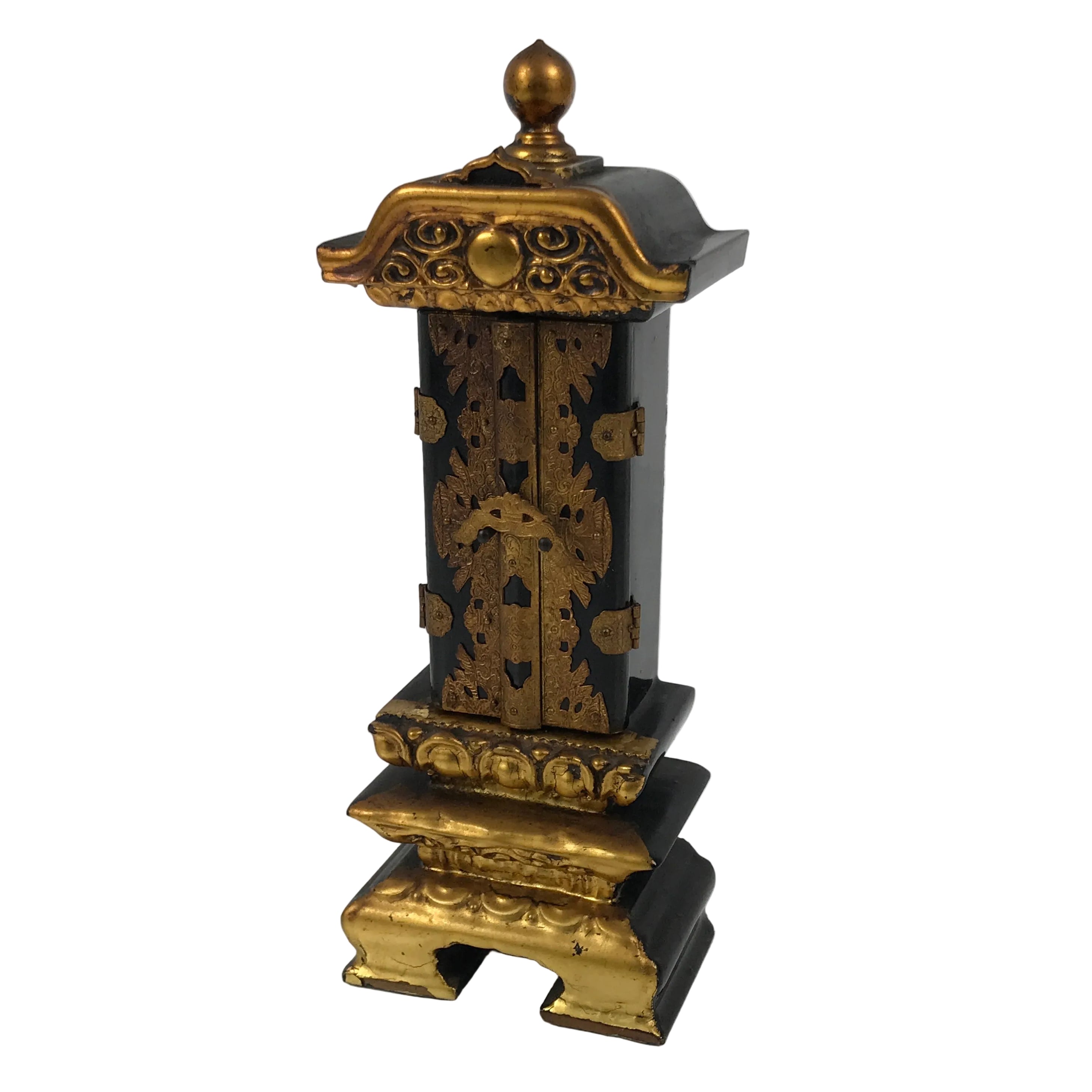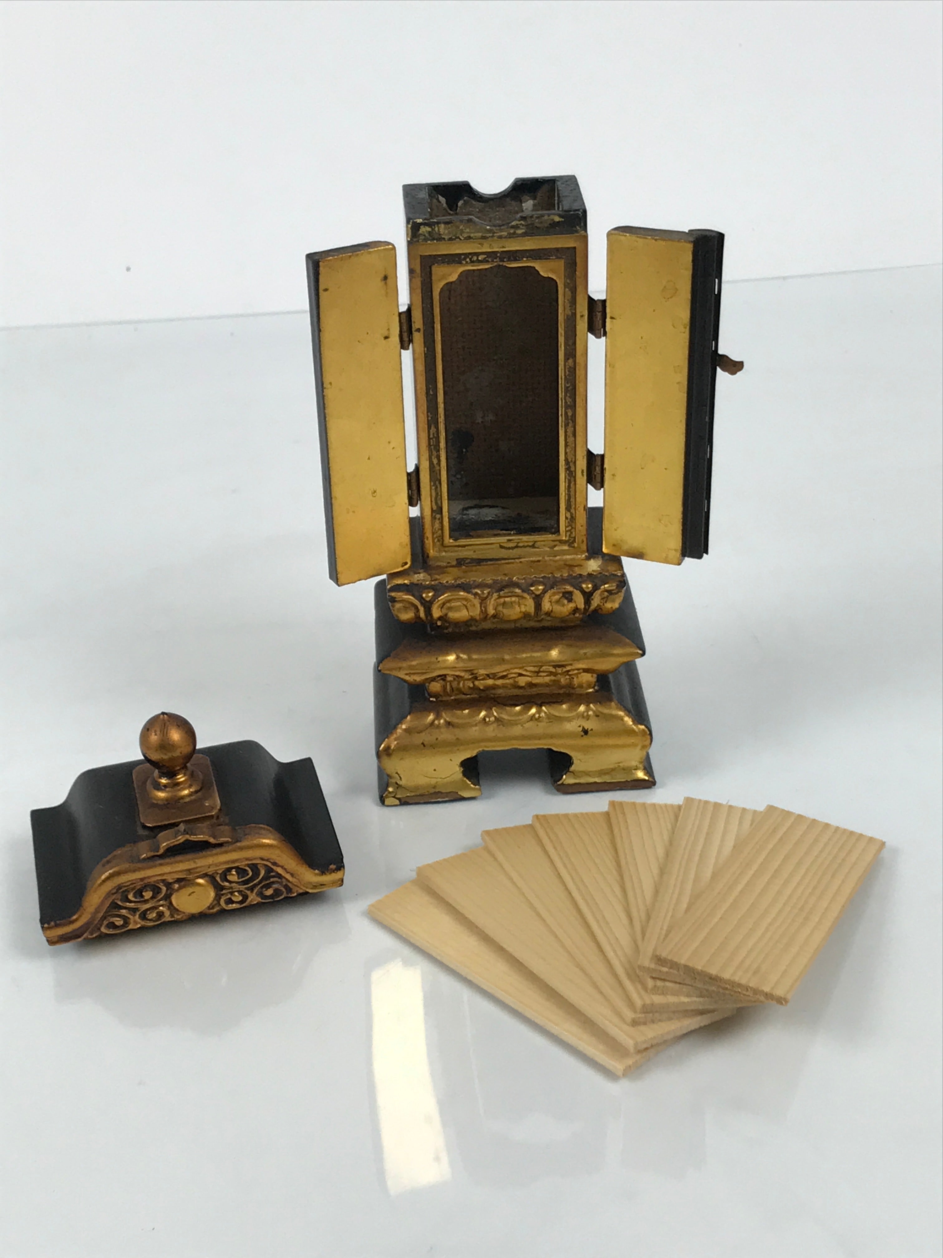This is a vintage Japanese mortuary tablet Ihai. A mortuary tablet is a place the spirit of a deceased person is enshrined. This type of Ihai (with a double door) is called Miyabi. It is black with gold paint and brass metal embellishments. A mortuary tablet (Kai de Ihai) can hold several deceased people in one place (names written on wood plates). This particular mortuary tablet contain seven blank wood plates.