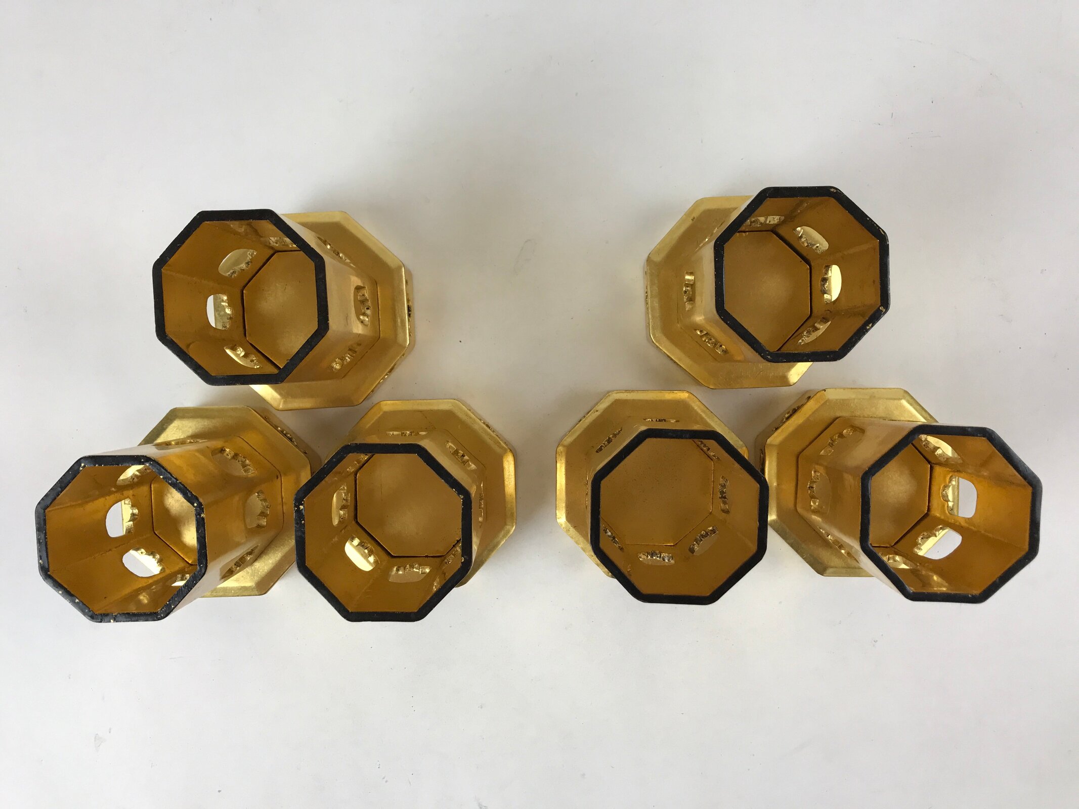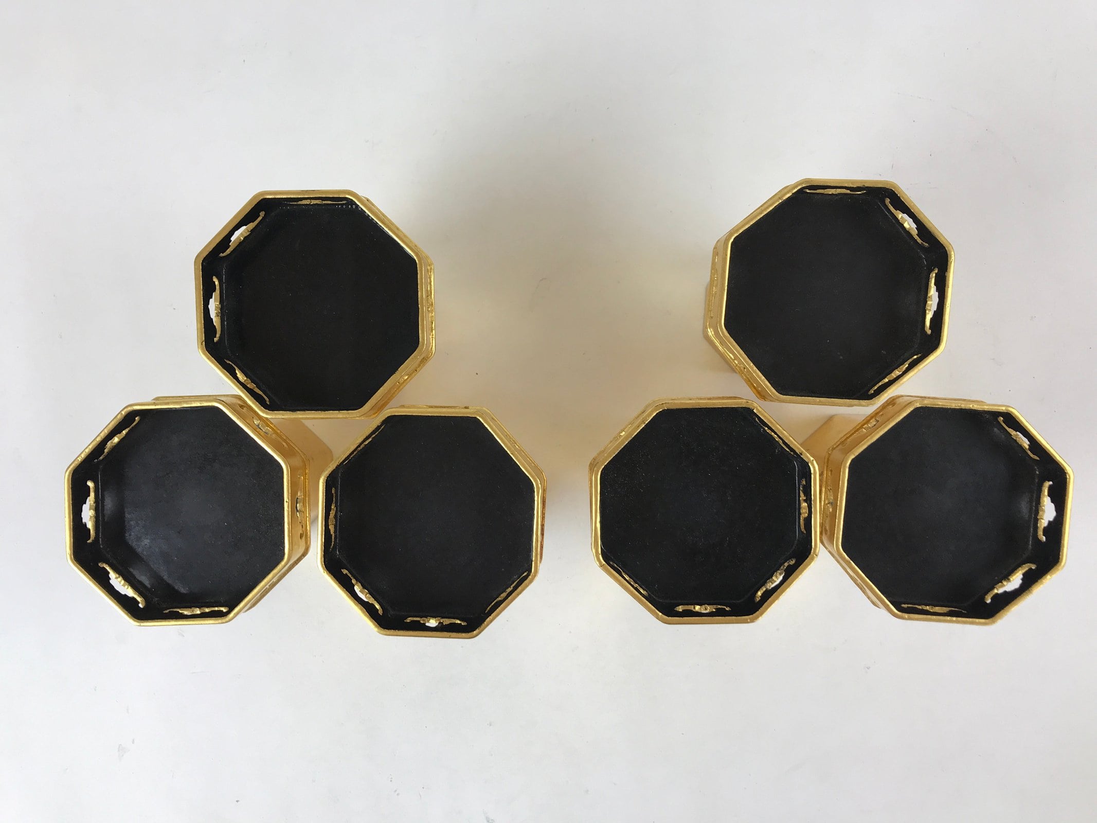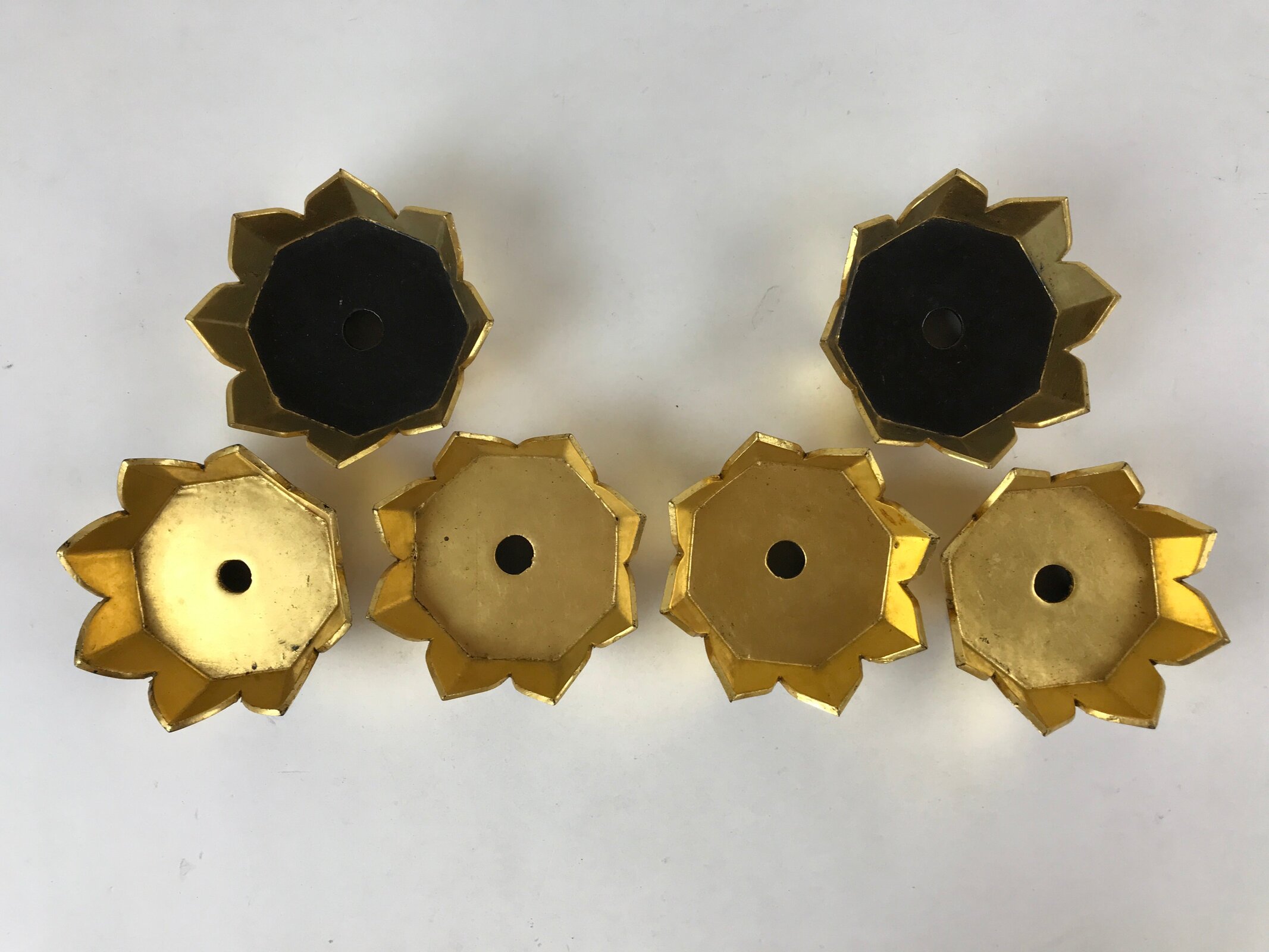 This is a vintage Japanese set of 6 offering stands Kuge and their storage wood box. This gorgeous set consists of 6 octogonal lacquered wooden stands in gold and black with various floral cut-outs. Each Kuge stand consists of two pieces: the top part and the bottom part. All six offering stands are stored in a dedicated lidded wood box opening vertically with black inscriptions in Japanese on the lid.
