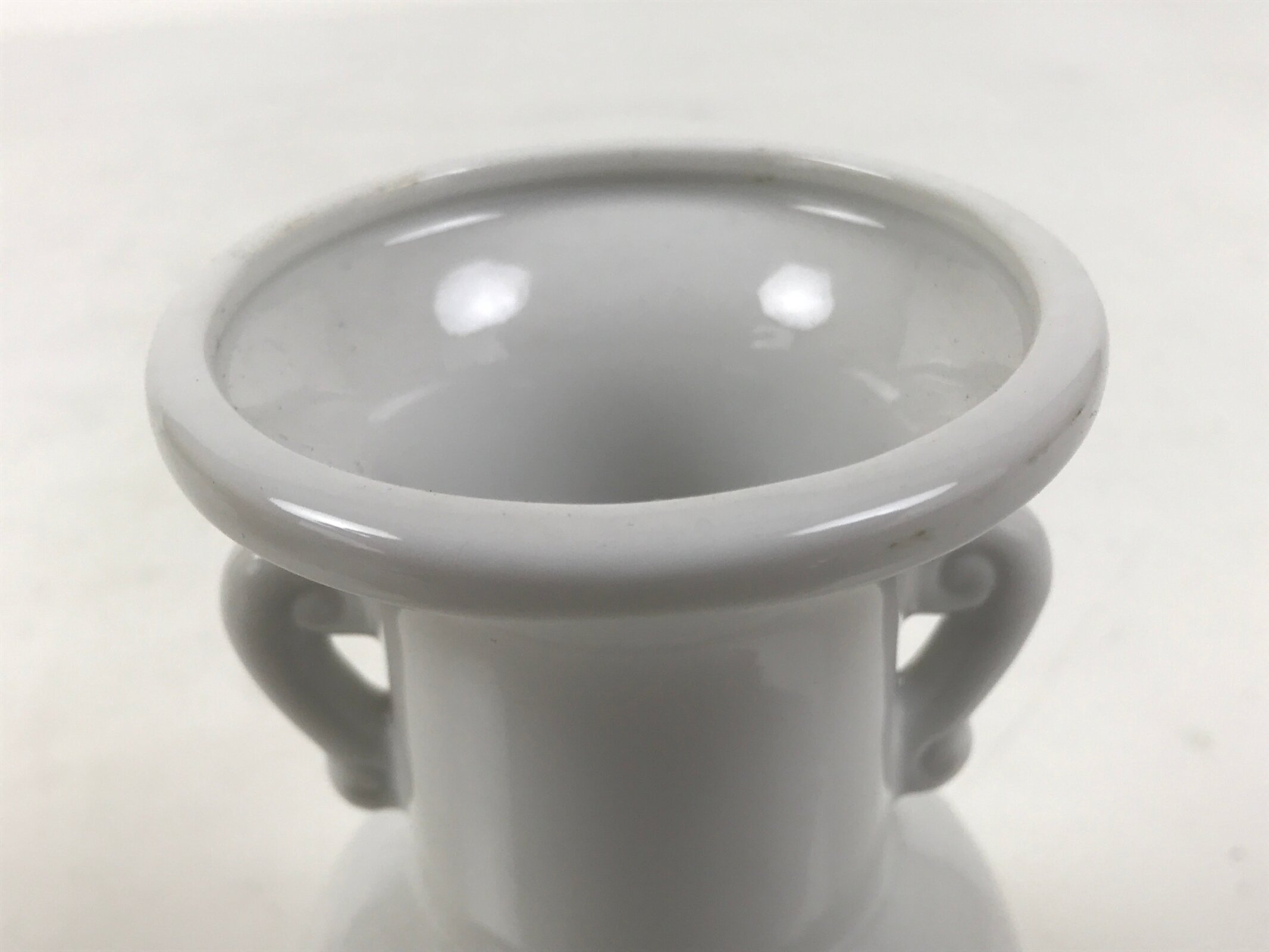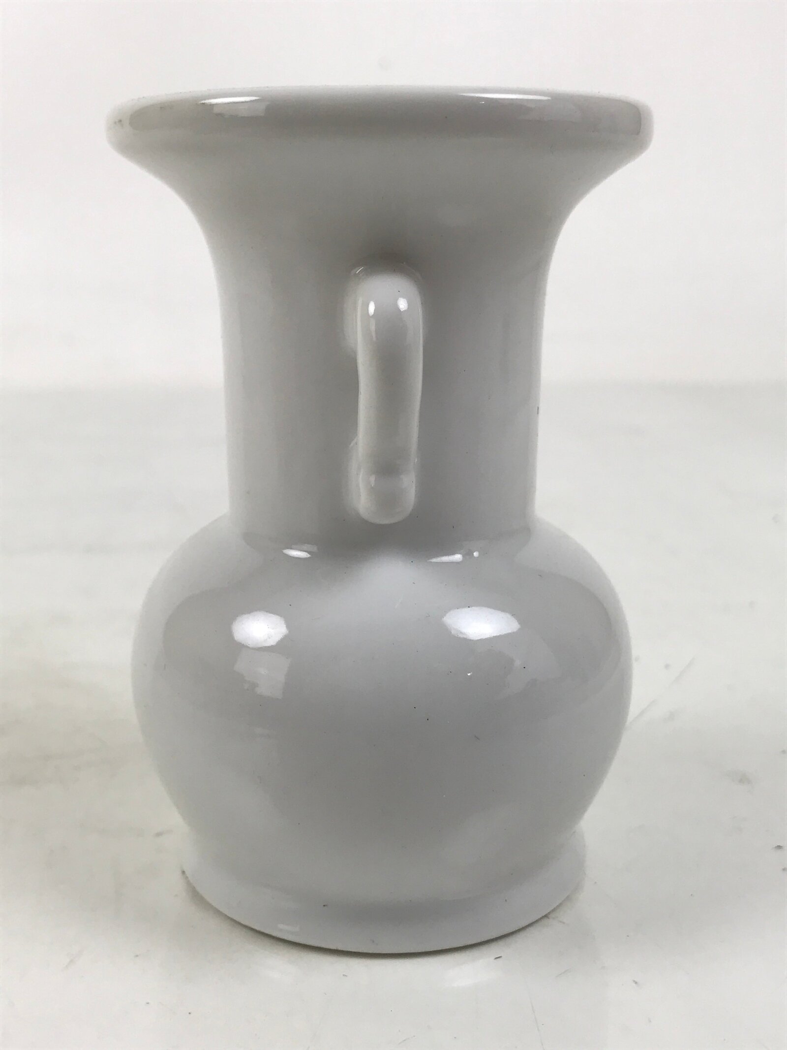 This is a porcelain flower vase, hanatate, for Buddhist altars. This particular vase is has a classic shape with decorative handles. It features a simple white glaze. It is common to offer a range of seasonal and symbolic flowers in front of a Buddhist altar. It is also a vessel for Sakaki leaves or Shashagi leaves in Shinto. The meaning of offering sakaki tree leaves is that the gods living in the sakaki tree will protect the grave and the soul.