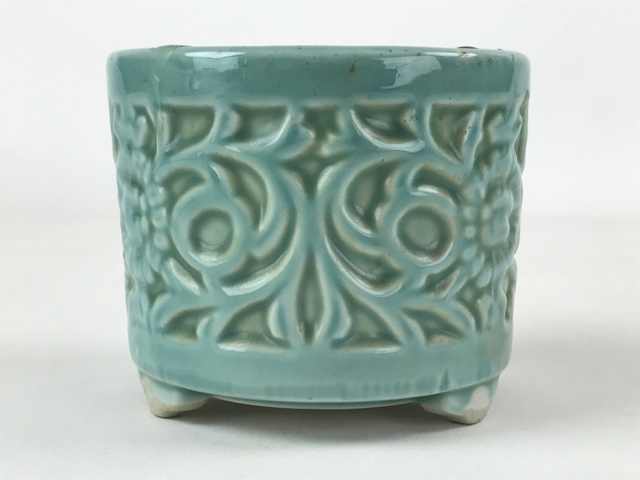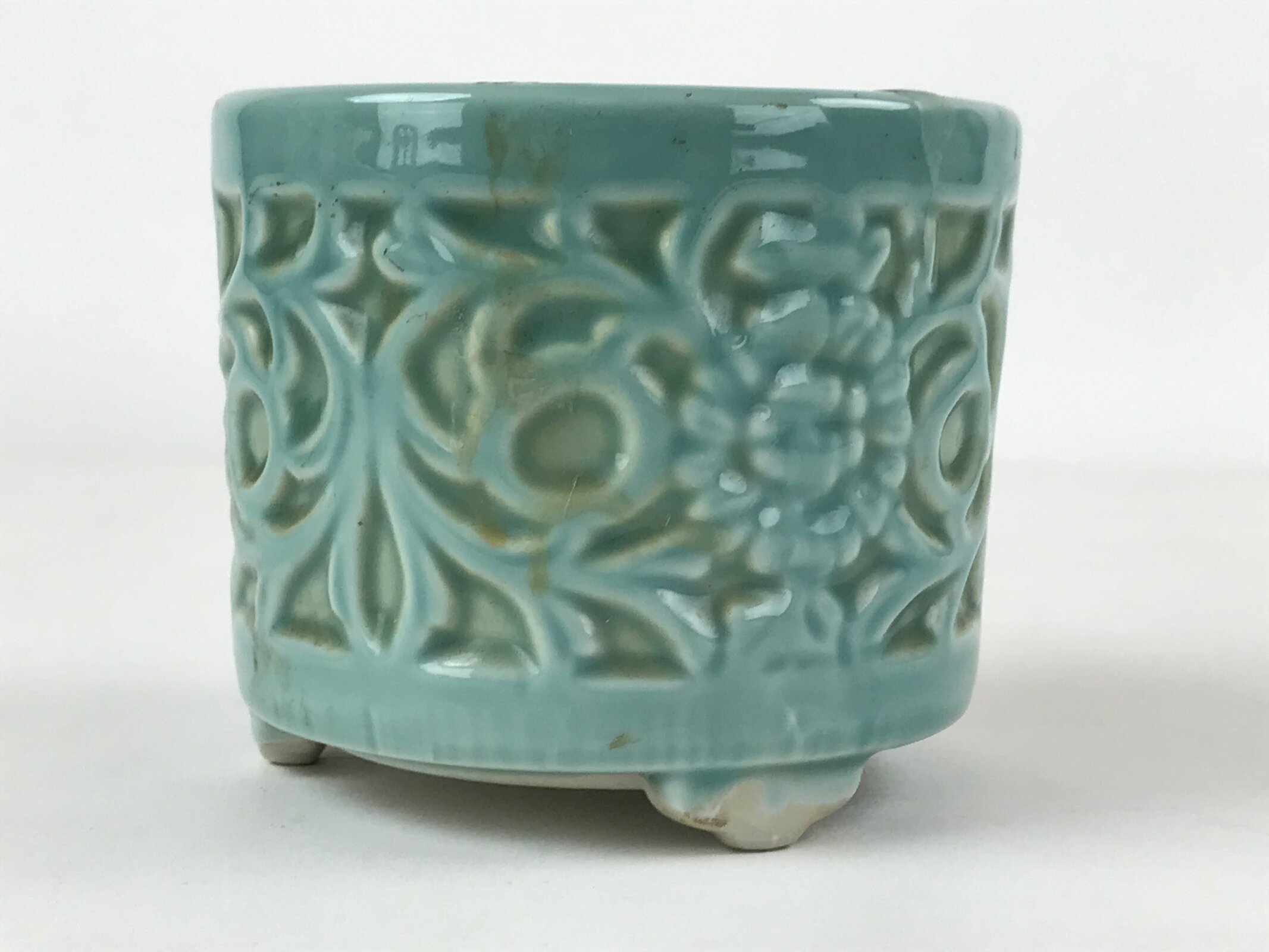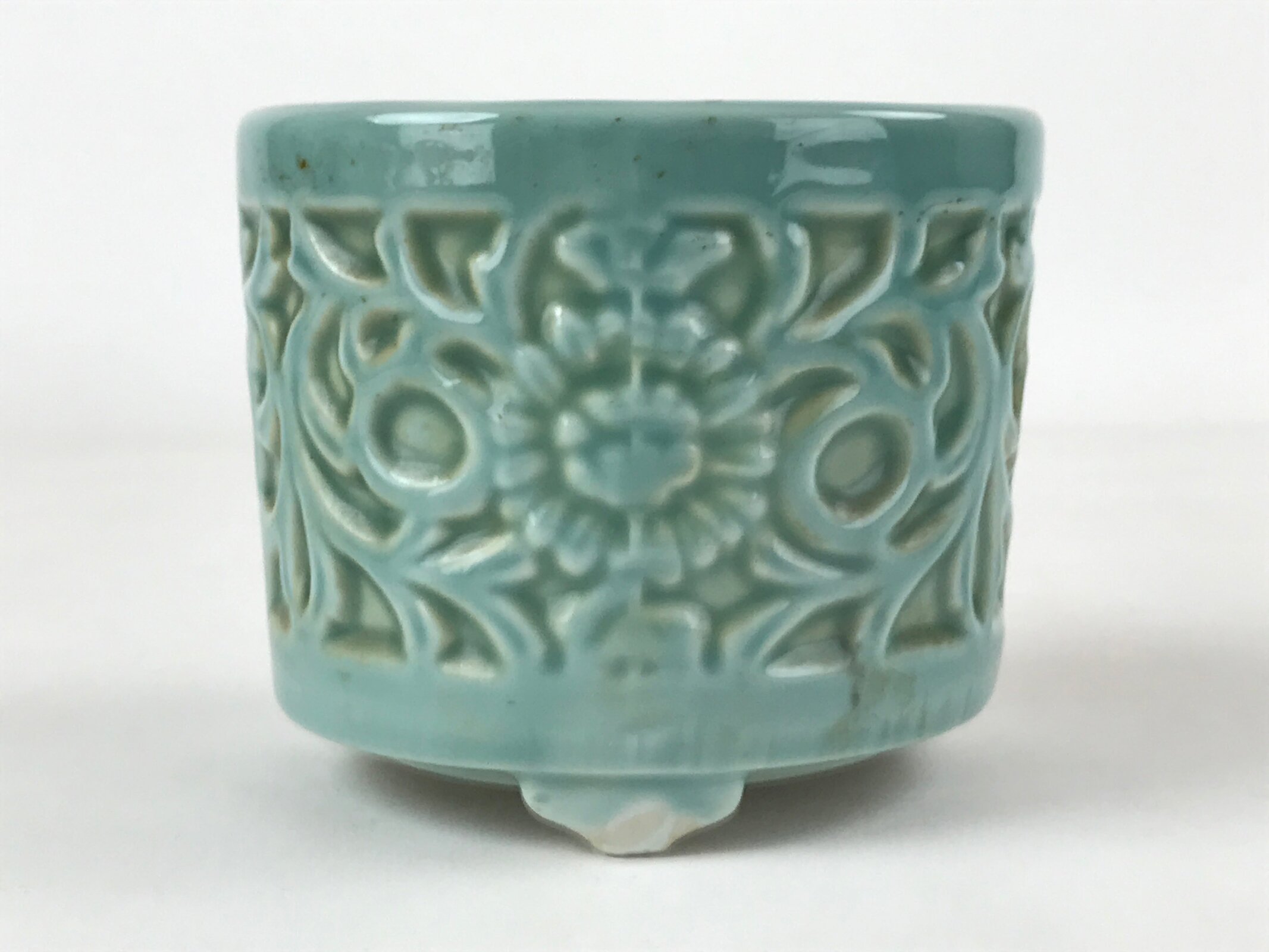 This item is a vintage porcelain incense burner (koro) made for use as an altar fitting in a Japanese Buddhist altar. It has a light green glaze with a floral and vine design. This type of burner is used for burning incense powder or sticks.