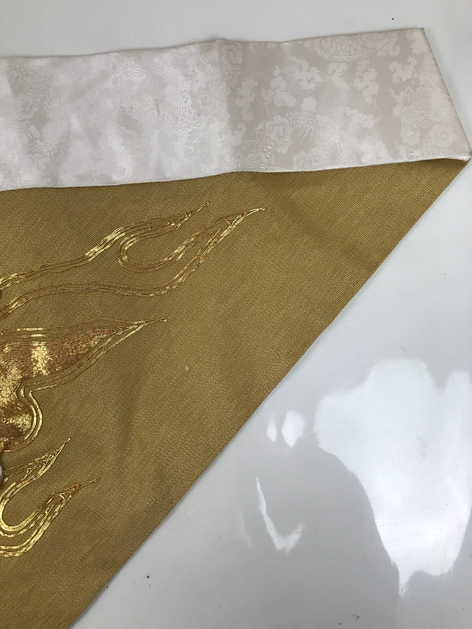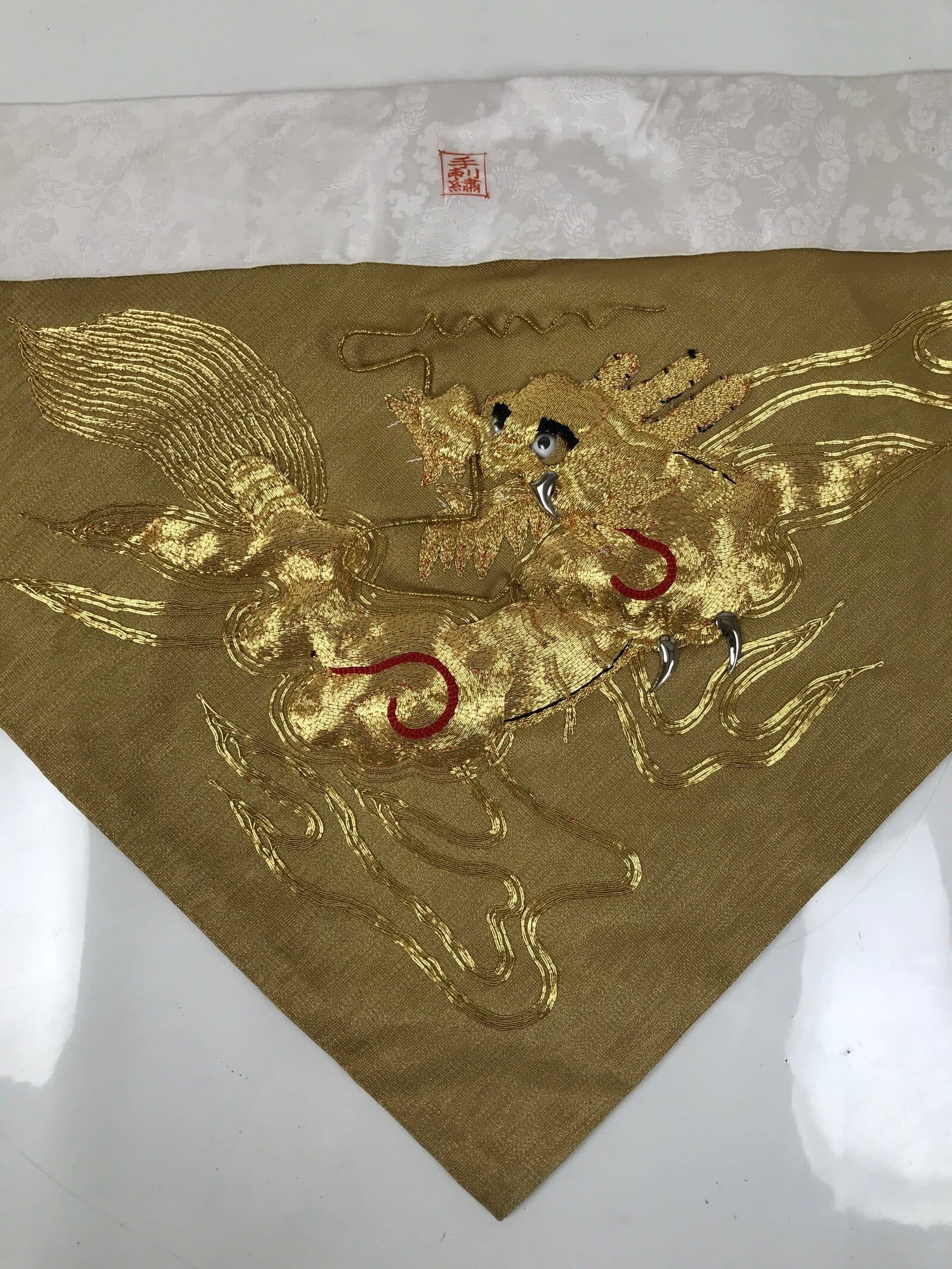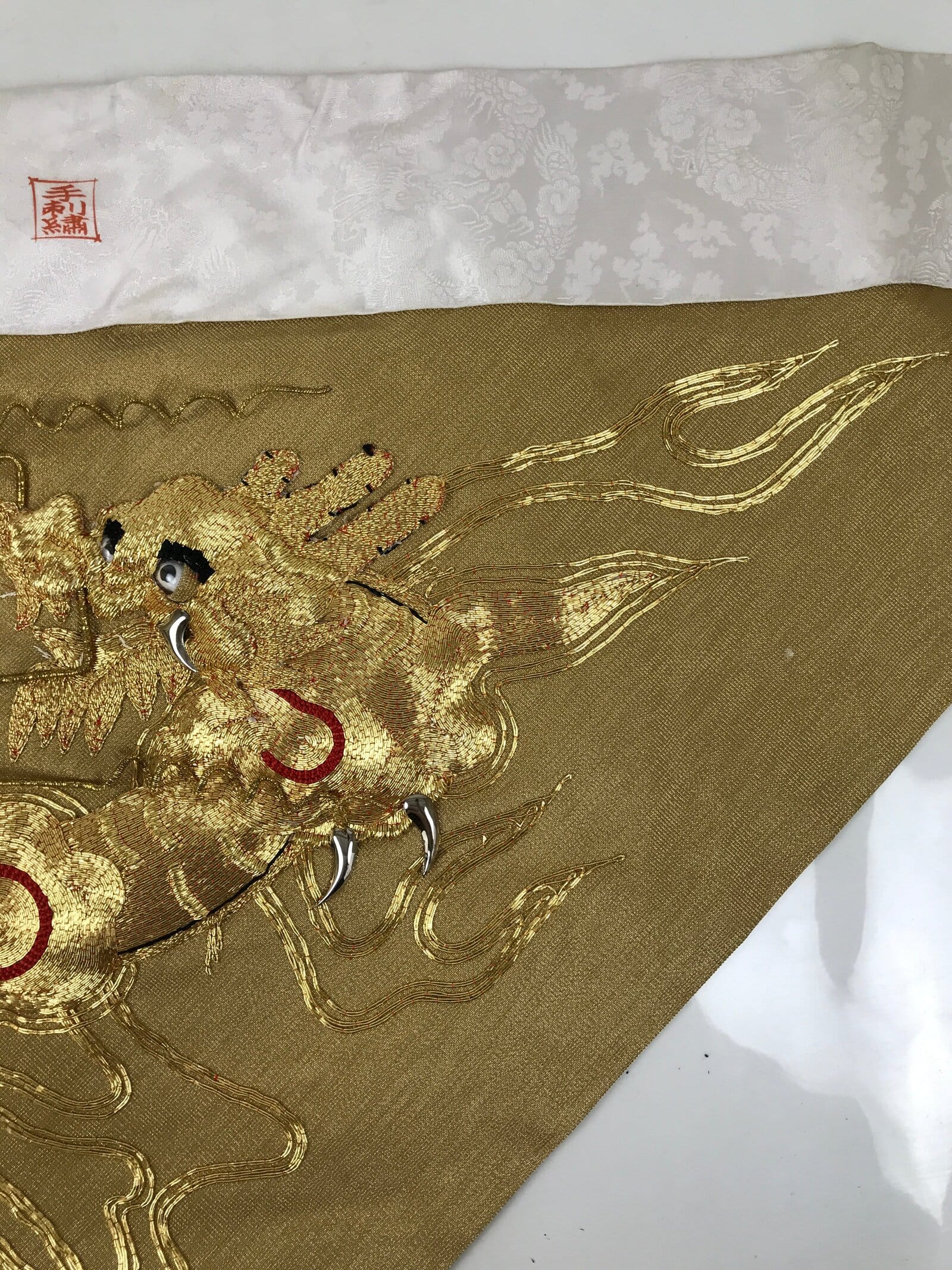 This is a vintage Japanese Buddhist altar tablecloth or uchishiki. Made of silk, the backside and the top border are white with a subtle dragon and cloud pattern, while the front side is gold with a grand gold embroidered dragon with resin eyes and claws.