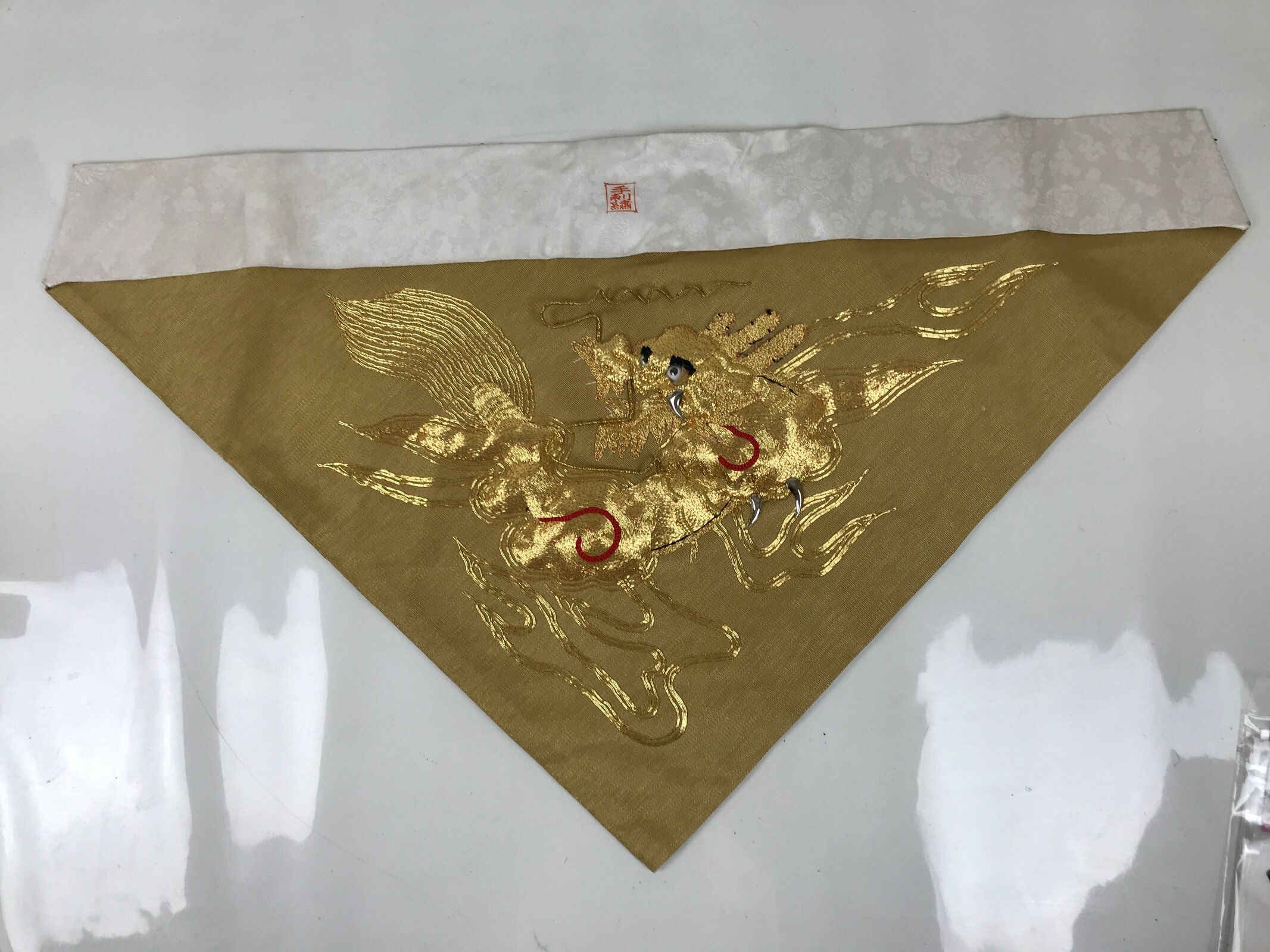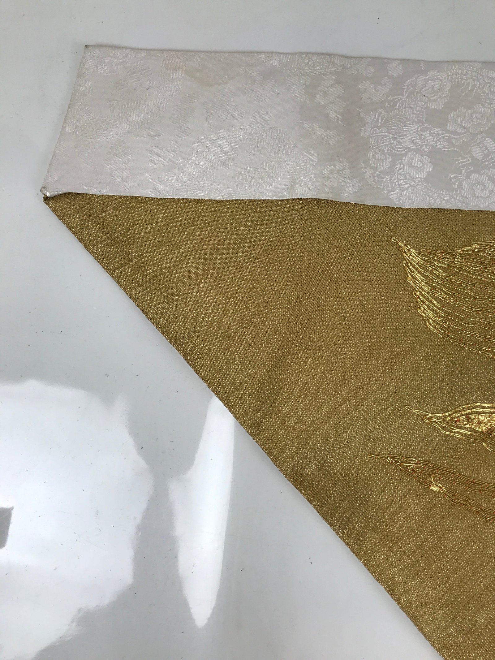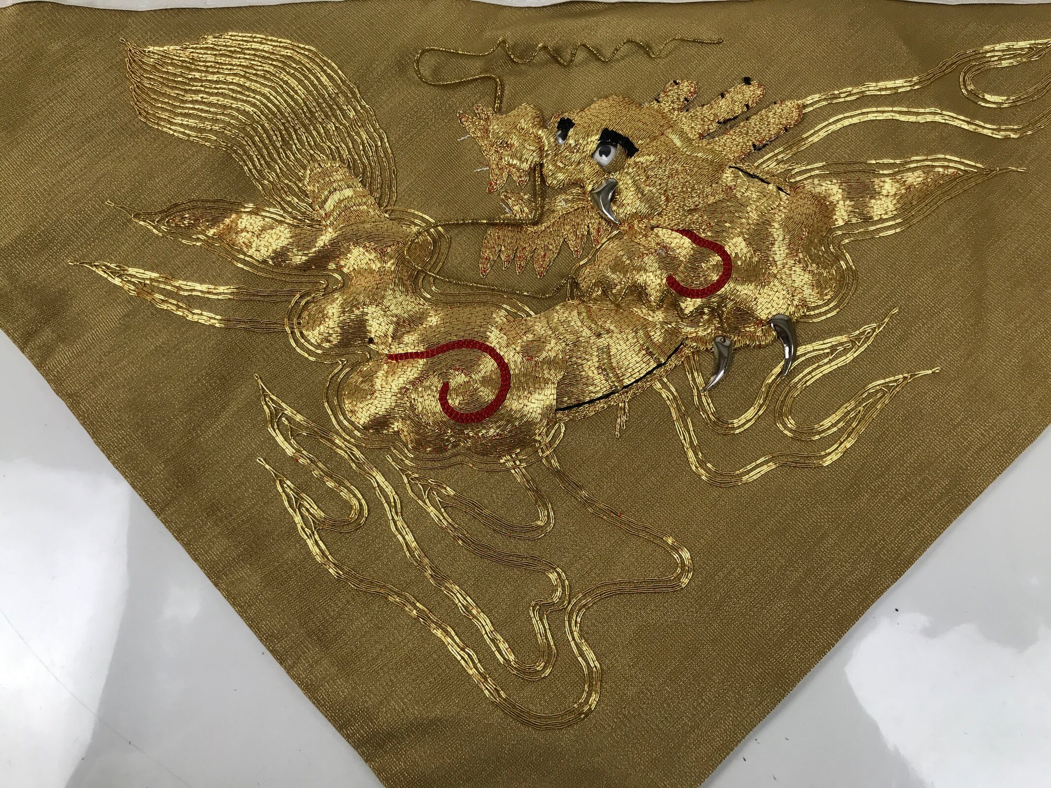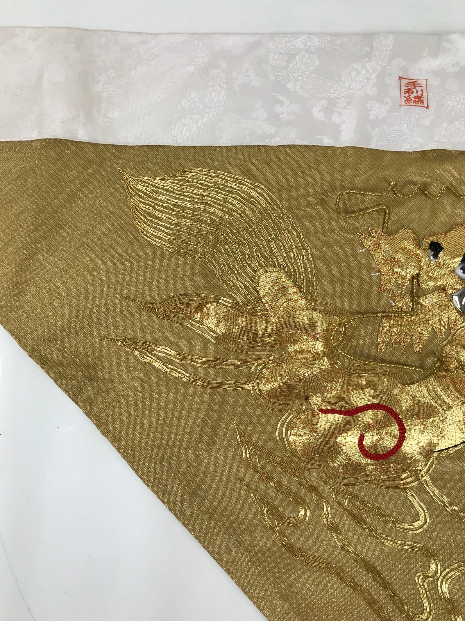 This is a vintage Japanese Buddhist altar tablecloth or uchishiki. Made of silk, the backside and the top border are white with a subtle dragon and cloud pattern, while the front side is gold with a grand gold embroidered dragon with resin eyes and claws.
