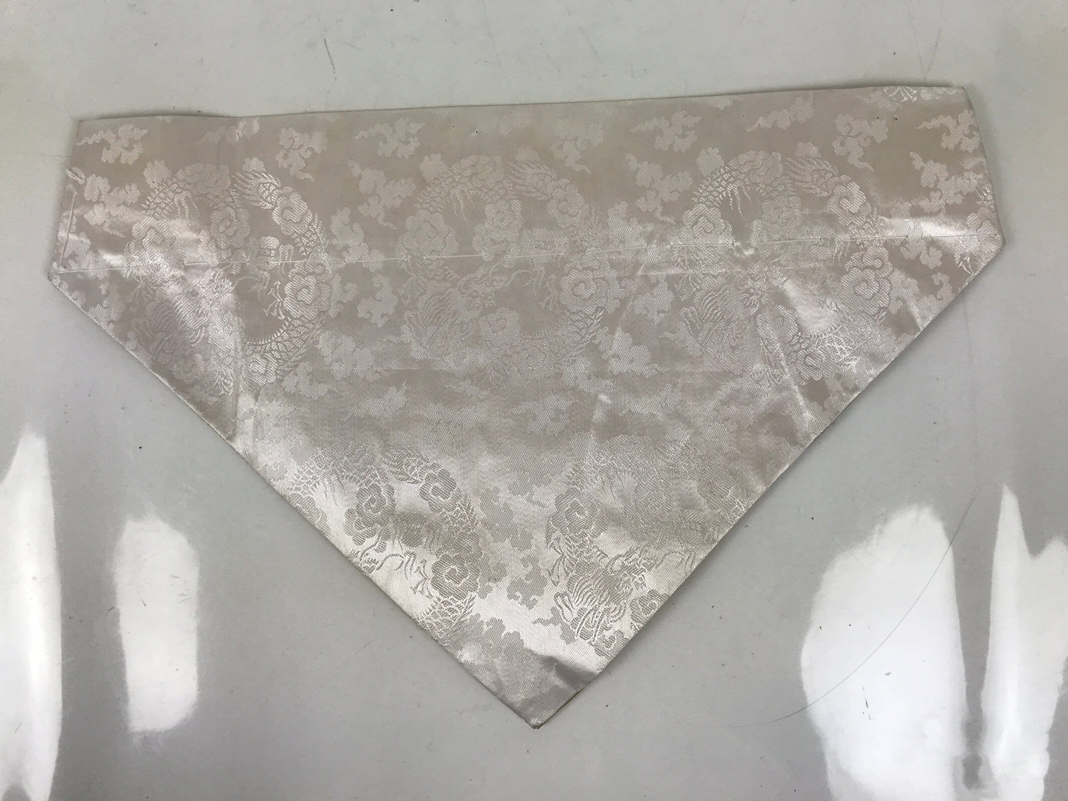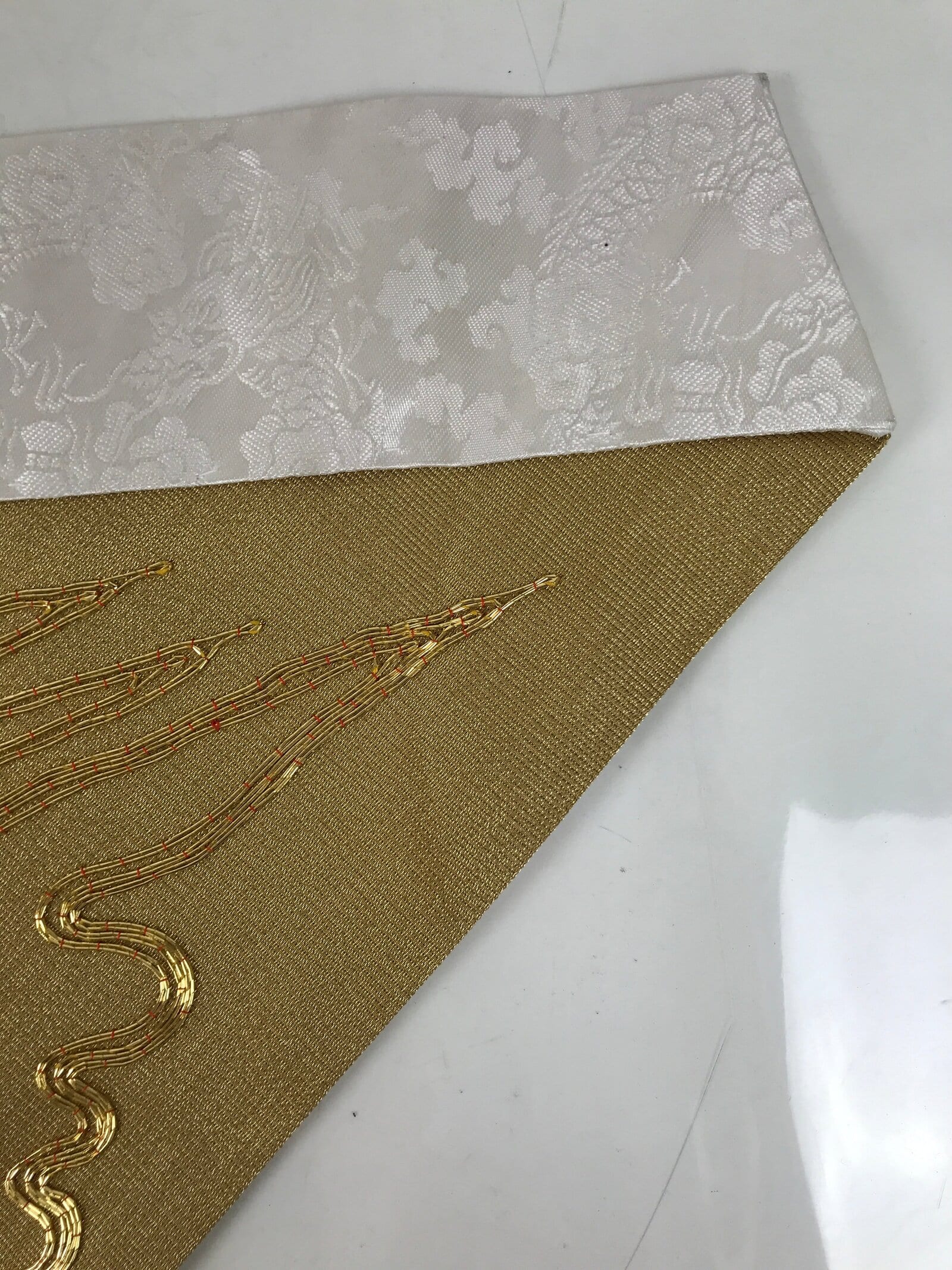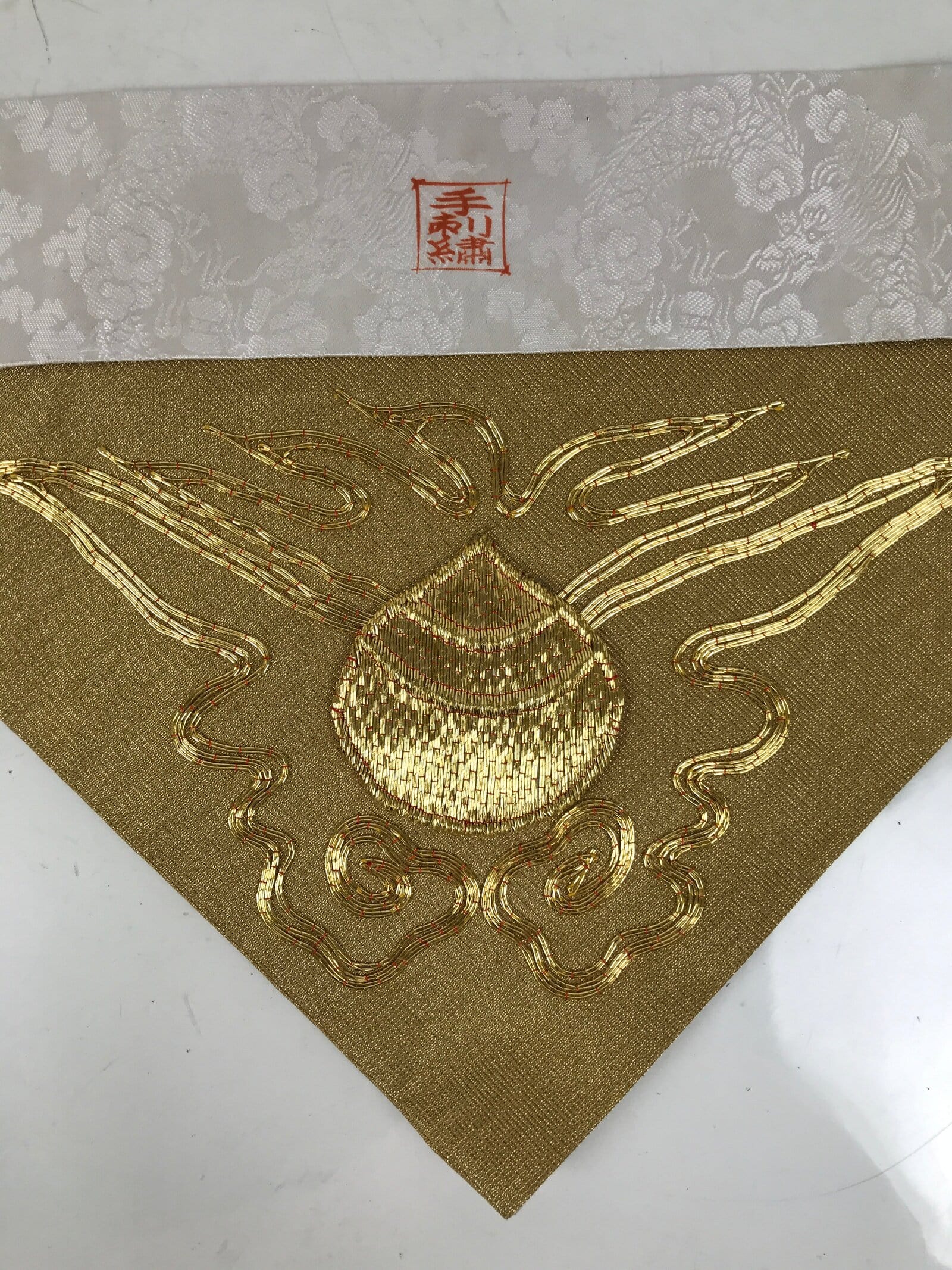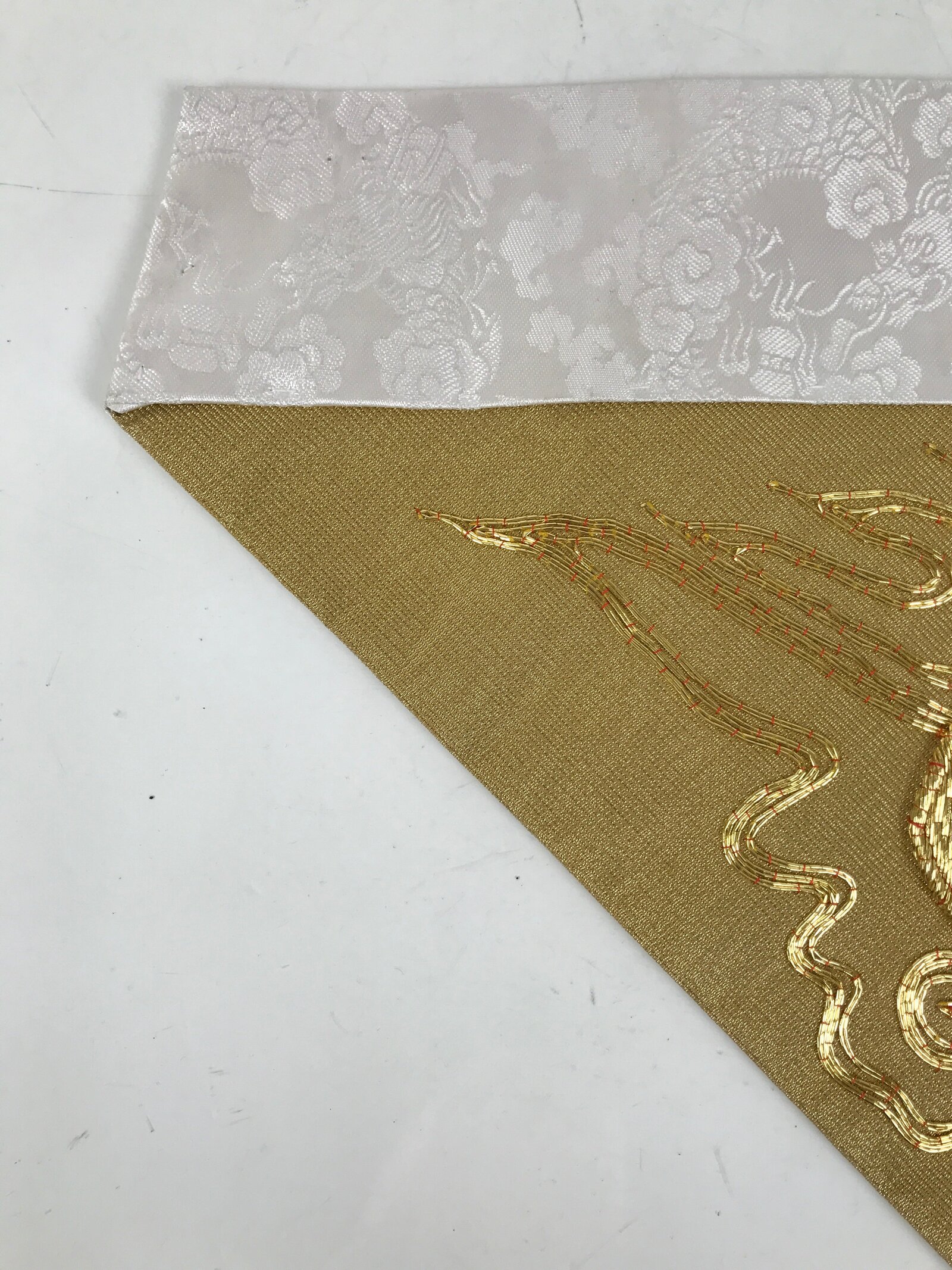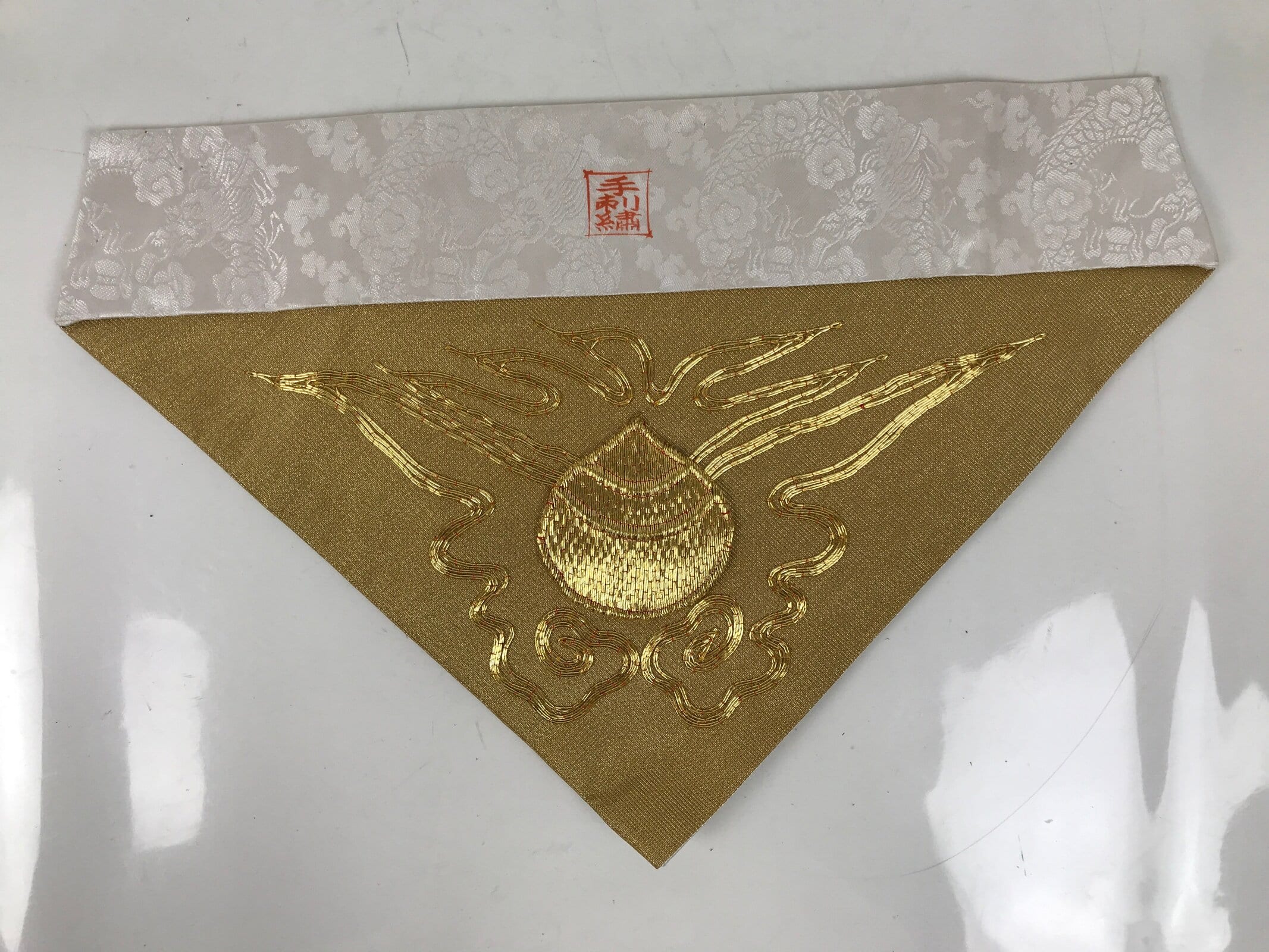 This is a vintage Japanese Buddhist altar tablecloth or uchishiki. Made of silk, the backside and the top border are white with a subtle dragon and cloud pattern, while the front side is gold with a gold embroidered houshu no tama flame commonly associated with Inari and fox spirits.