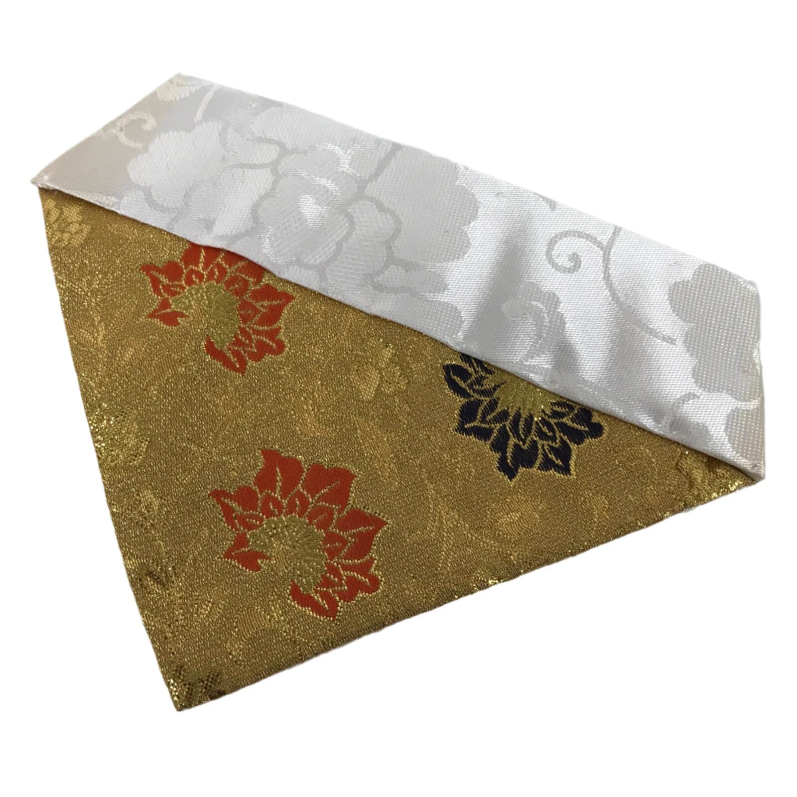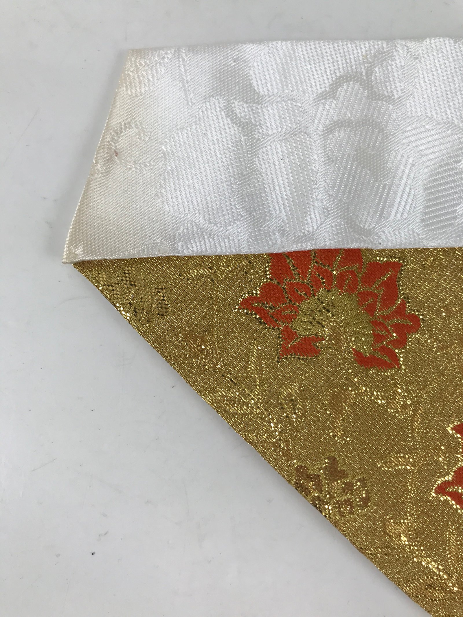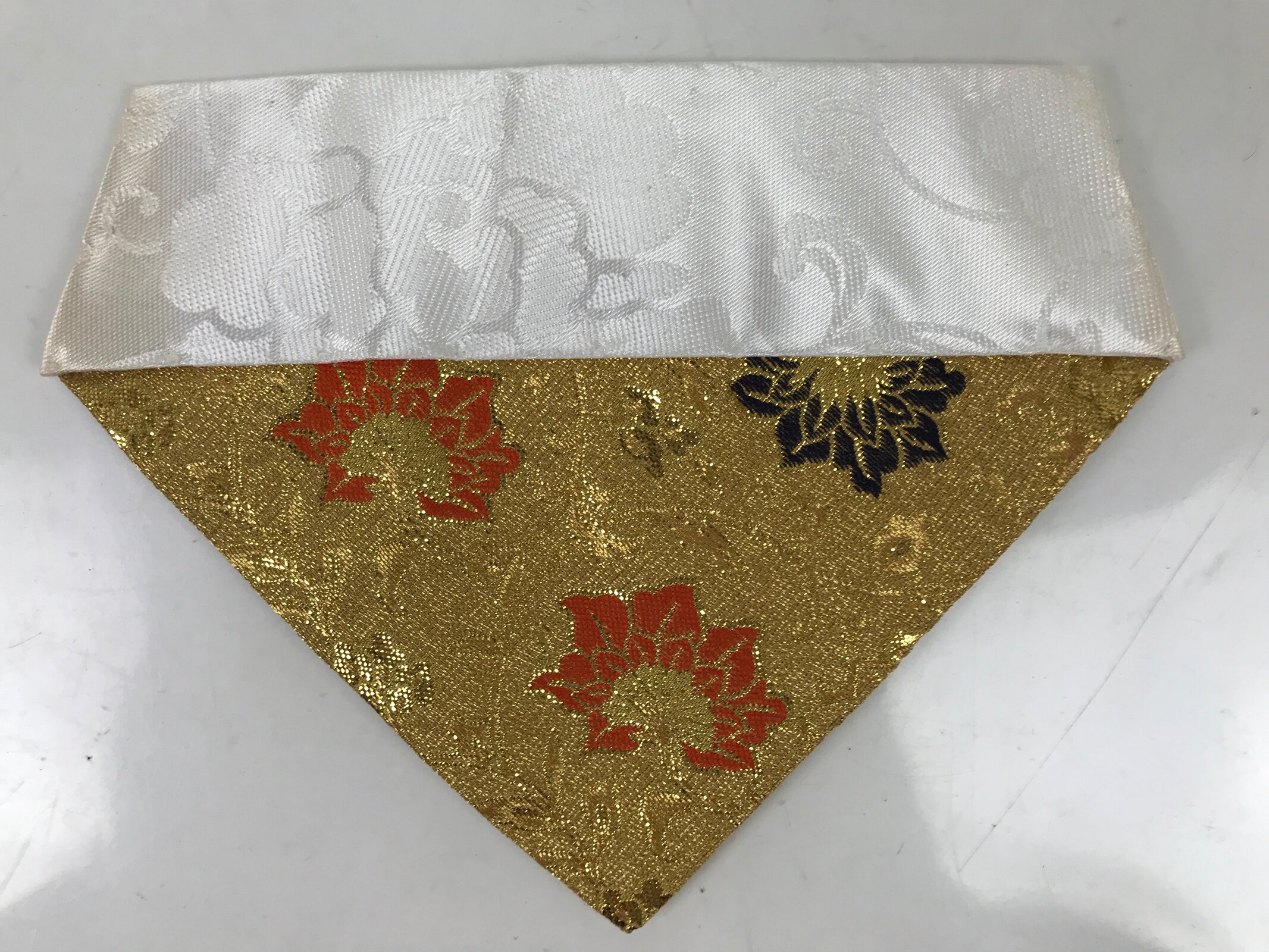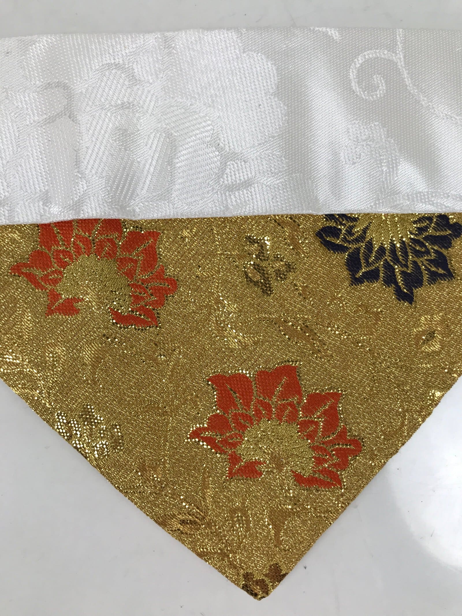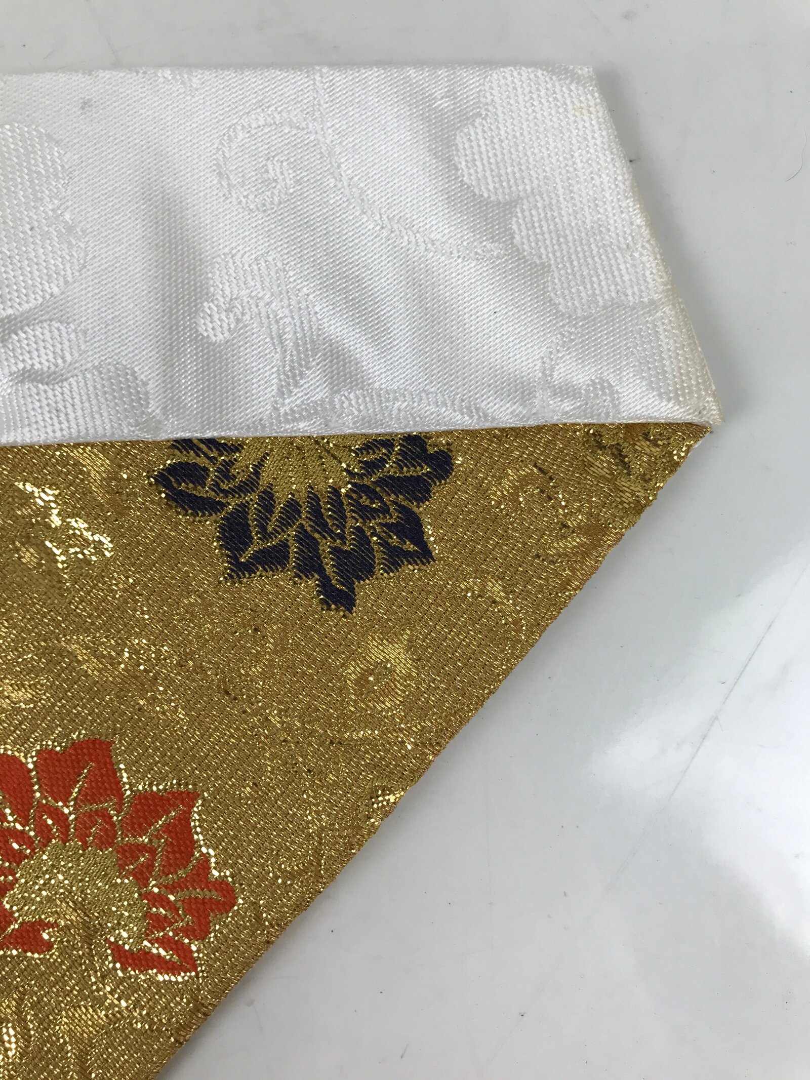 This is a vintage Japanese Buddhist altar tablecloth or uchishiki. Made of silk, the backside and the top border are white with a large peony pattern, while the front side is a glittering gold color with navy blue and orange floral accents.