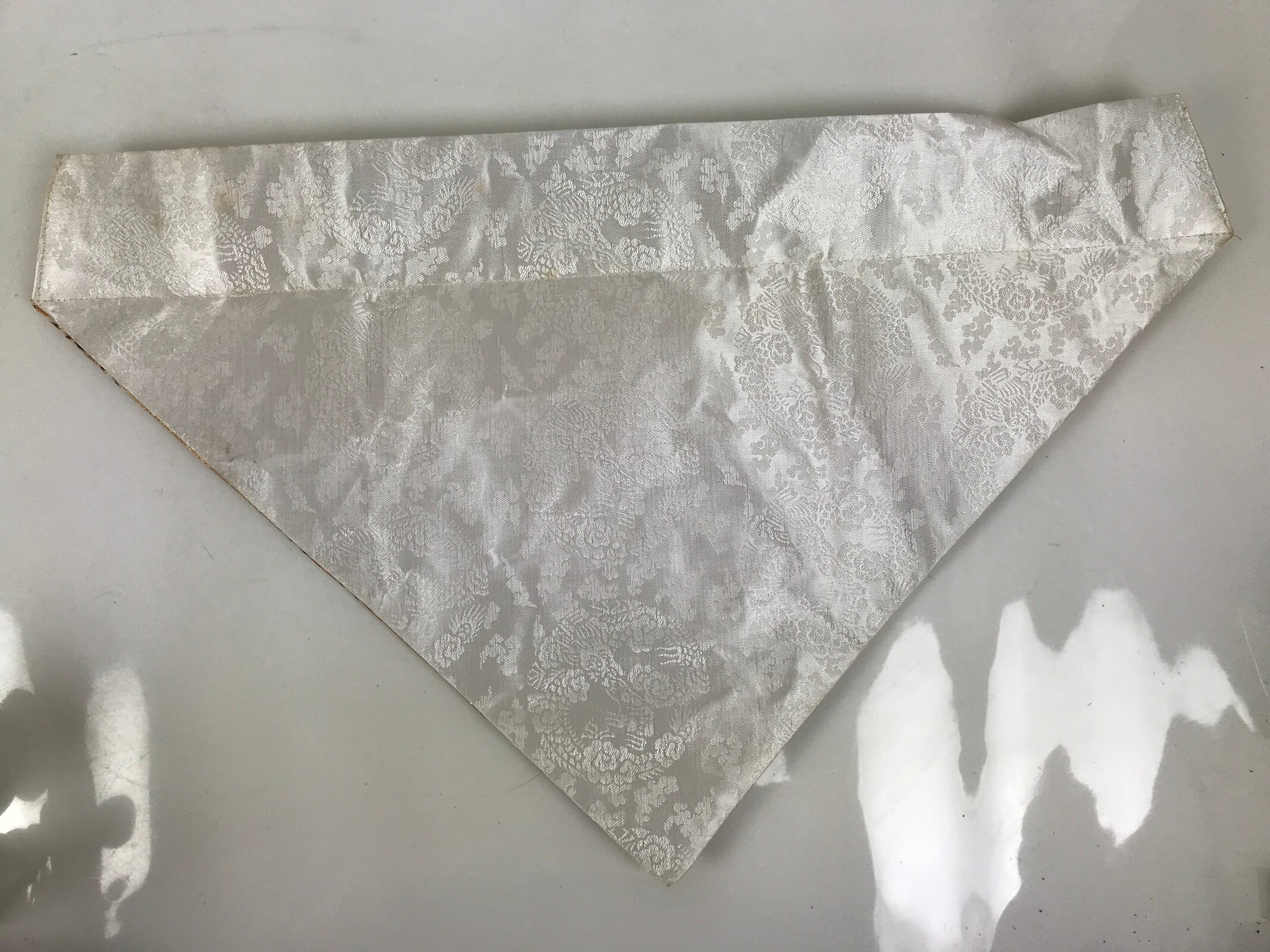 This is a vintage Japanese Buddhist altar tablecloth or uchishiki. Made of silk, the backside and the top border are white with a subtle dragon and cloud pattern, while the front side is embroidered with brilliant gold and features red and green mandalas.