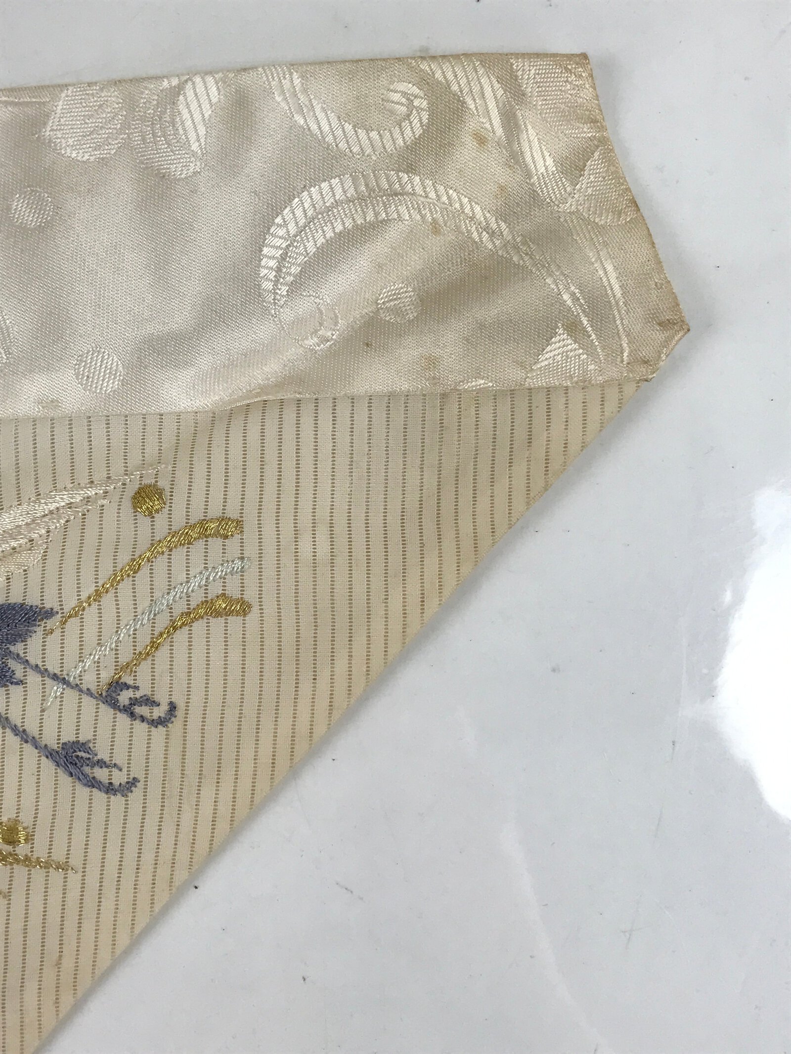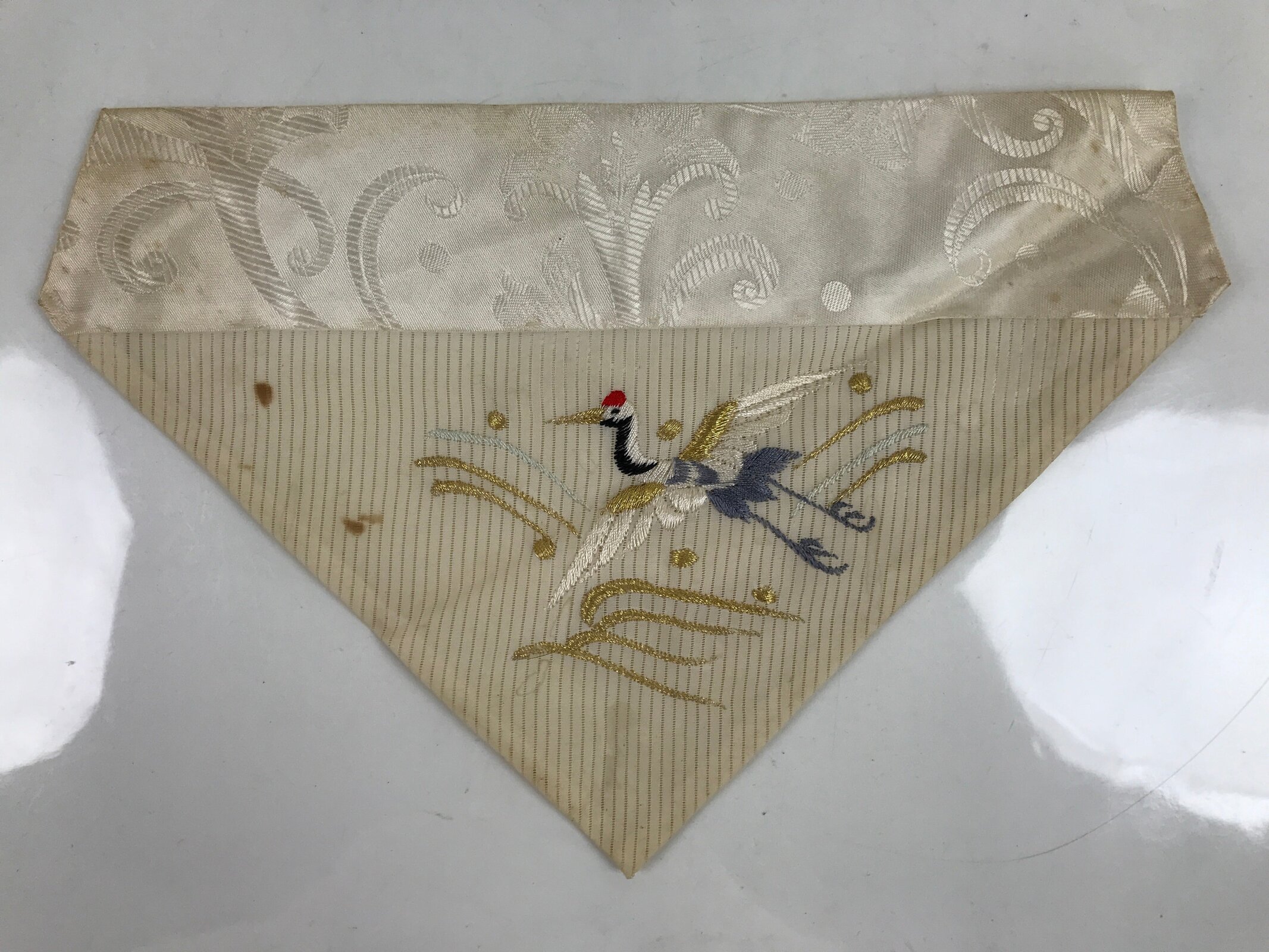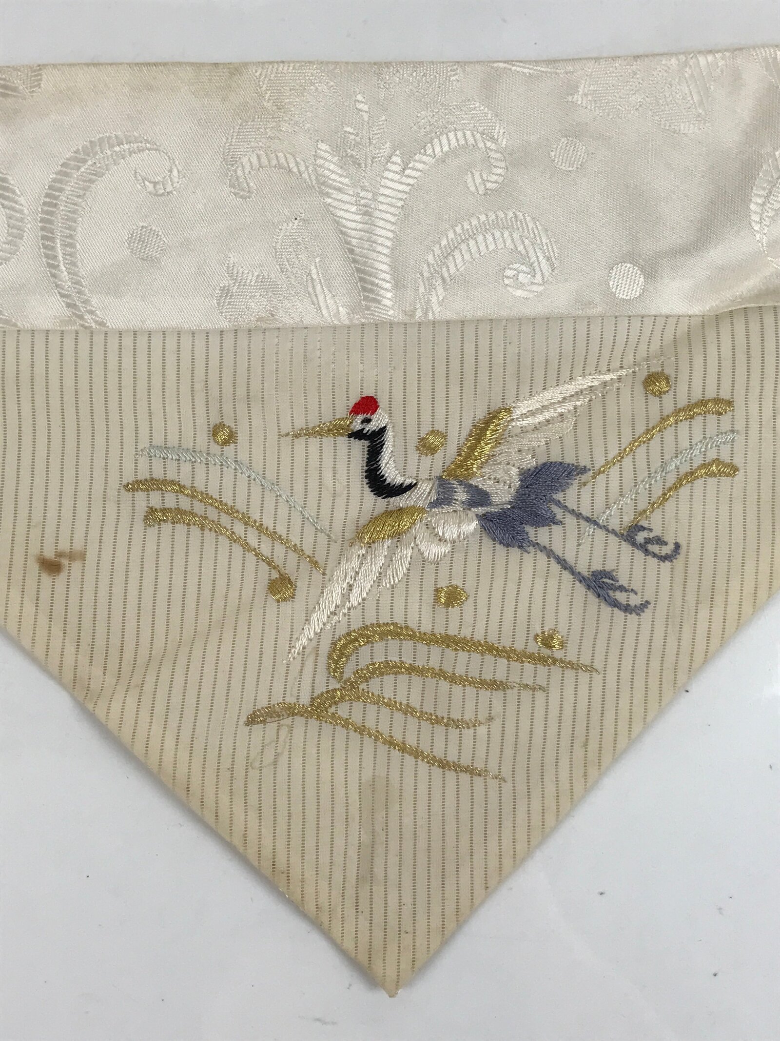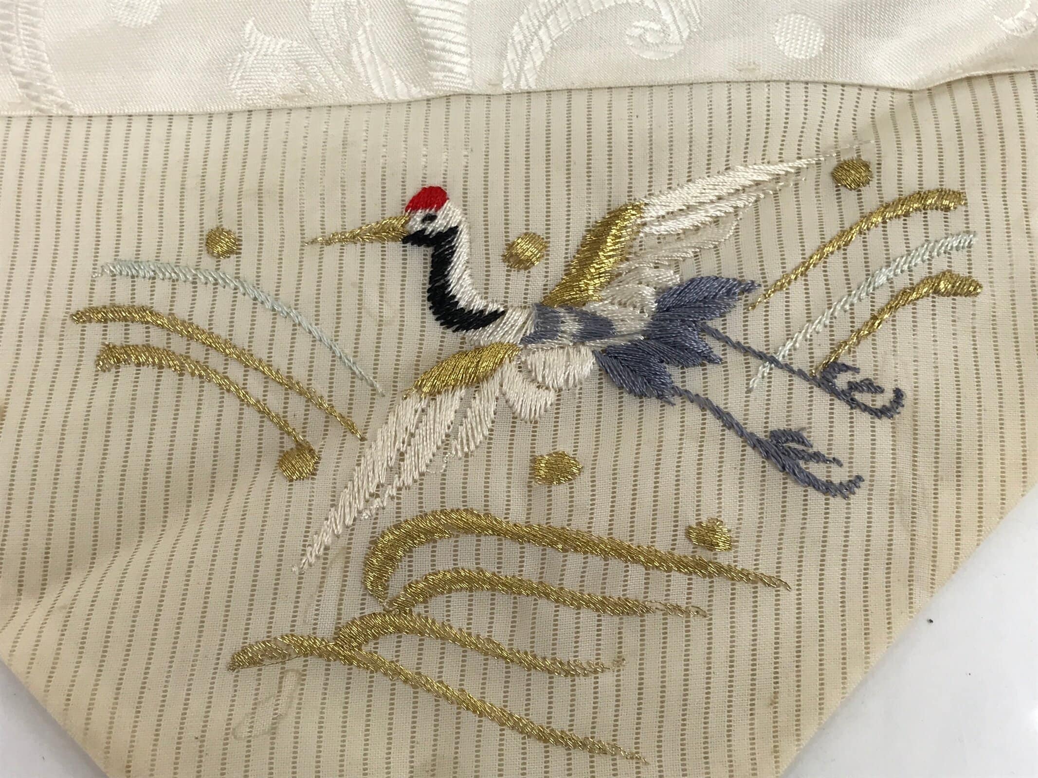 This is a vintage Japanese Buddhist altar tablecloth or uchishiki. Made of silk, the backside is white with a floral pattern, while the front side is white with red, gold, gray and black that features crane over the wave.