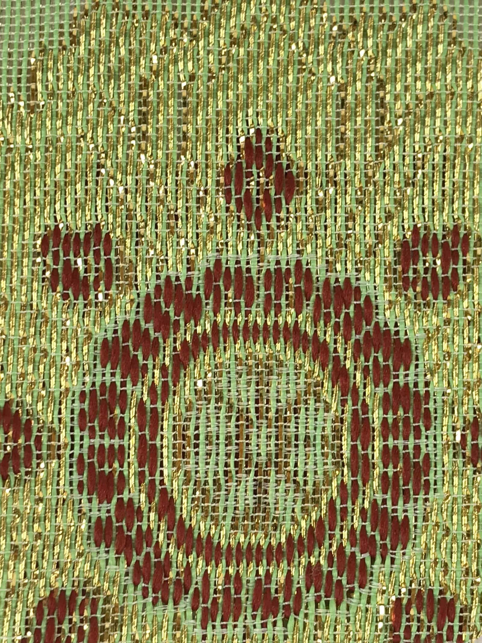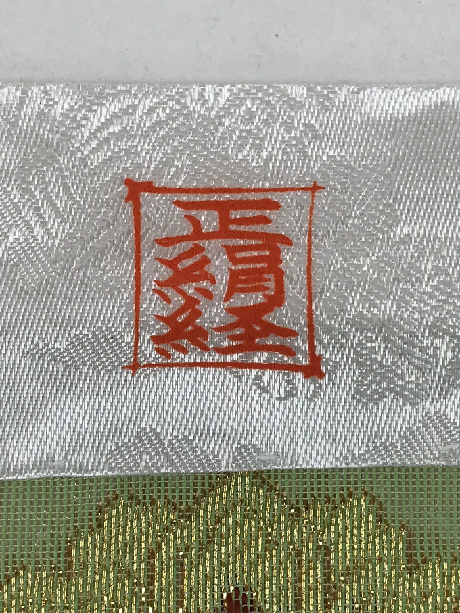 This is a vintage Japanese Buddhist altar tablecloth, or uchishiki. Made of silk and other woven fabric, the backside is white with a floral pattern while the main part is a green with an embroidered yellow and red flower. It has kanjis printed on the top.