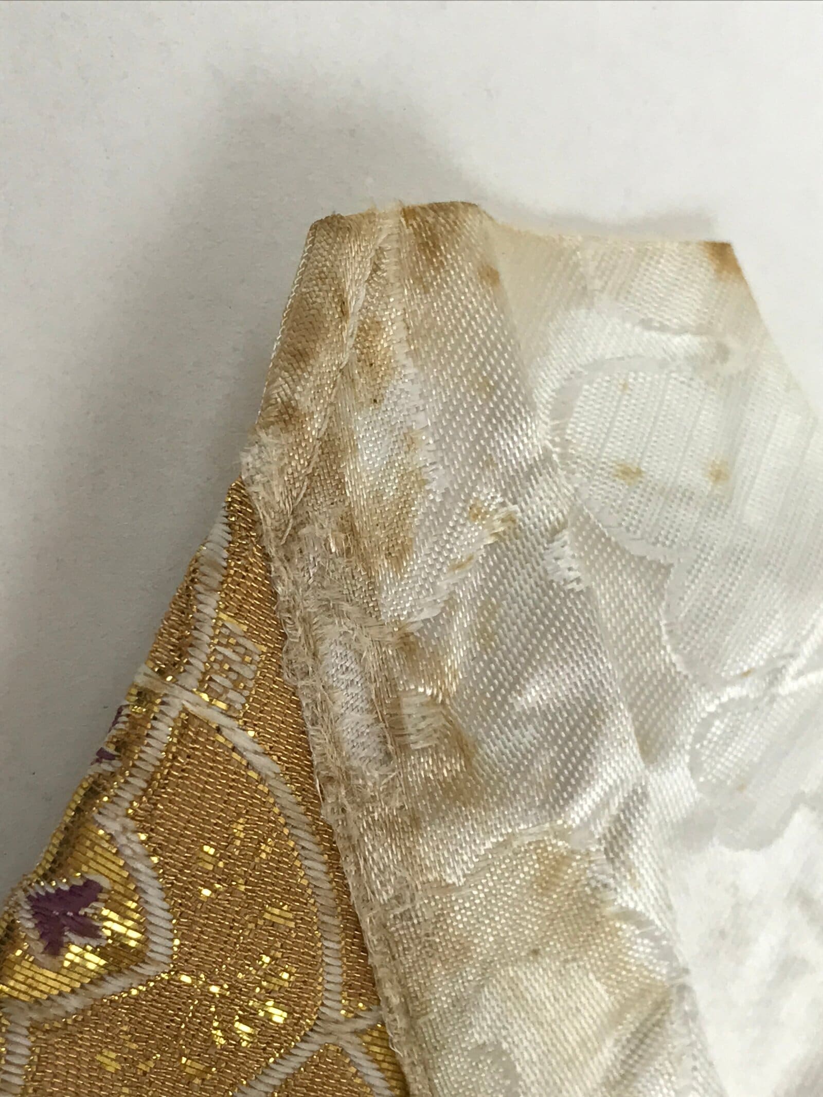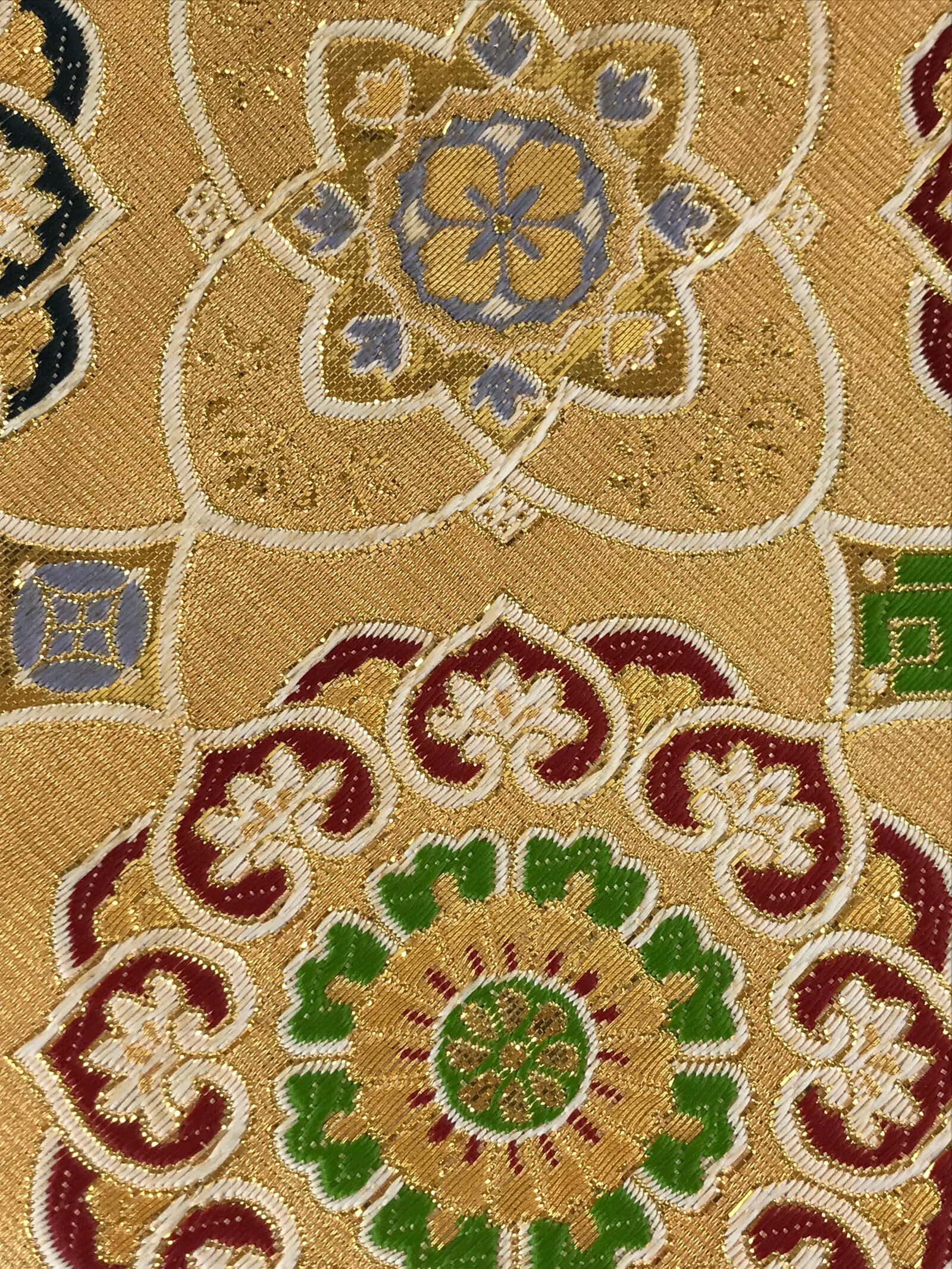 This is a vintage Japanese Buddhist altar tablecloth, or uchishiki. Made of silk and other woven fabric, the backside is white with a big floral pattern while the main part is gold with embroidered flowers.